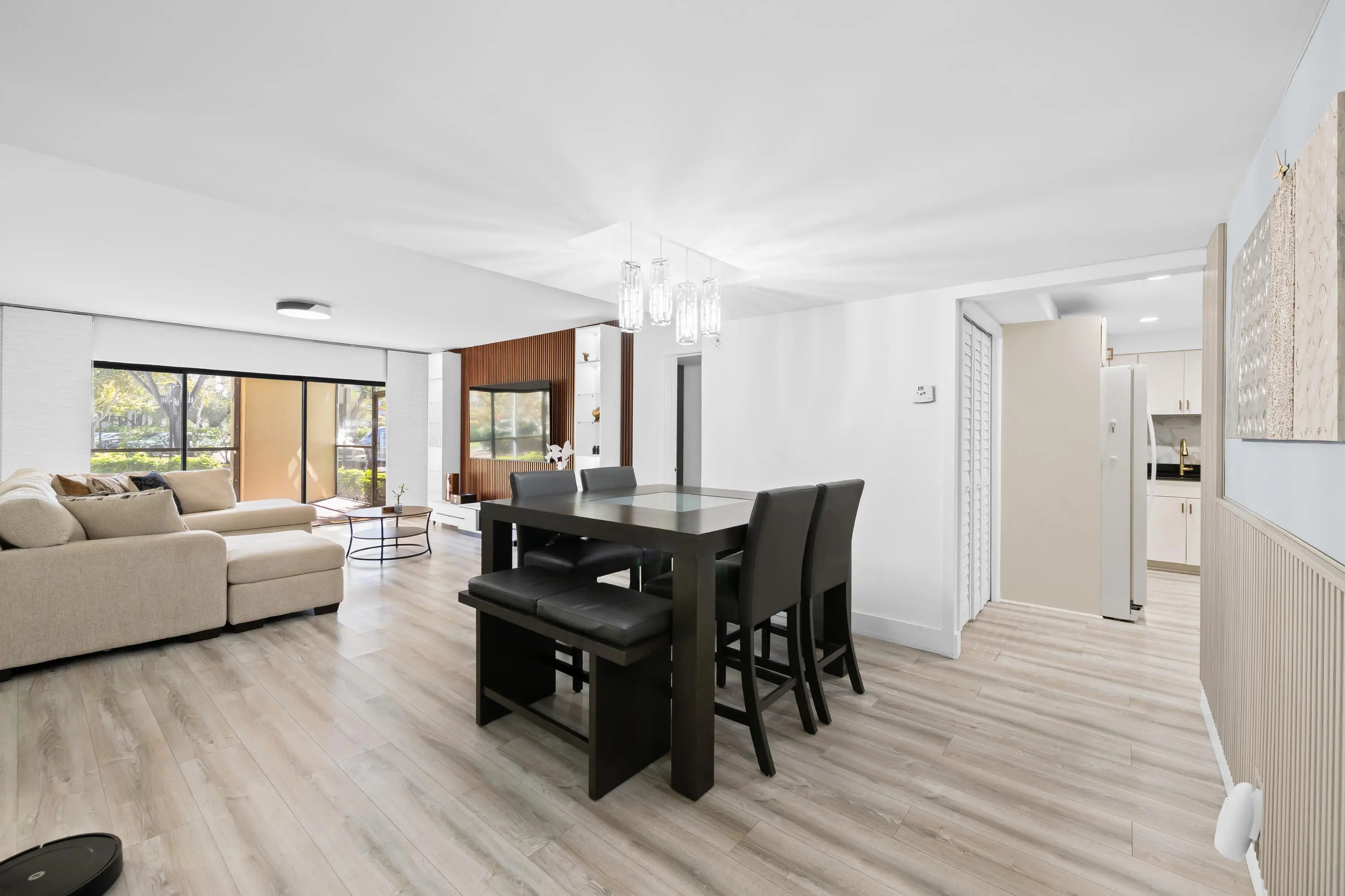 This is a fully renovated condo showcasing sophisticated modern elegance. The living room features a striking slatted media wall with matching focal details in the entryway and dining room. Three updated bathrooms add a fresh, streamlined touch. Bright accents of the kitchen flow seamlessly into the living room, a contemporary space perfect for entertaining. Enjoy a spacious screened-in patio ideal for outdoor relaxation. Includes membership to Bonaventure Town Center Club with many amenities: fitness rooms, heated pools, sauna, tennis, bowling, basketball, racquetball, mini golf, game room, theater, playground and more. Maintenance covers water, cable, high speed internet, trash and insurance. In-unit washer/dryer, assigned parking, passed inspection and strong reserves! A-rated schools! Club hours: Monday-Friday: 6 AM - 10 PM Saturday: 7 AM - 9 PM Sunday: 7 AM-6PM. Rental restriction - Must own for 2 years. Pets are welcome! All information herein is deemed accurate but subject to errors and omissions. Buyers to verify all information.