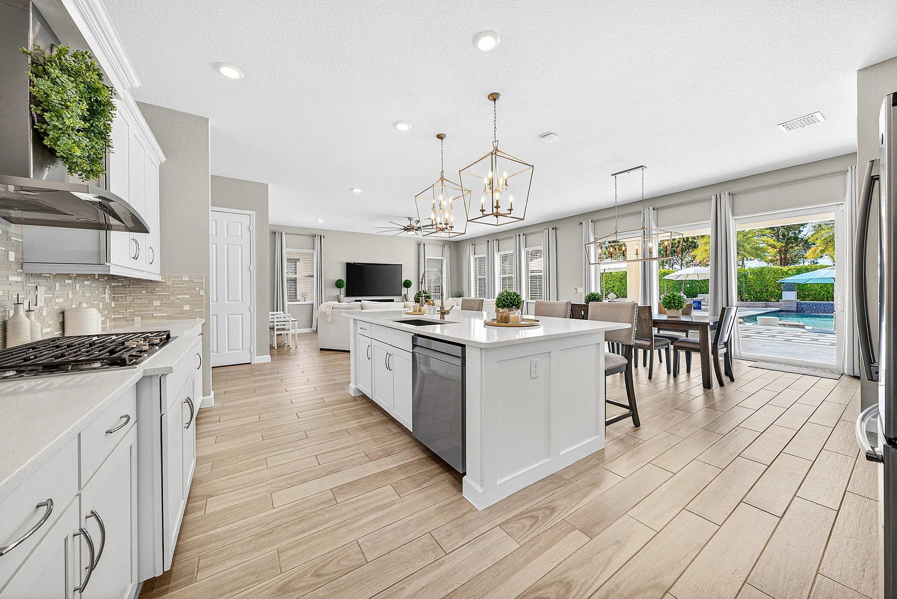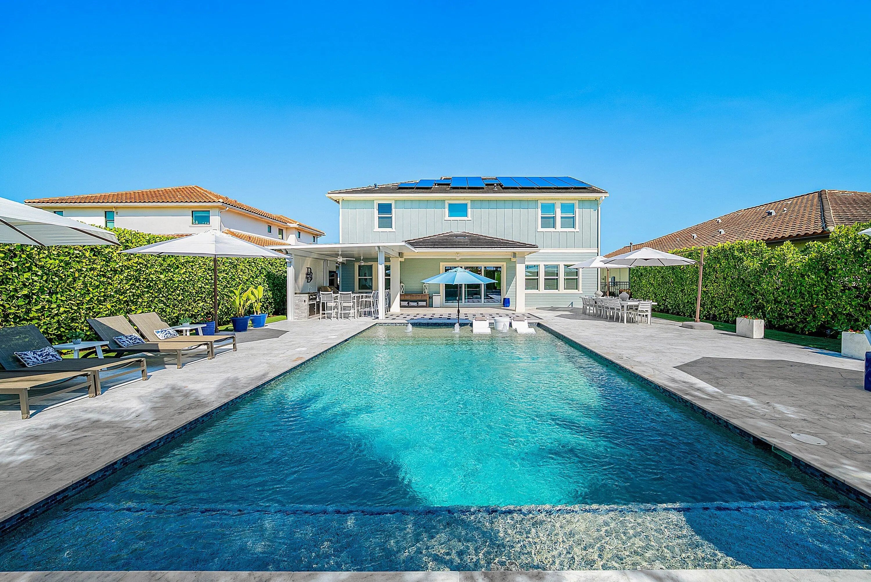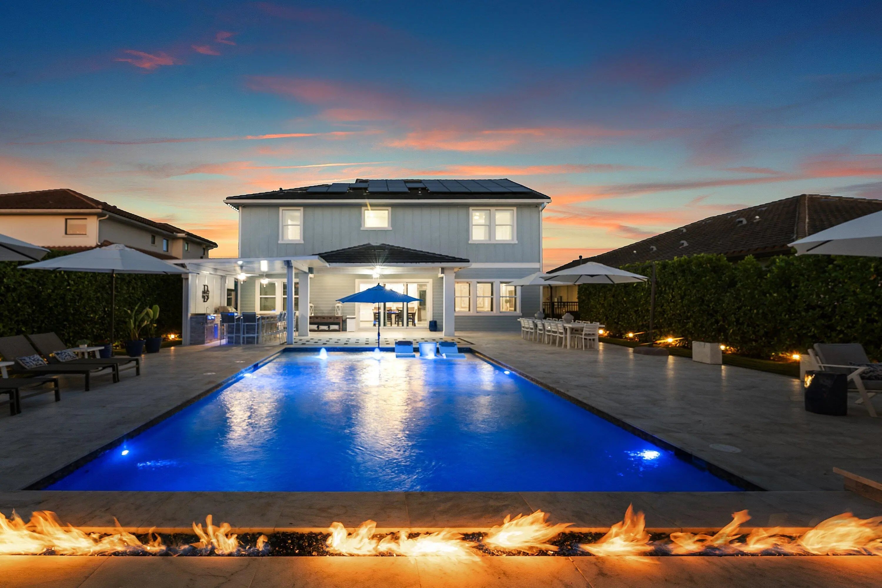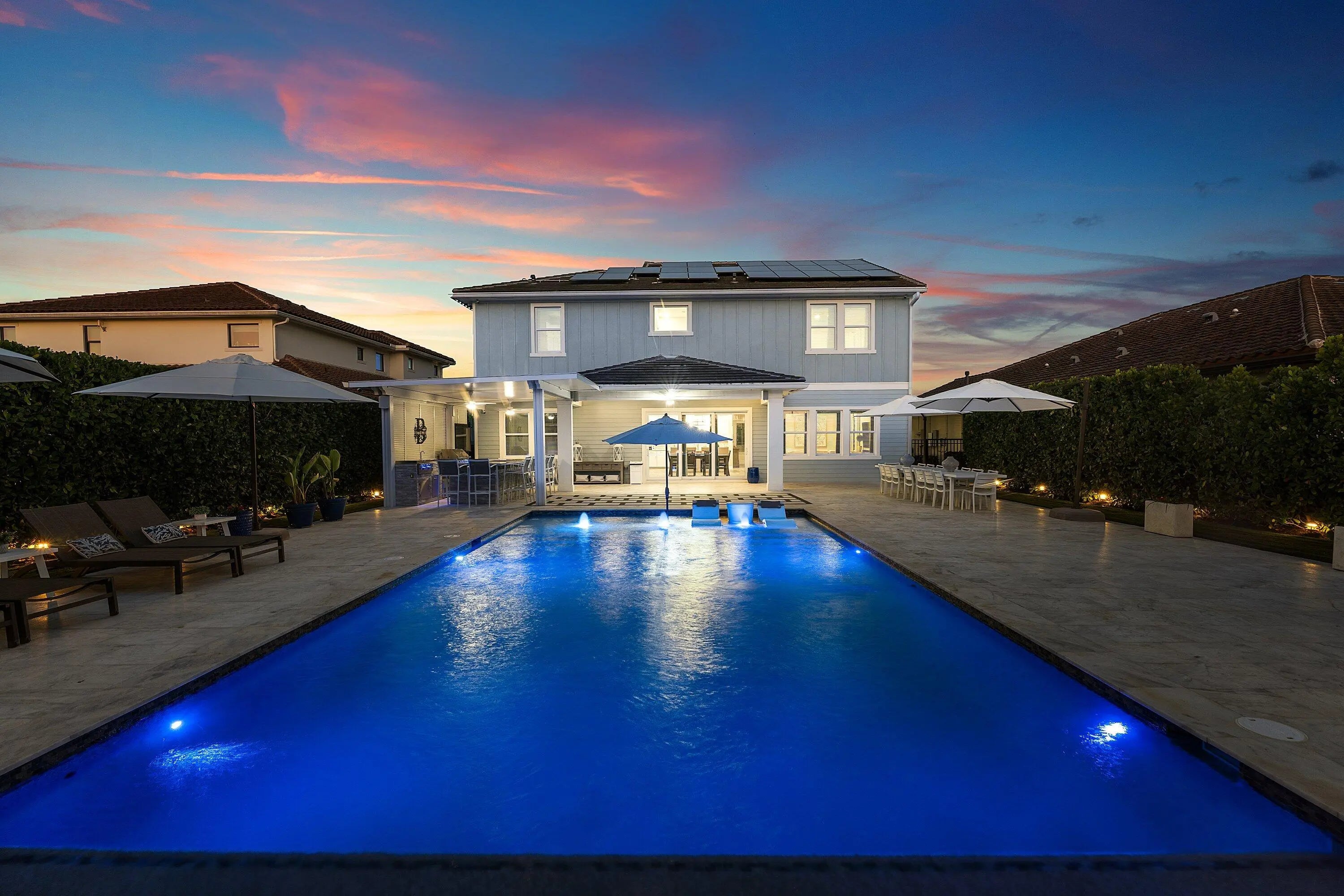 Welcome to this highly upgraded Lennar Chelsea model in the award winning Arden community, offering 5 bedrooms, 4 bathrooms, and 3,361 square feet under air. This beautiful home features upgraded flooring throughout with no carpet, an upgraded gourmet kitchen, upgraded glass front door, upgraded stair railing, upgraded light fixtures, ceiling fans in all bedrooms, living room, and loft, custom closets, custom bathroom and office cabinetry, built in safes in the primary closet and office, camera system, and Ring alarm with door and motion sensors throughout. Step outside to a resort style backyard designed for both relaxation and entertaining, complete with a saltwater 40 x 20 pool featuring two sun shelves, bubblers, fire wall, autofill and auto drain, LED lights, and LED water sheers. The covered outdoor kitchen with pergola includes a natural gas grill, flat top grill, ice machine, sink, and two refrigerators. Additional exterior upgrades include solar panels, whole house generator, landscape lighting, permanent holiday lighting, SWAT mosquito system, gutters, privacy landscaping, side walkway, and a fully fenced yard. A rare opportunity to own one of Arden's most impressive Chelsea models with exceptional indoor and outdoor living.