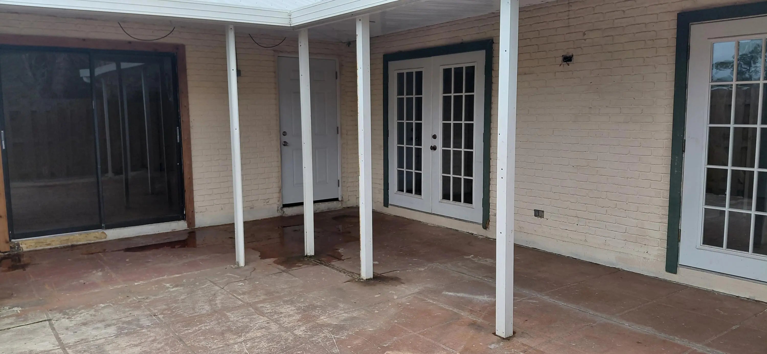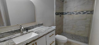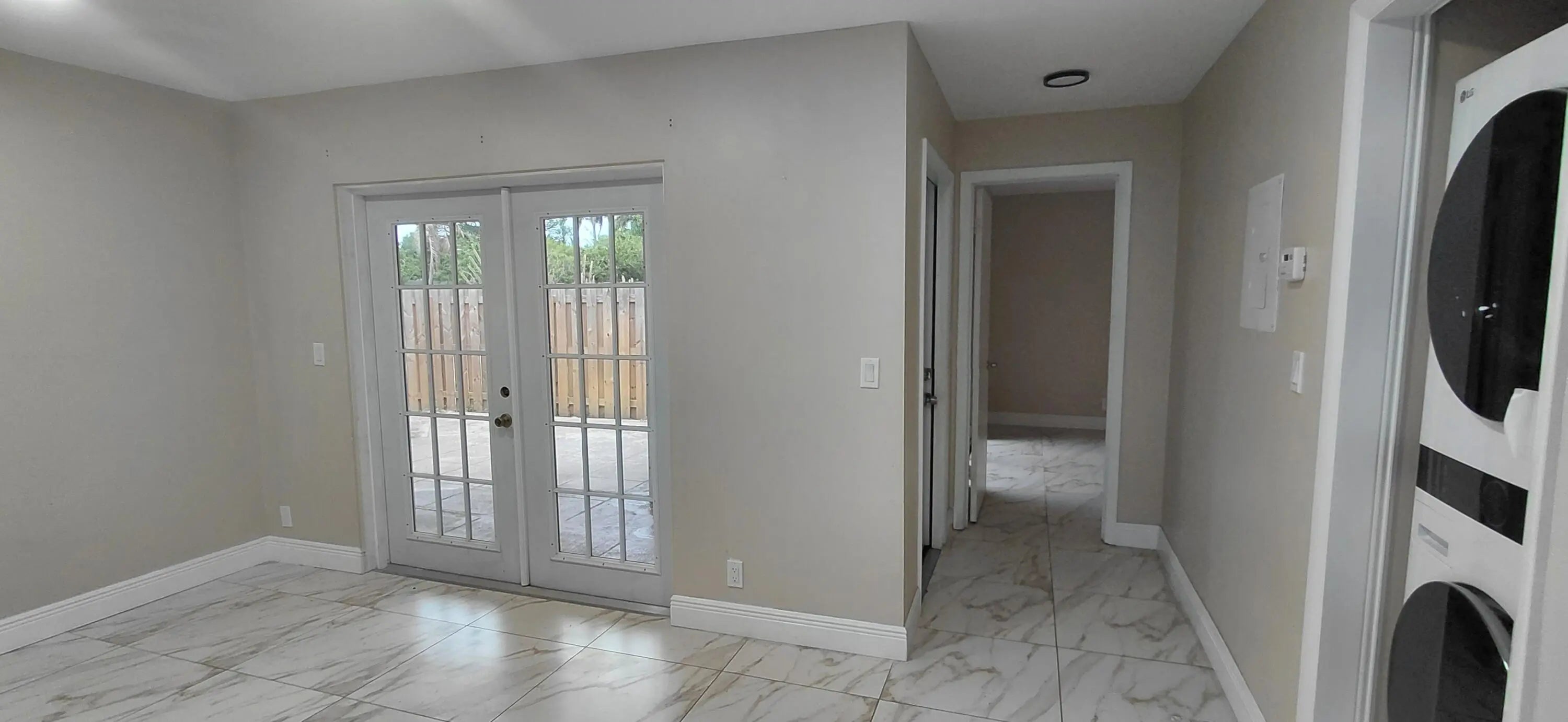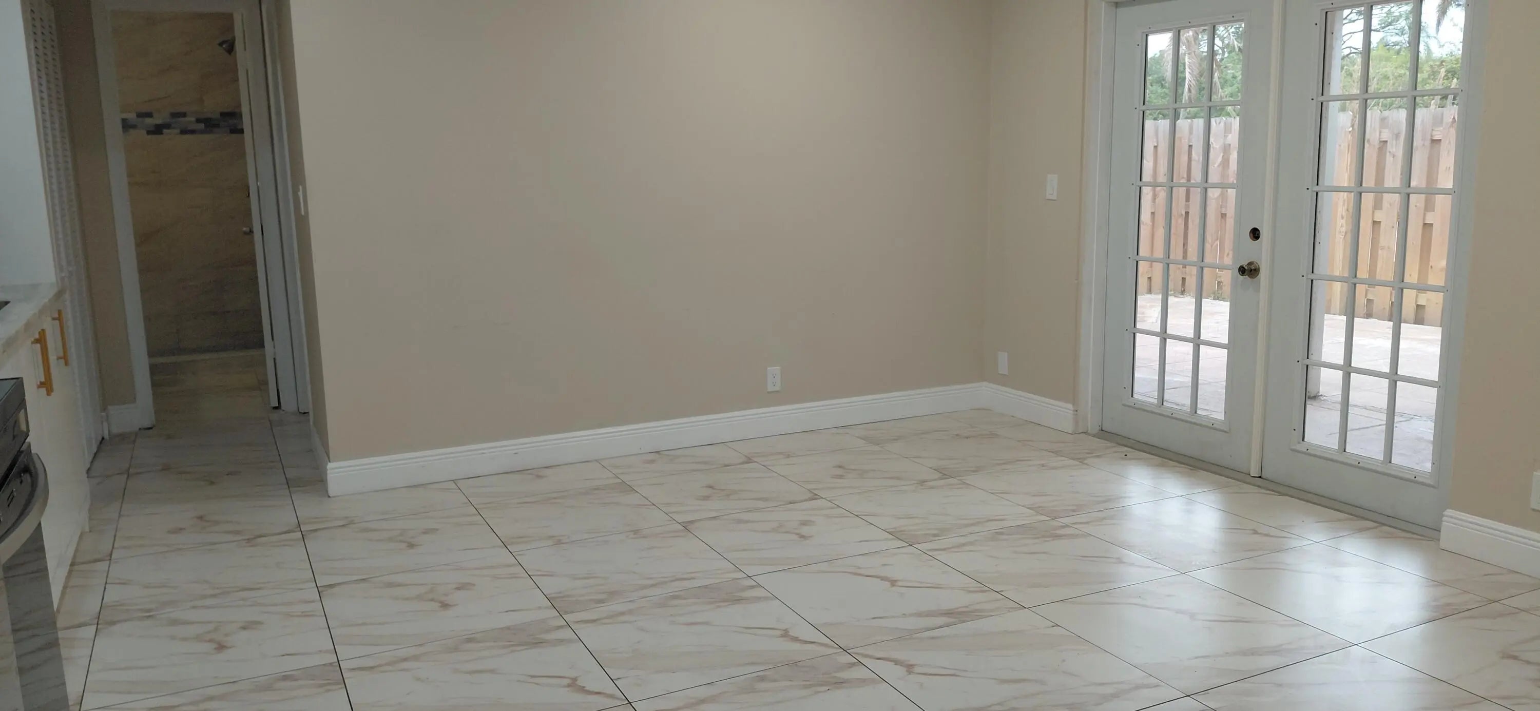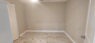 Unique and beautifully remodeled unit featuring brand-new appliances including washer/dryer, A/C, and water heater. Upgraded kitchen with marble countertop, bathrooms, and porcelain tile throughout. Metal roof installed in 2018. The owner thoughtfully reconfigured the layout by converting the original kitchen into additional living space or 3rd bedroom, creating a spacious open-concept kitchen and living area—perfect for growing families. French doors open from the living room, and guest bedrooms, and the master bedroom have a slider that opens up into a partially covered, large courtyard. Move-in ready and a must-see!