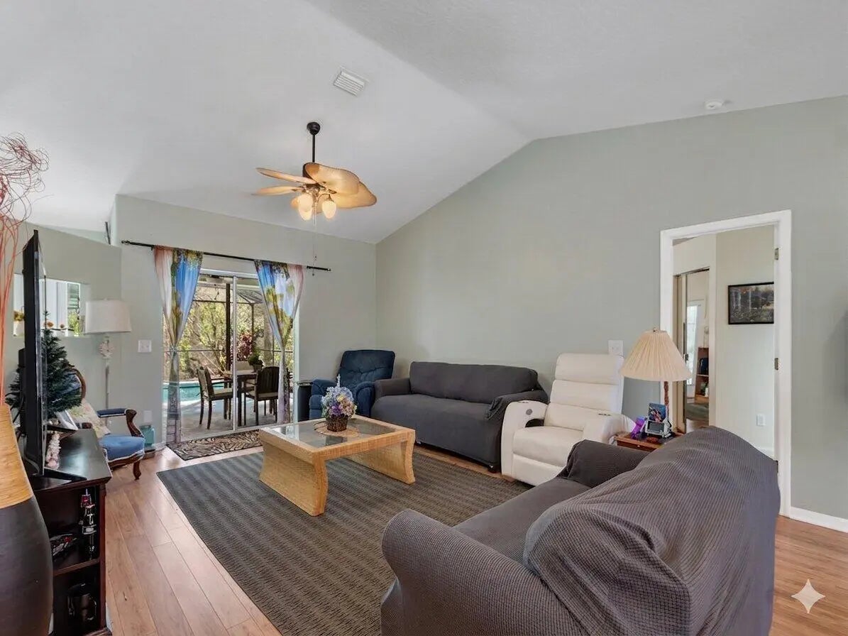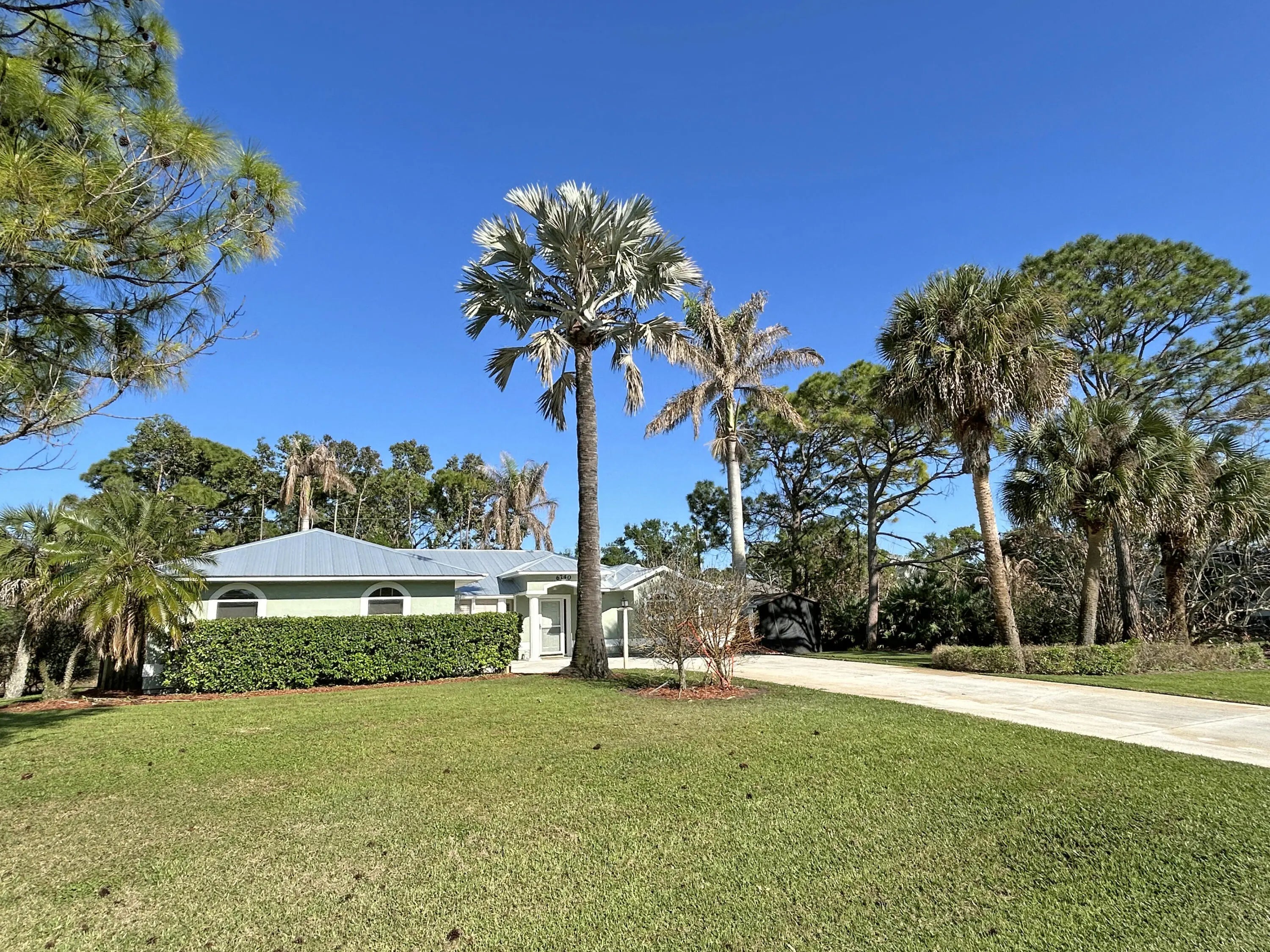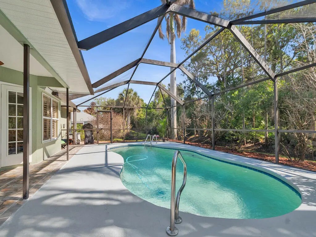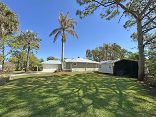 Enjoy the country lifestyle in this 3bed/2bath pool home on 1/2 acre lot with lovely mature trees and palms! Highlights include new paint inside & out, nearly new (2023) metal roof, vaulted main areas, spacious side-entry garage with workshop area & exhaust fan! Split floor plan plus pool bath are perfect for guests. Kitchen offers plenty of cabinet storage plus pantry and 2nd closet! Ideal county water, well for irrigation, plus multiple storage options onsite for your boat, toys & equipment make this a highly desirable home option! Enjoy relaxing in the peaceful, screened pool area! No HOA! Please note: There is inside Laundry space. Original design had W/D inside and is probably plumbed inside wall.