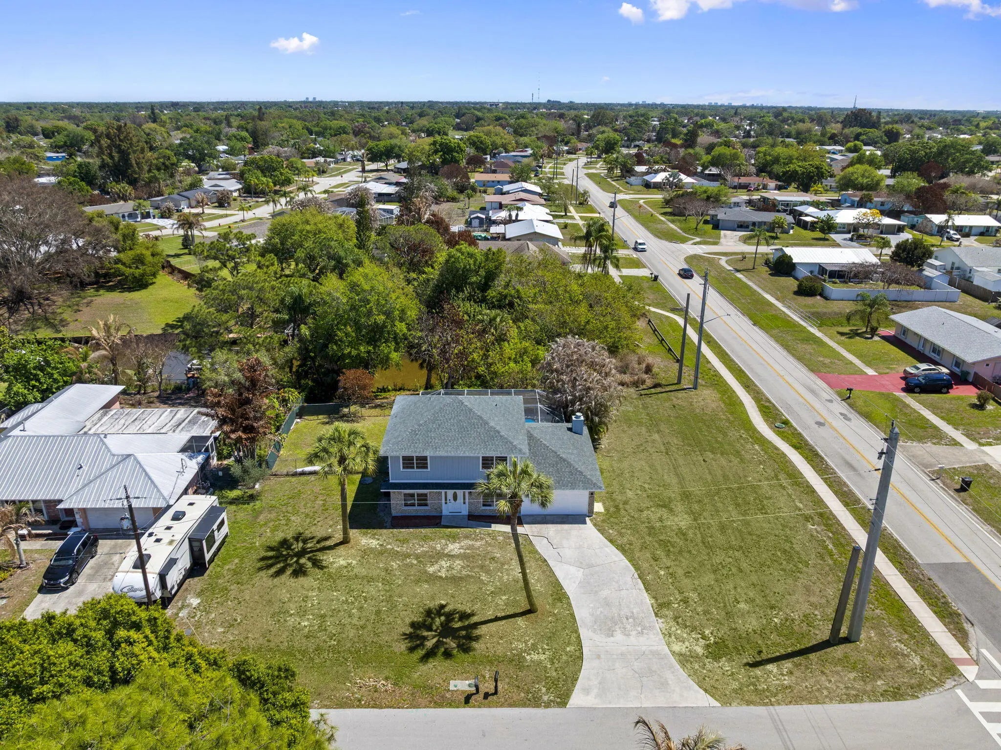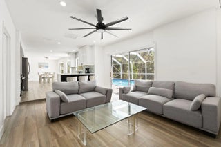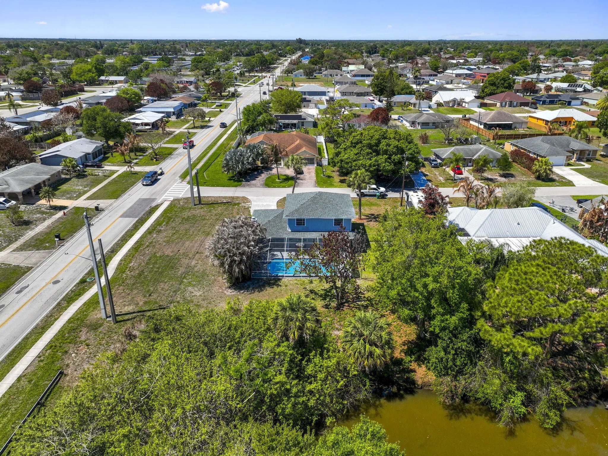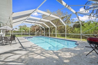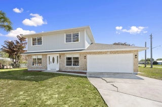 Positioned on a navigable finger of the St. Lucie River with ocean access, this fully updated two story home has 5 bedrooms, 3 bathrooms, a den, and nearly 2,000 square feet of living space, the layout is both functional and flexible for a variety of needs. The main level includes a bedroom, full bath, and den perfect for guests, a home office, or multi-generational living, while four additional bedrooms and two bathrooms are located upstairs. The living area features a wood burning fireplace with a modern design, and cabinetry on each side. Recent 2025 upgrades include a new roof, A/C system, and water heater, providing peace of mind for years to come on the big ticket items. The interior has been thoughtfully modernized with soft close cabinets and quartz countertops in both the kitchen and bathrooms. Situated on an oversized 16,000 sq ft corner lot, the outdoor space is designed for both relaxation and entertaining, featuring a private pool, screened-in patio, and a partially fenced yard. Conveniently located just 10 minutes to the Florida Turnpike, 15 minutes to I-95, under 10 minutes to shopping and dining at St. Lucie West, and less than 20 minutes to Tradition. Beaches are approximately 25 minutes away, making this home a rare opportunity to enjoy waterfront living with easy access to everything the Treasure Coast has to offer.