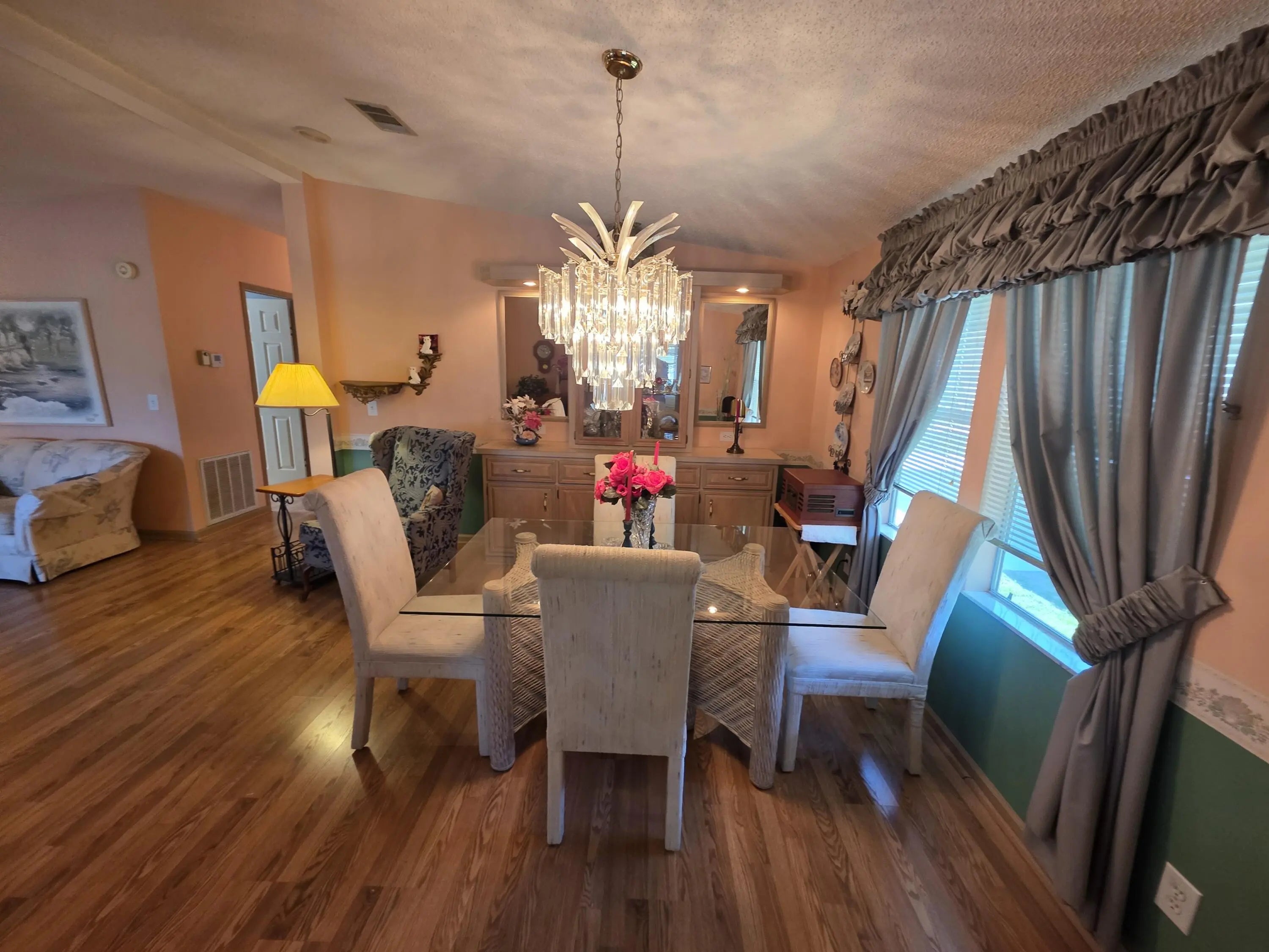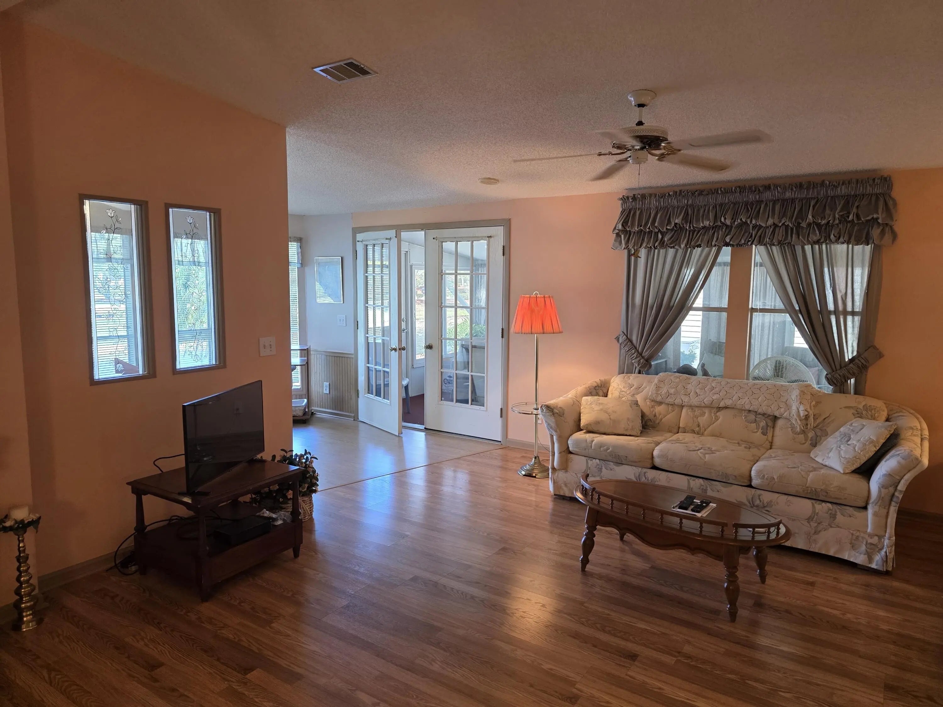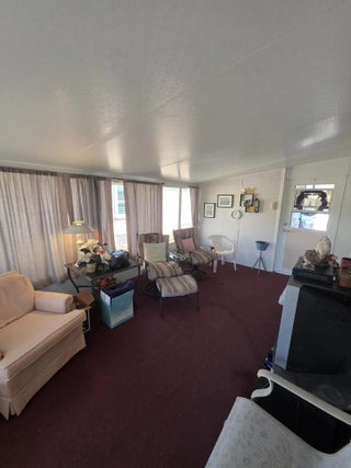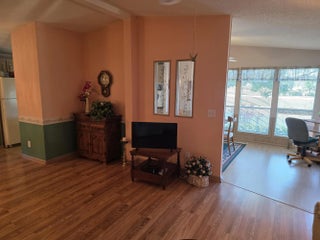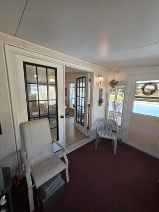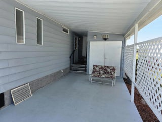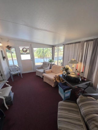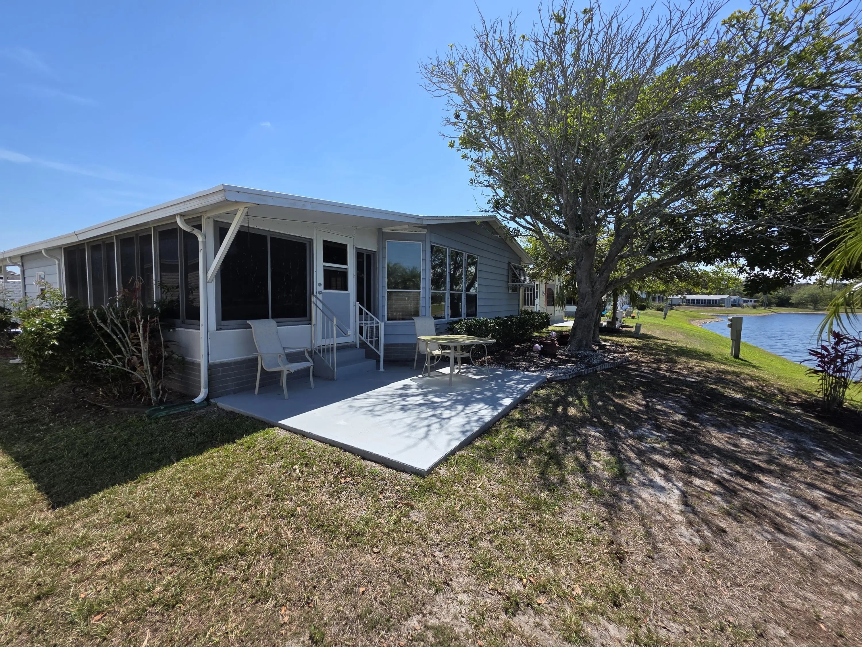 LAND OWNED ! Large 2 bedroom, 2 bath home with a direct water view. Super large master bedroom with an attached bathroom, Dual sinks, separate shower and soaking tub highlight the master bath. L-shaped kitchen with plenty of counter space and cabinets. Ample seating in the dining room for your guests. Breakfast area with a gorgeous view of the water. Spacious living room with glass French doors leading to your lanai. Lanai has windows and screens with a door to the carport and another to the back patio. Concrete patio overlooks the back pond. Roof replaced in 2024 as was vapor barrier. All broken tiedowns replaced in 2026.