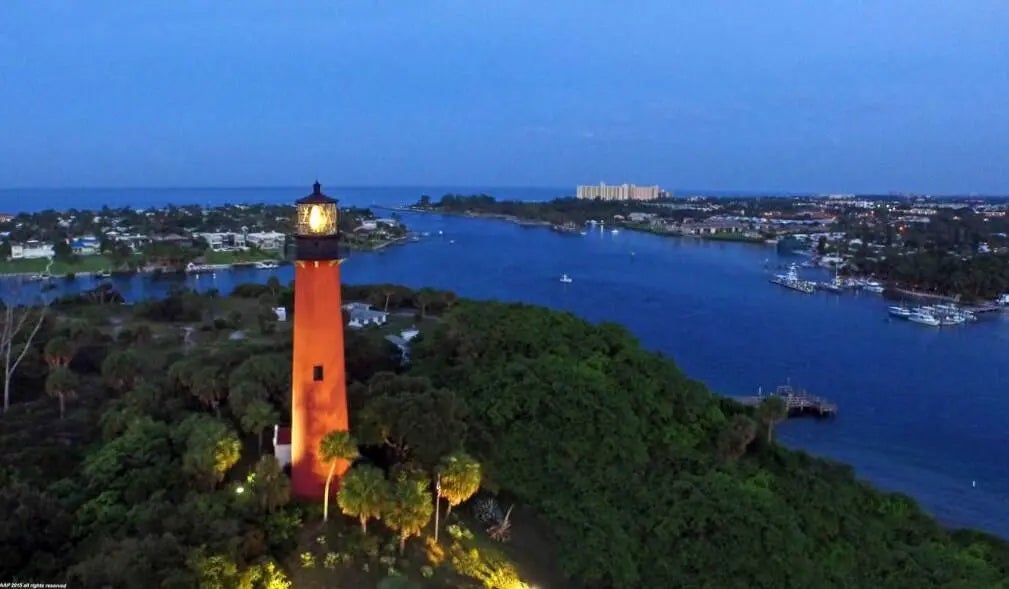 To mark the reef lying off the Jupiter Inlet, Congress in 1853 appropriated $35,000 to construct a lighthouse. At the top of the Jupiter Lighthouse, you can see the Loxahatchee River.