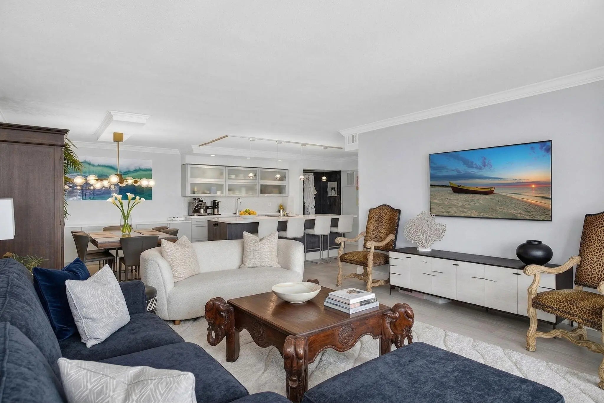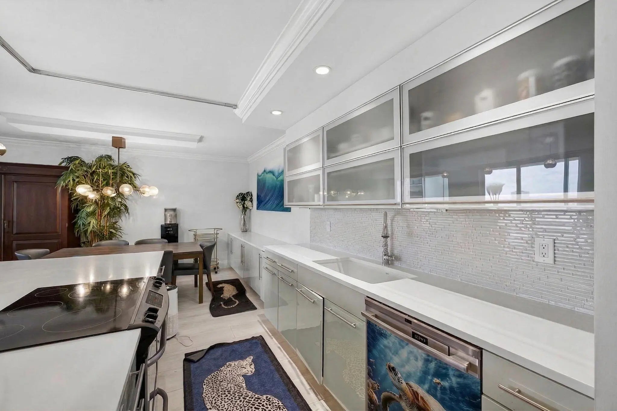 Paradise living on Singer Island! This beautifully updated residence at the Aquarius offers breathtaking ocean and Intracoastal views from every room. Designed with an open, airy layout, the living and dining areas flow seamlessly into a stunning kitchen featuring white quartz countertops, a spacious eat-in island, soft-close cabinetry, and stainless steel appliances—perfect for both everyday living and entertaining. Both bathrooms have been tastefully renovated with elegant white quartz finishes, while crown molding throughout adds a refined touch. Wake up to spectacular ocean views from the primary suite and unwind on your private balcony overlooking both the Atlantic and Intracoastal waterways. Aquarius amenities include a newly renovated fitness center, sauna, billiards room, community lounge, library, resort-style pool, and private beach access—offering the ultimate in coastal living.