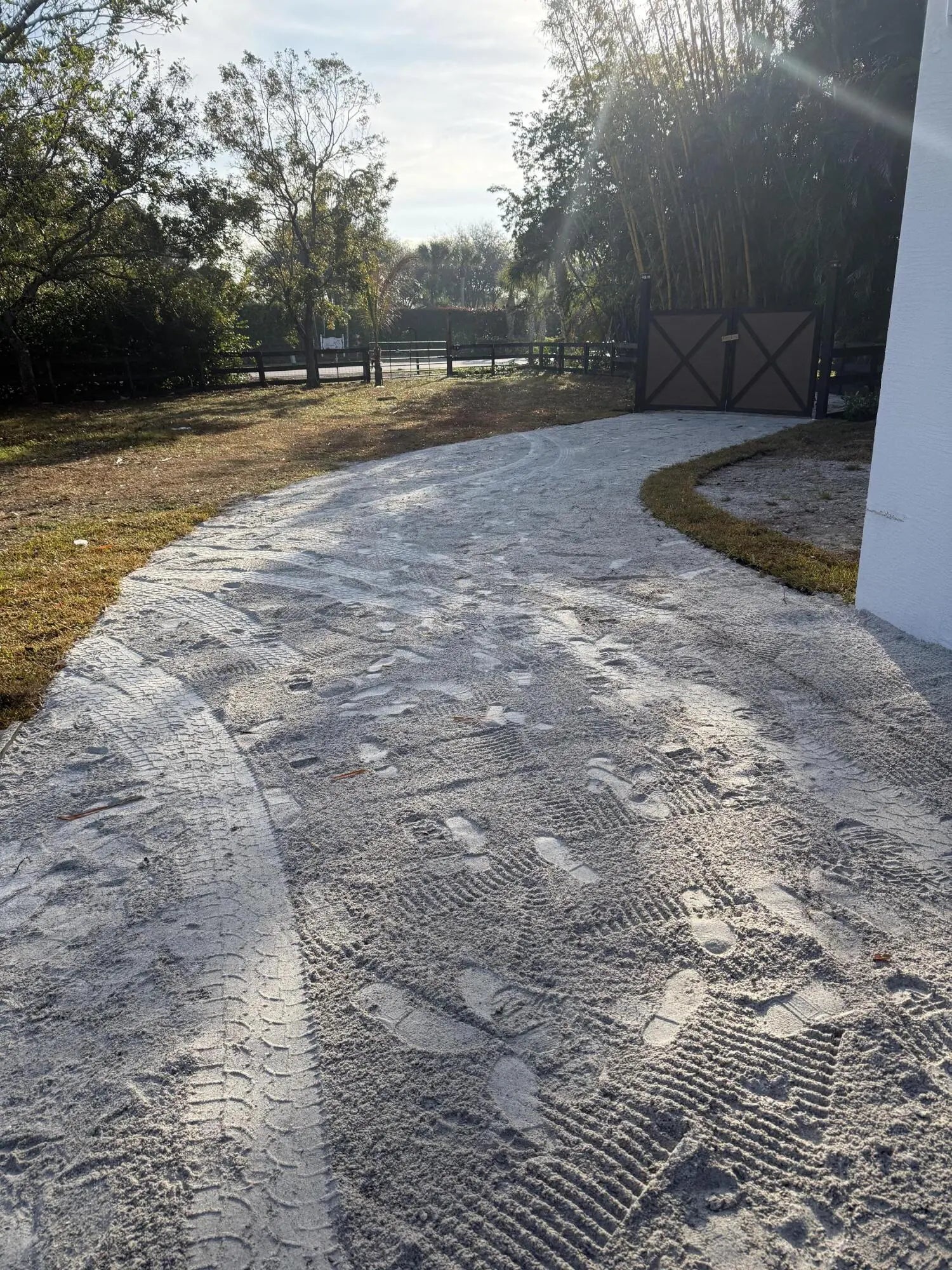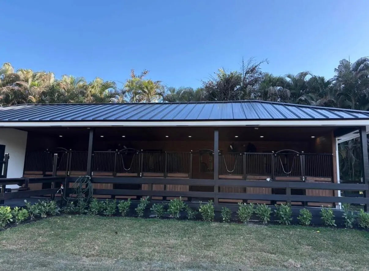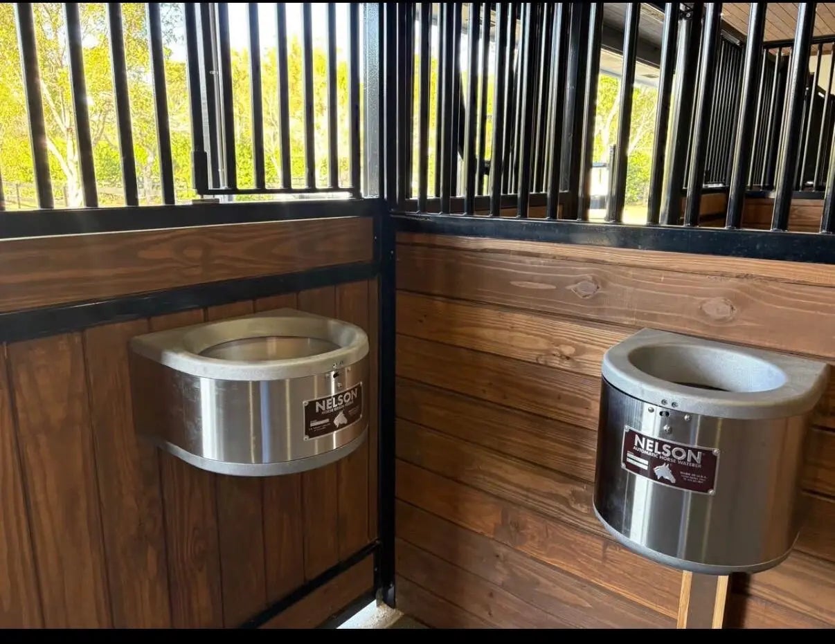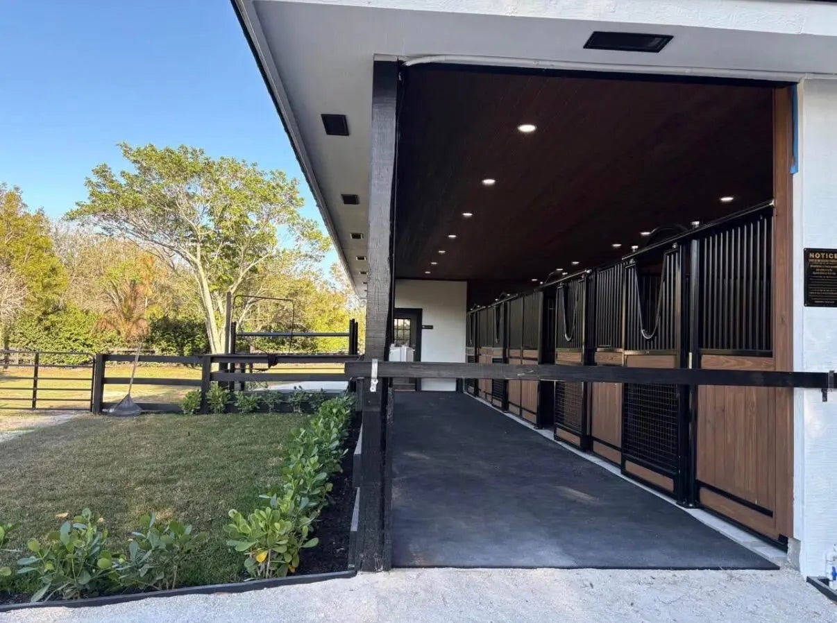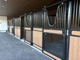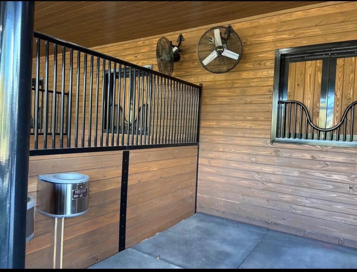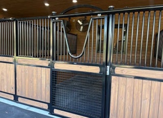 New build 4 stall barn with new water features, Large tack room, Saratoga stalls. Access to covered riding arena, Grass field to hack in. Grassy Paddocks.