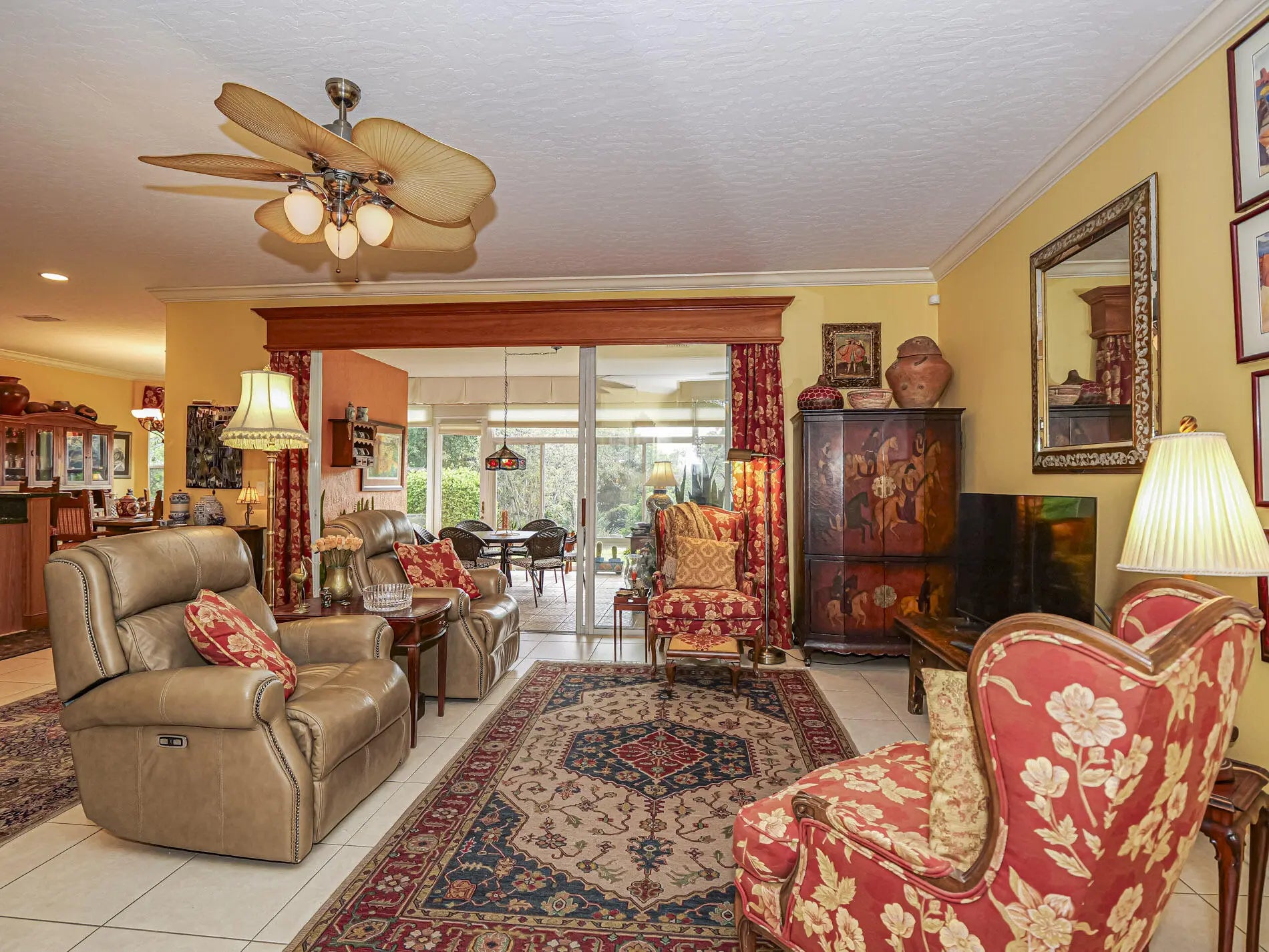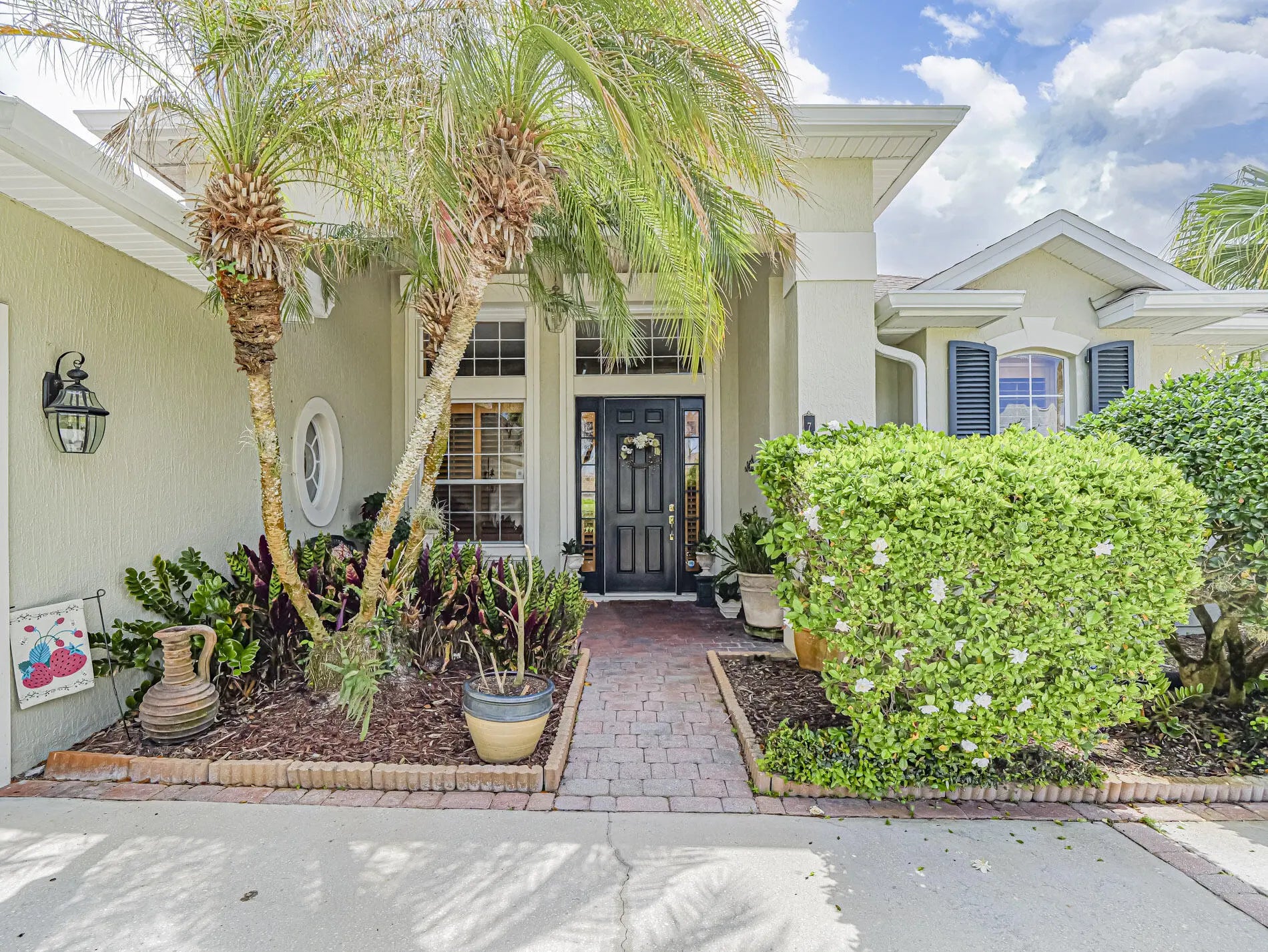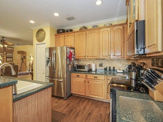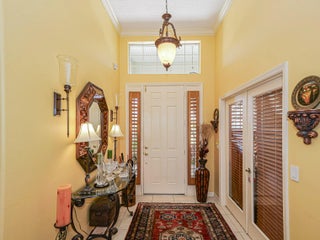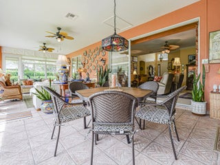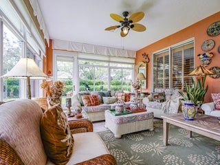 First time available--rare opportunity. Original owners selling. Spacious 3/2 with den, split BR plan with amazing 35X9 glassed in porch overlooking private, back terraced yard with tiered patios. In total, nearly 3000 sq ft of home. Larger 22.4X20.4 garage, separate laundry room. Volume ceilings, crown moldings, newer 2022 roof, tile, wood and laminate flooring. Complete set of accordion shutters plus automatic roll down shutters in front. Lawn sprinkler on well. Botanical gardens and privacy hedges enhance the grounds. No age restrictions in this gated golf community. Great clubhouse with fitness room, large pool and activities. Owner occupied.