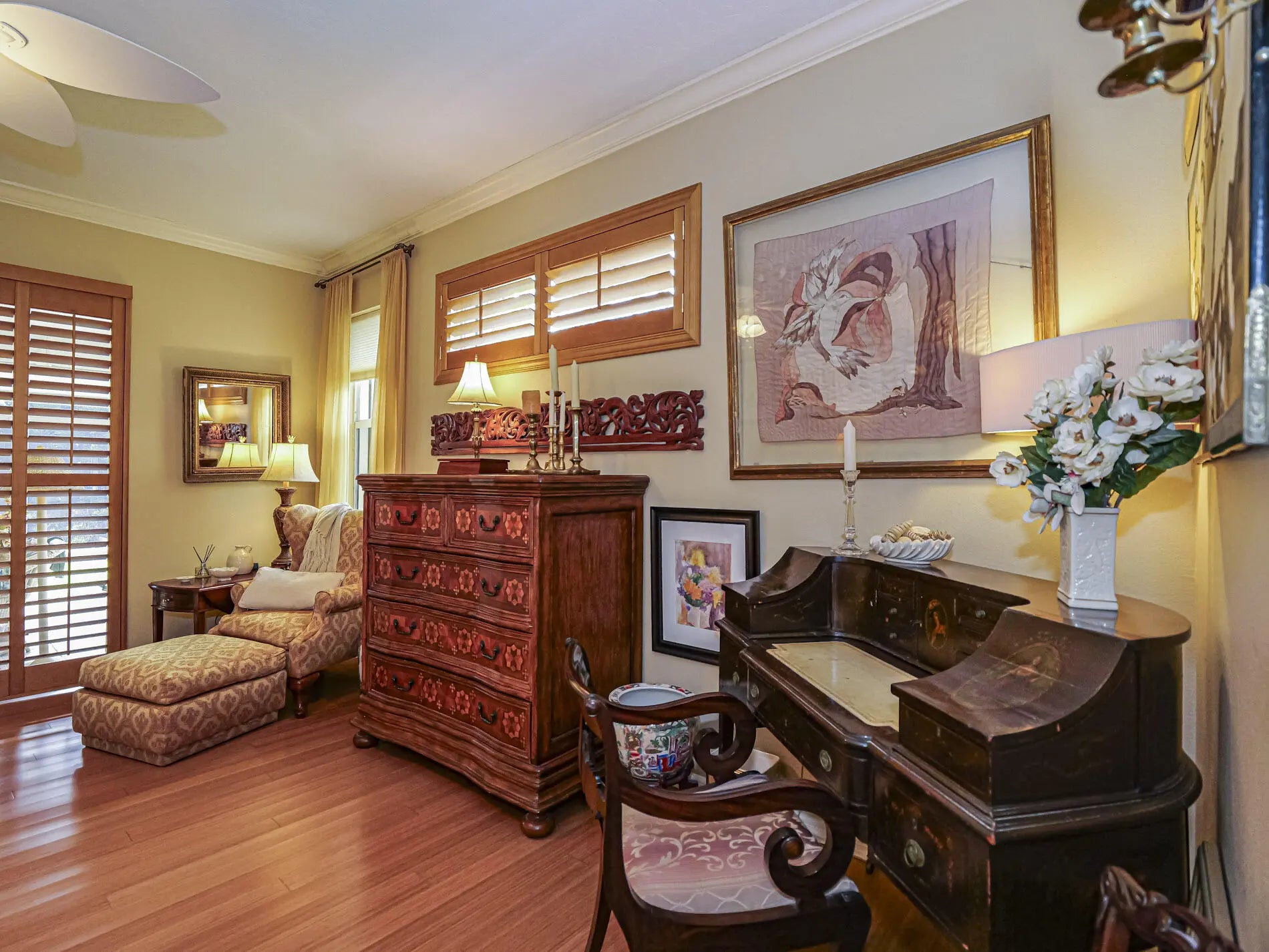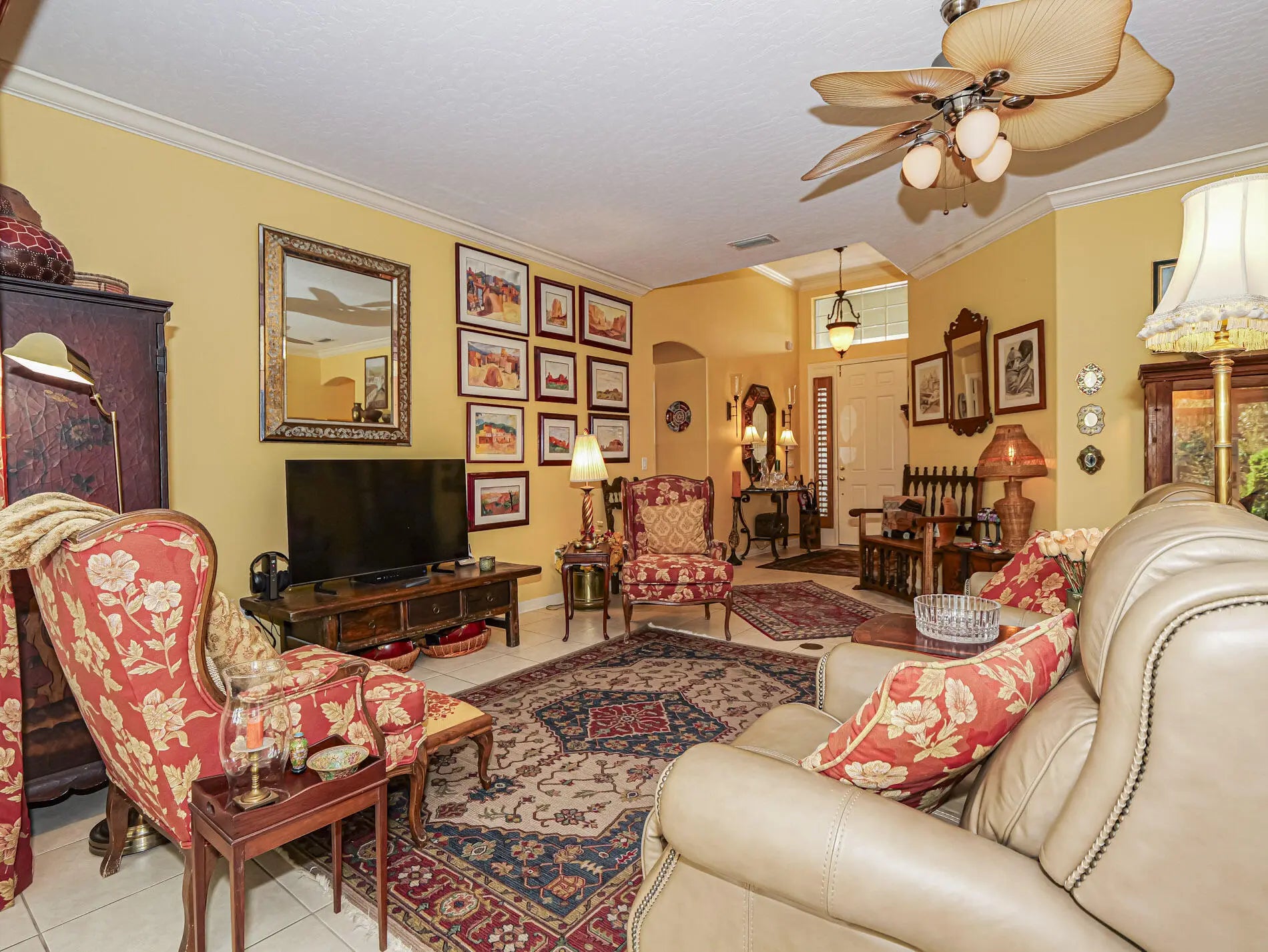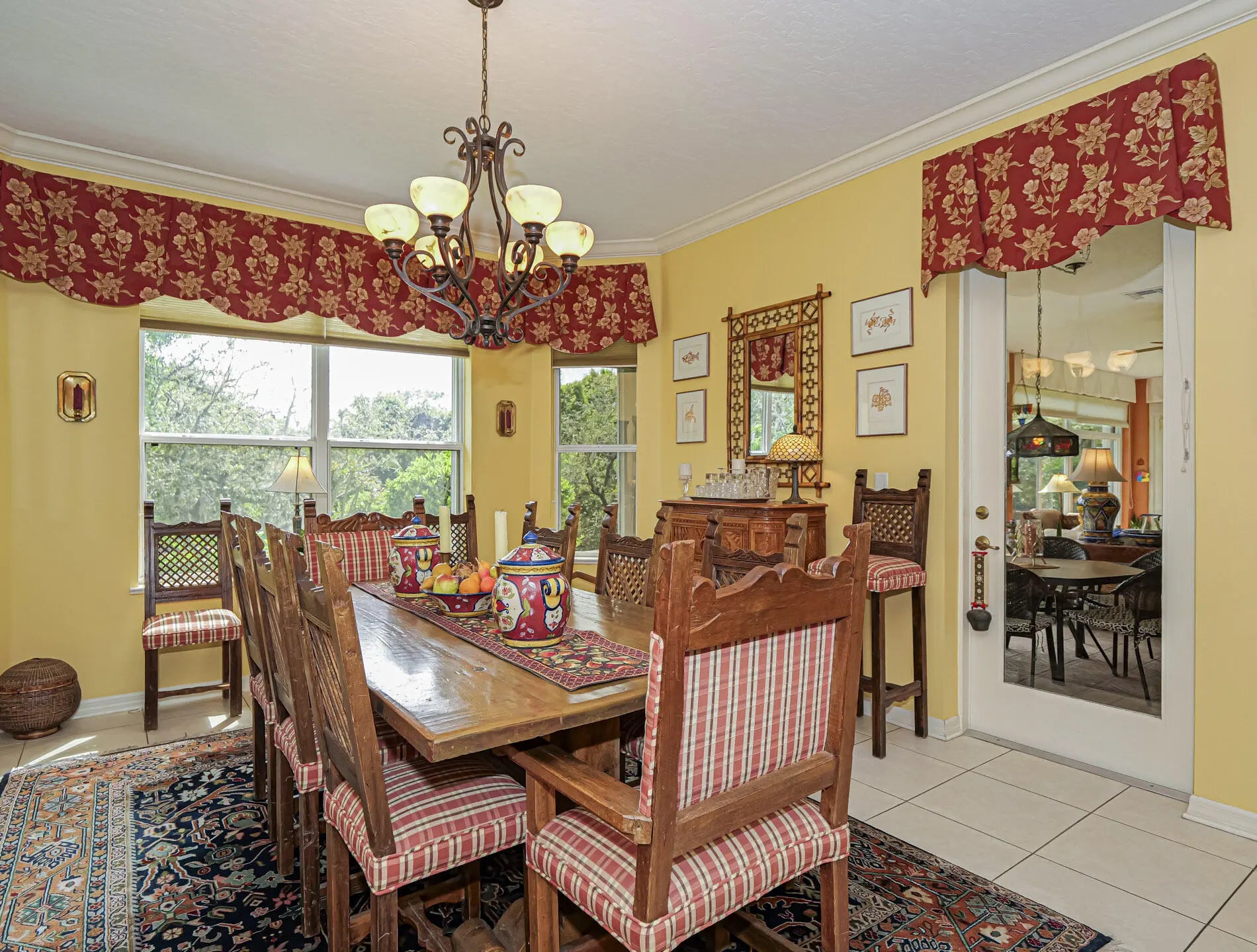 First time available--rare opportunity. Original owners selling. Spacious 3/2 with den, split BR plan with amazing 35X9 glassed in porch overlooking private, back terraced yard with tiered patios. In total, nearly 3000 sq ft of home. Larger 22.4X20.4 garage, separate laundry room. Volume ceilings, crown moldings, newer 2022 roof, tile, wood and laminate flooring. Complete set of accordion shutters plus automatic roll down shutters in front. Lawn sprinkler on well. Botanical gardens and privacy hedges enhance the grounds. No age restrictions in this gated golf community. Great clubhouse with fitness room, large pool and activities. Owner occupied.