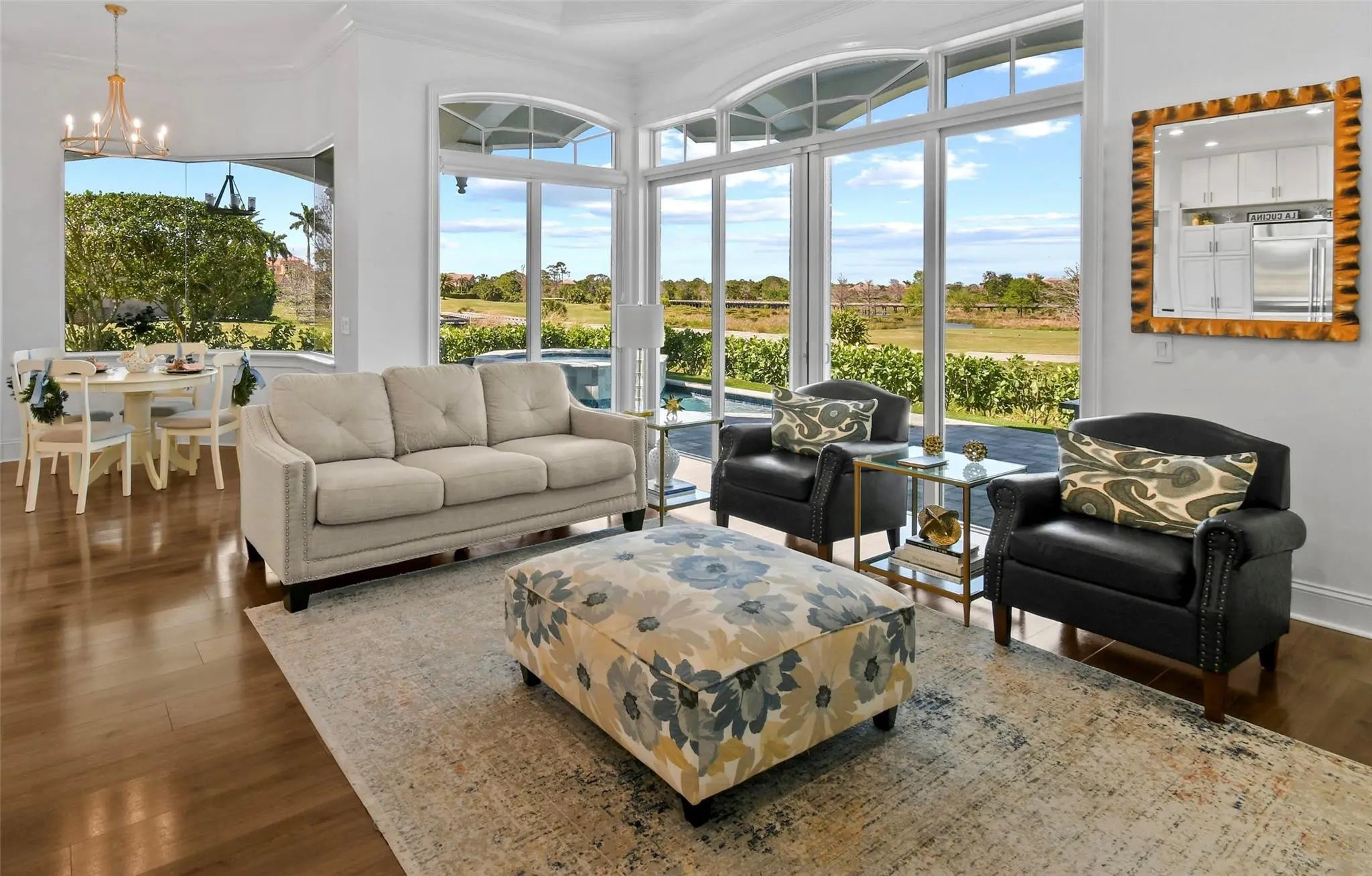 Fabulous large high end home for rent - If you have been waiting to find a beautiful, modern almost totally remodeled, move-in-ready luxury home in a high end secure golf community to rent, this is the home you have been waiting for. The home has a new home construction look and feel to it. It has a beautiful spacious interior, a very clean and attractive exterior, and a million dollar view from both the 1st and second floors in the back of the home. This extensively remodeled estate home delivers the look, feel, and quality of new construction. Spanning approximately 4,500± square feet, this exceptional two story home which even has an elevator that most homes don't have, even hjgh end homes, has been thoughtfully transformed over the past two years with a focus on creating a bright, open, and modern interior while preserving the timeless elegance of its Mediterranean architecture. The result is a seamless blend of classic exterior elegance with a fresh, contemporary, modern remodeled interior.for today's most discerning tenants. The home features a beautiful upstairs master suite with a gorgeous view, two other upstairs bedrooms, a guest bedroom downstairs, two full size offices, and six bathrooms, It has a 2 car garage and a separate golf cart garage. The home has a new paver driveway/entranceway, a new roof, hurricane windows and doors, a brand new home generator, new flooring throughout the home, new paint inside, new paint outside, a newly designed and remodeled kitchen with an 8 burner stainless steel gas oven and double stove, All 6 bathrooms in the home have been remodeled creating a really beautiful, peaceful, and comfortable place to call home. The outdoor setting is equally impressive. There is a small private pool and spa, a first floor patio, and a large 2nd story balcony overlooking breathtaking water, preserve and golf course views, providing exceptional privacy and a peaceful backdrop and offering the perfect place to relax and enjoy sunset views. There are four things that truly distinguishes this home from almost every other rental or really any home: 1 ) it is beautiful and maintained superbly, 2 ) it has complete hurricane protection including a new roof, impact glass and doors ,and even a whole-house generator allowing for uninterrupted comfort and peace of mind during almost any storm, 3 ) It has really exceptional views from the 1st and second stories in the back of the home, and 4 ) it has an elevator and stairs so there was great access to the upstair areas. To have all four of these features in a rental home or any home is a rare feature for people seeking both luxury and security.. This home is offered Unfurnished for $12,500/month on a 1 year lease. A lease for the home furnished with the staging furniture can also be discussed if a furnished rental home is desired. Club membership is not included.