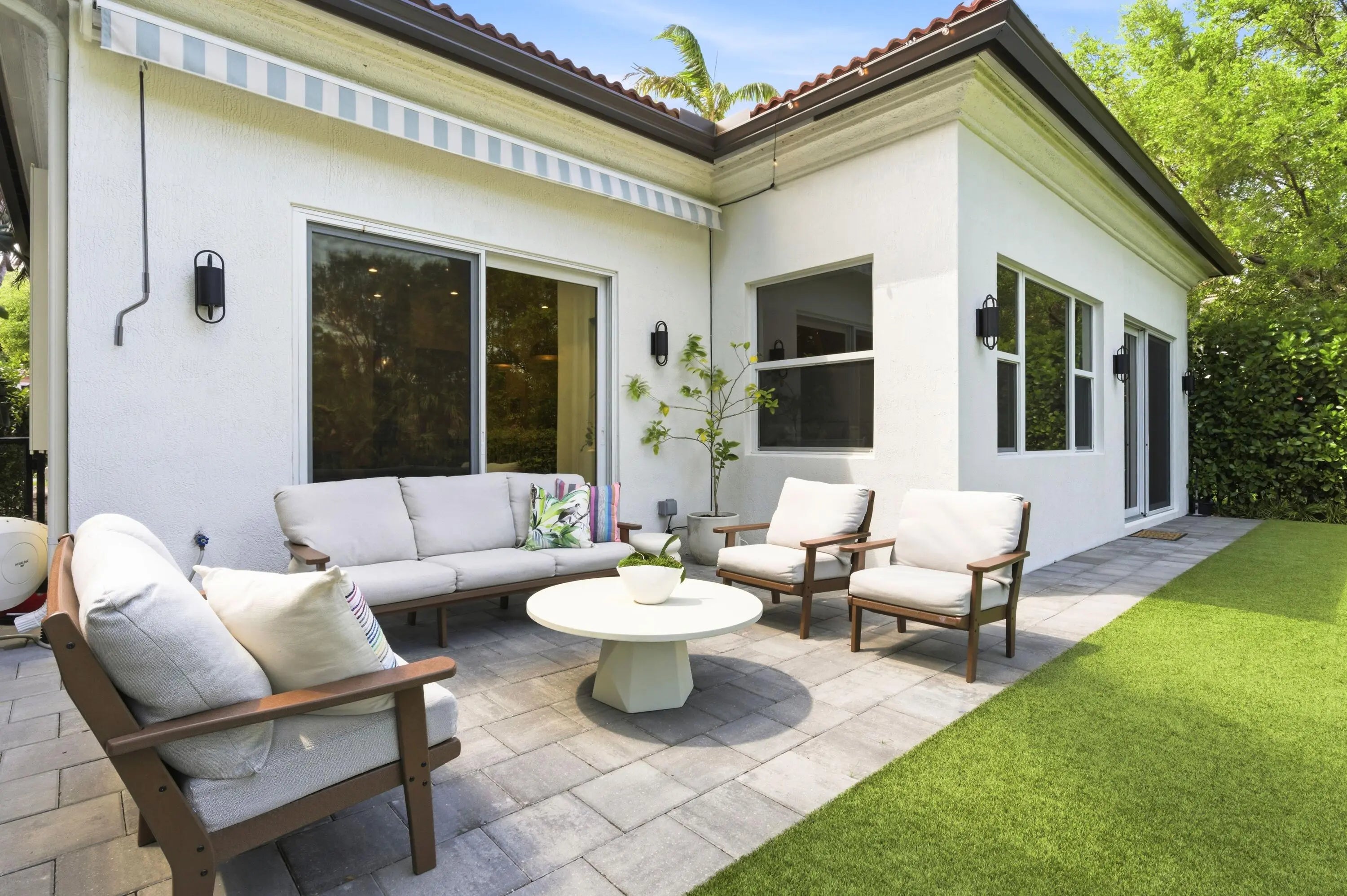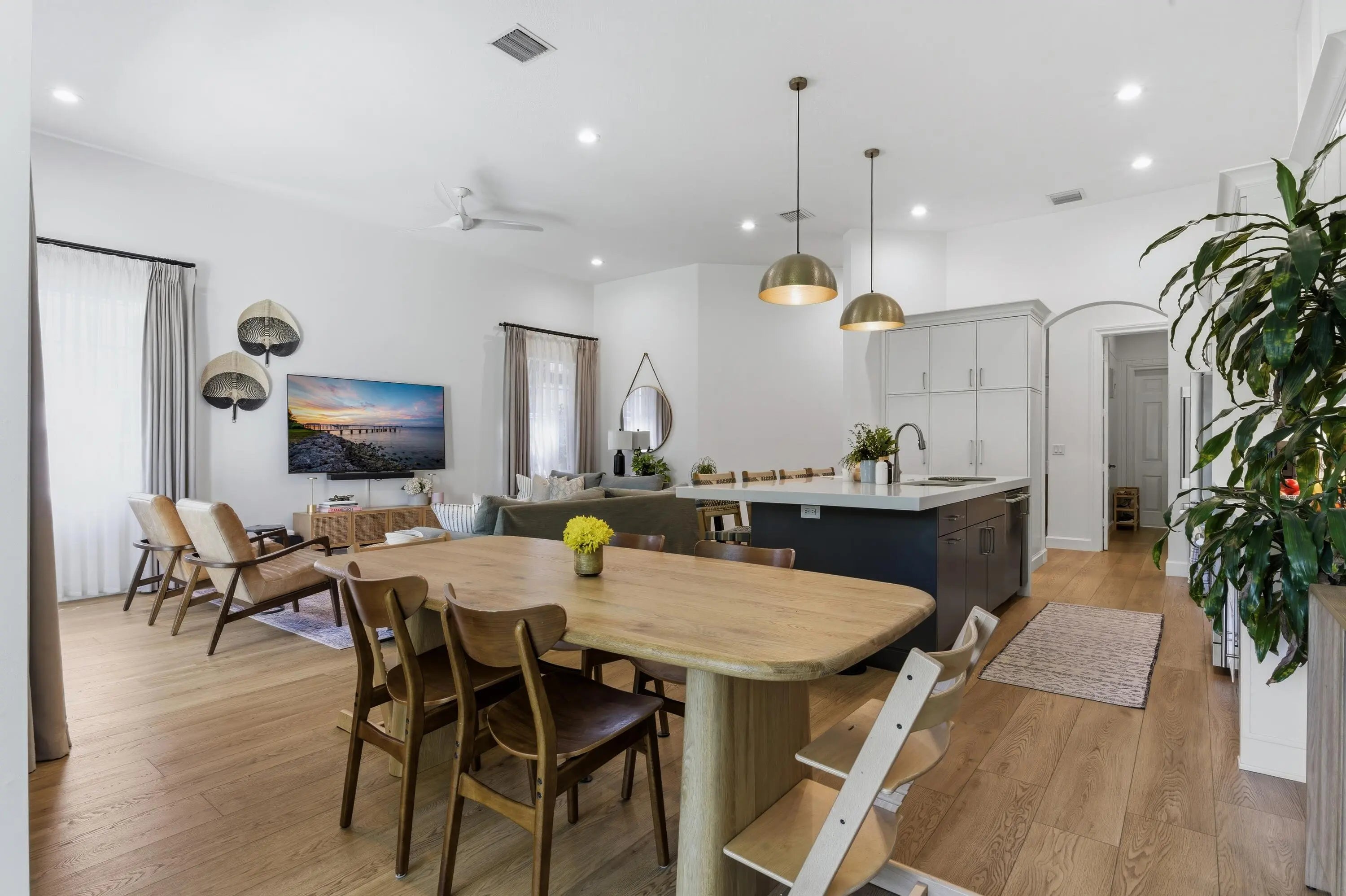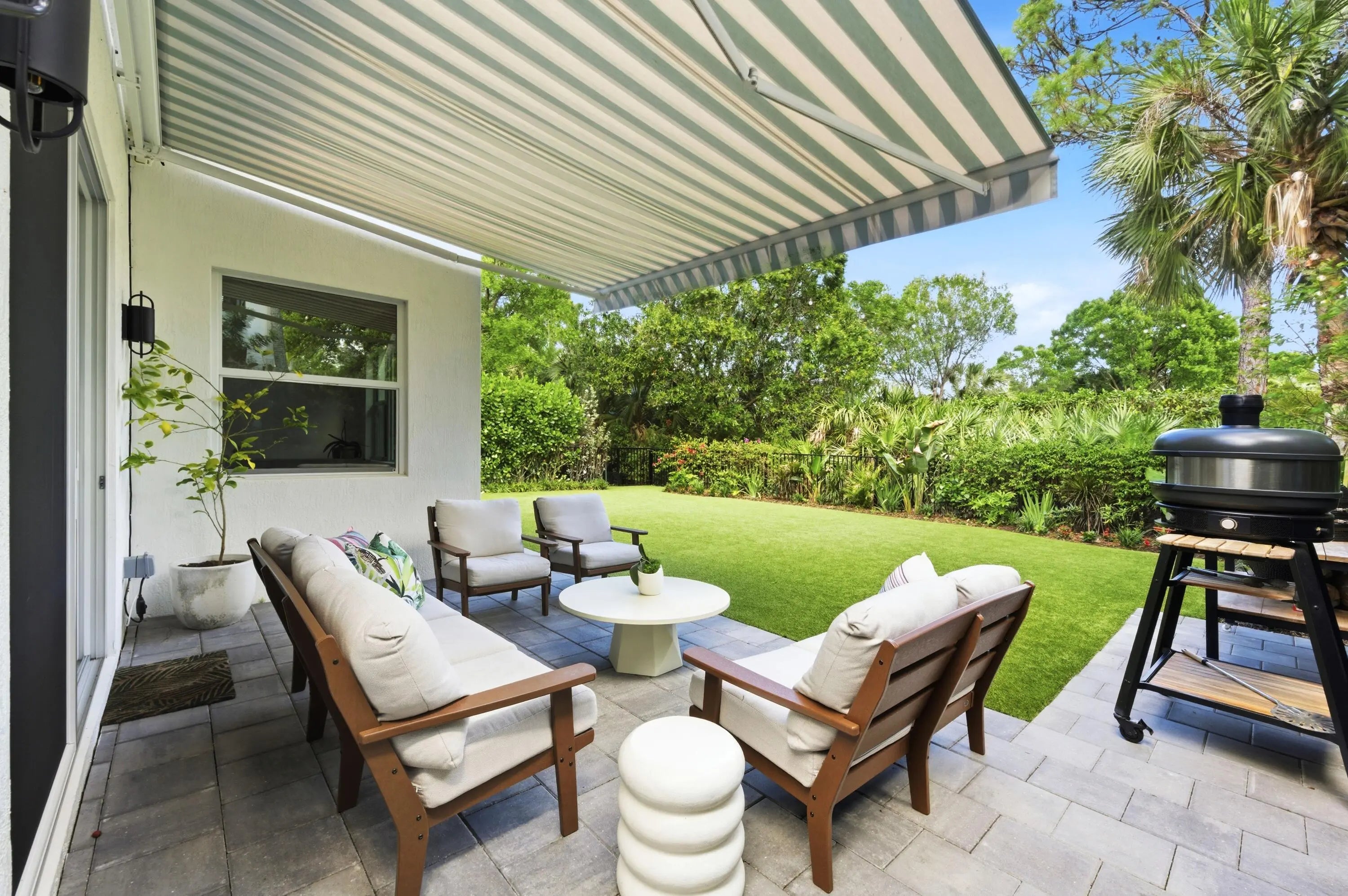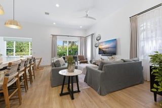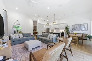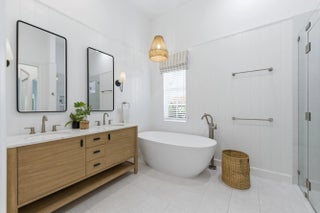 Welcome to this stunningly reimagined 3-bedroom, 2-bath residence with a 2-car garage, where elevated design meets effortless Florida living. Featuring a brand-new roof and soaring ceilings, this light-filled home is designed to feel open, airy, and inviting from the moment you walk in. Located within the highly desirable gated community of Evergrene, this immaculate home has been completely transformed with intention and style. The thoughtfully redesigned layout now includes a third bedroom along with versatile flex spaces perfect for a home office, fitness area, or additional lounge. Step inside to discover Hewn luxury wood-look laminate flooring, designer lighting, and custom window treatments that elevate every detail. The show-stopping kitchen is the heart of the home, featuring quartz countertops, a spacious center island with double stainless steel undermount sinks, a reverse subway tile backsplash, premium stainless steel Fulgor appliances, and a wine cooler—crafted for both everyday living and effortless entertaining. The open dining area flows seamlessly into a sun-drenched sunroom overlooking the backyard, enhancing the home's bright and inviting ambiance. A dedicated laundry room with front-load LG appliances and generous storage adds convenience and functionality. The expansive primary suite is a true retreat, offering private backyard access, dual walk-in closets with custom built-ins, and a spa-inspired en-suite bath complete with a soaking tub, separate shower, water closet, and double vanity. Two additional guest bedrooms share a beautifully updated bath with a tub/shower combination. Step outside to your own private oasis—a fully fenced, turfed backyard surrounded by lush tropical landscaping, featuring a covered patio with awning and tranquil preserve views for ultimate privacy. Just steps from the clubhouse, enjoy resort-style amenities including a fitness center, game room, billiards, basketball and pickleball courts, putting green, and a spectacular pool area. This home is completely move-in ready, impeccably upgraded, and truly one-of-a-kind—a rare opportunity to own a refined slice of paradise in Evergrene.
