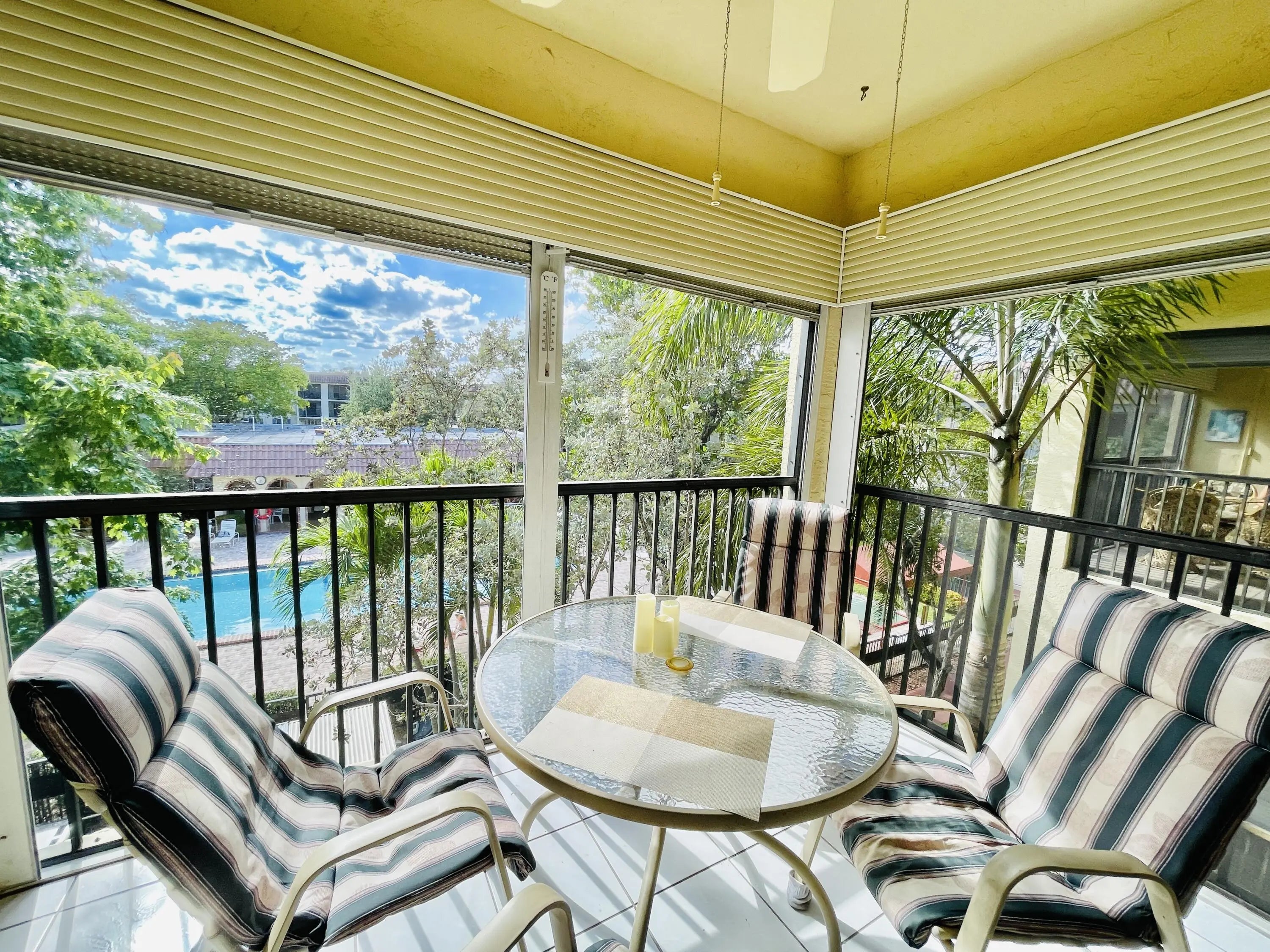 Serene POOL VIEWS from this spacious TOP FLOOR 1-bedroom, 1-bath condo. Bright layout flows from the kitchen through the living area to a screened, West-facing balcony, perfect for SUNSETS. Features include: open kitchen, ample storage w/ 1 walk-in closet, 2 additional closets & balcony storage. Barcelona North offers a secured lobby, clubhouse, BBQ, heated pool, sauna, tennis, shuffleboard, bike storage, guest parking, and nighttime security. Prime location: across from City Hall in the heart of newly developing Pompano Downtown, next to Publix, shops, dining, parks & pickleball courts & just 2 miles to the beach & Pier. UNIT WILL BE FRESHLY PAINTED.