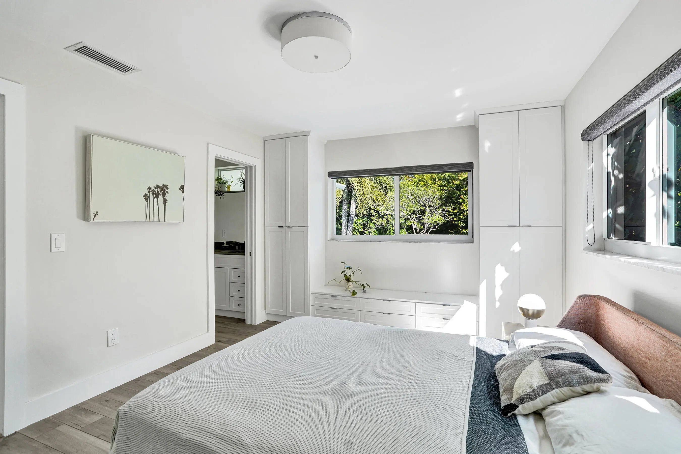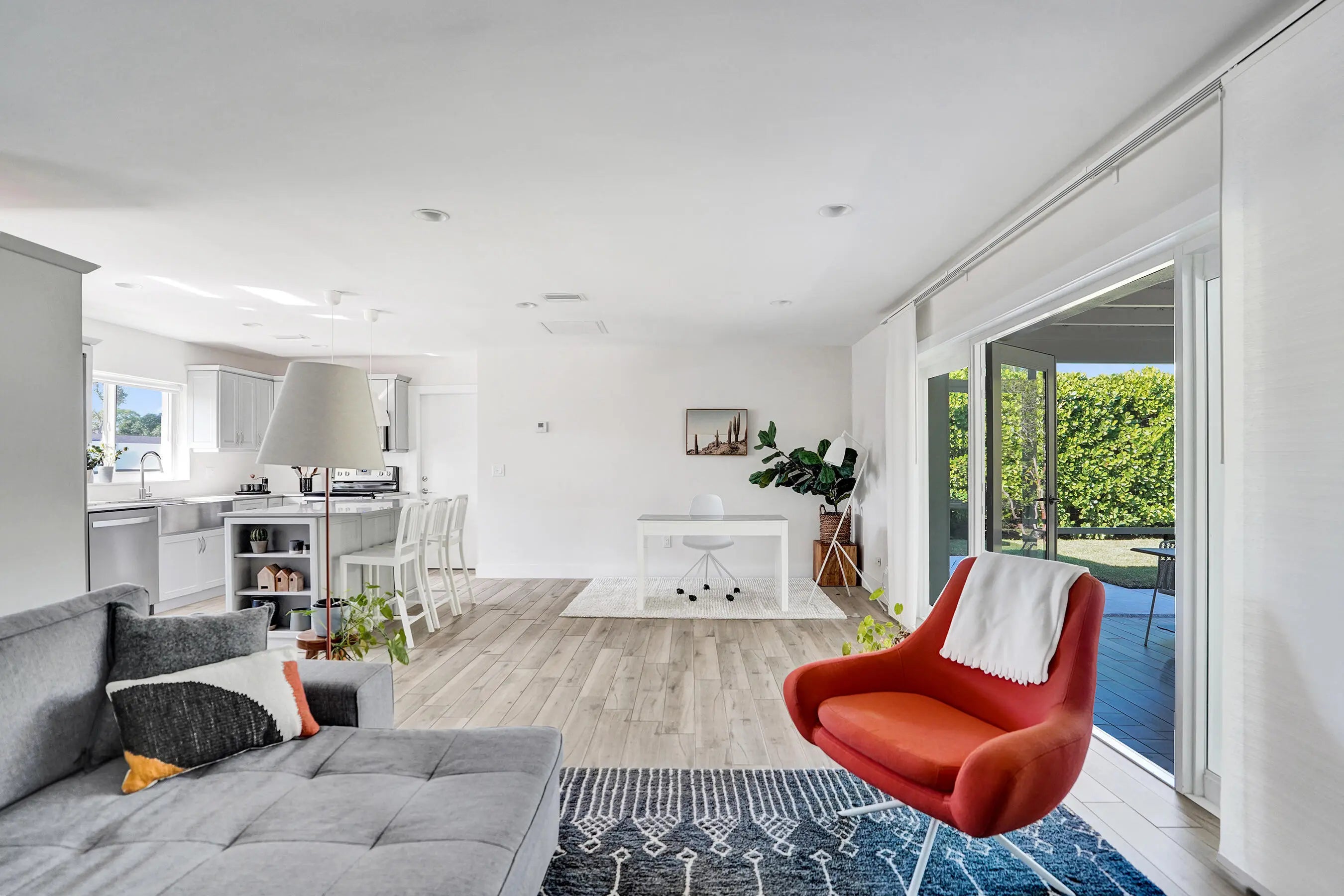 Fall in love with Casa Flora - designer curated furnished 2/2 home in East Boca's desirable Boca Square. Fully stocked, the casita offers a seamless blend of comfort, great energy and an unbeatable East Boca location with all amenities, I-95, Mizner Park & Palmetto Park beach minutes away. Open concept living with chef's kitchen stocked with all necessities overlooking a dedicated office area and living space. French doors lead to a screened in patio, dining table & loungers perfect for entertaining or a peaceful sunrise coffee surrounding by privacy and lush vegetation. A small gym in garage, full size W/D, impact windows and doors throughout. The stylish bedrooms feature Queen size beds, custom storage and black out shades - every aspect considered. Casa Flora is ideal for the discerning renter seeking a furnished turnkey home surrounded by nature, great design and a walkable, bikeable neighborhood. Zoned for Addison Mizner Elementary, one of Boca Raton's most sought-after schools. Grass cutting service included. No Pets. No Smoking.