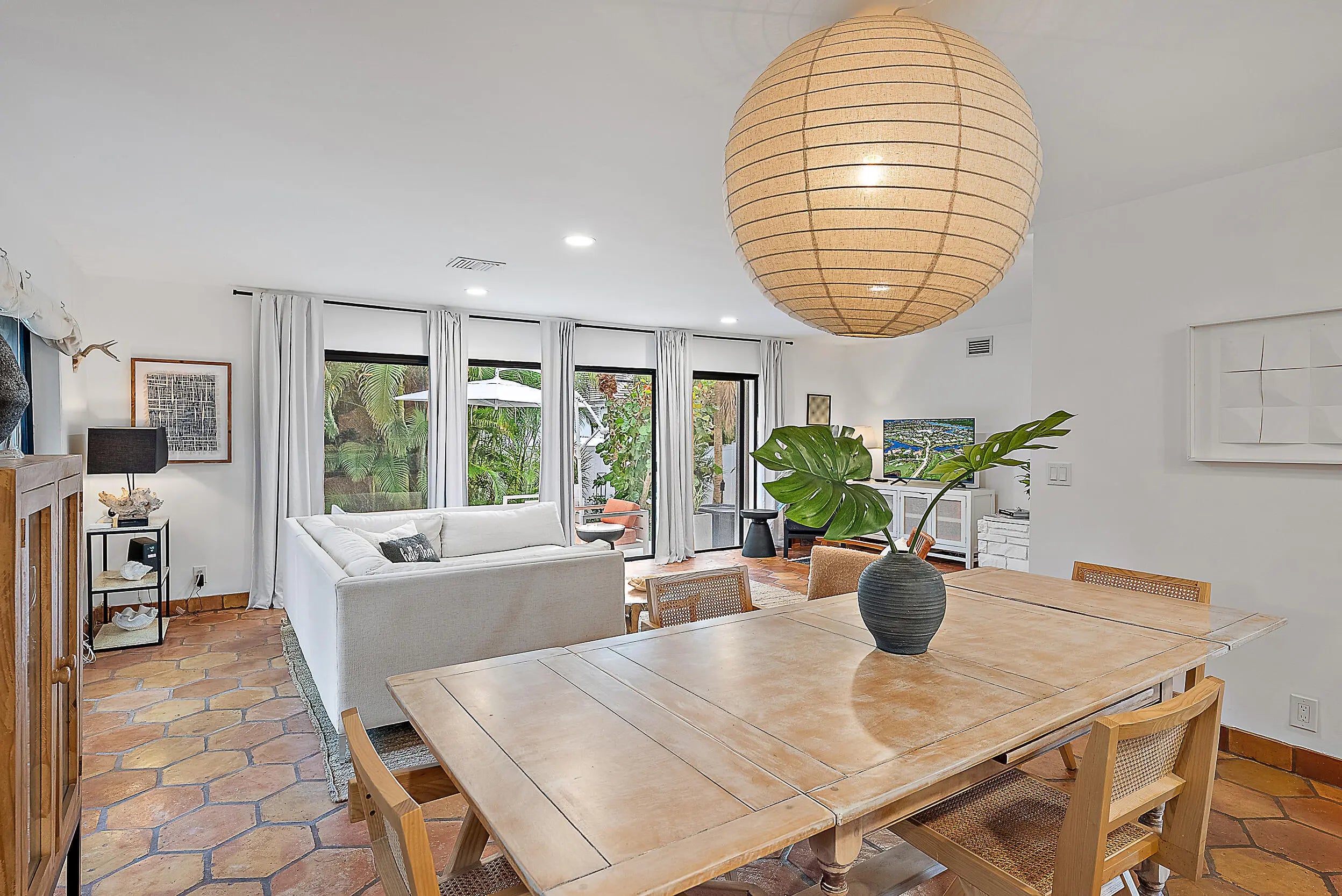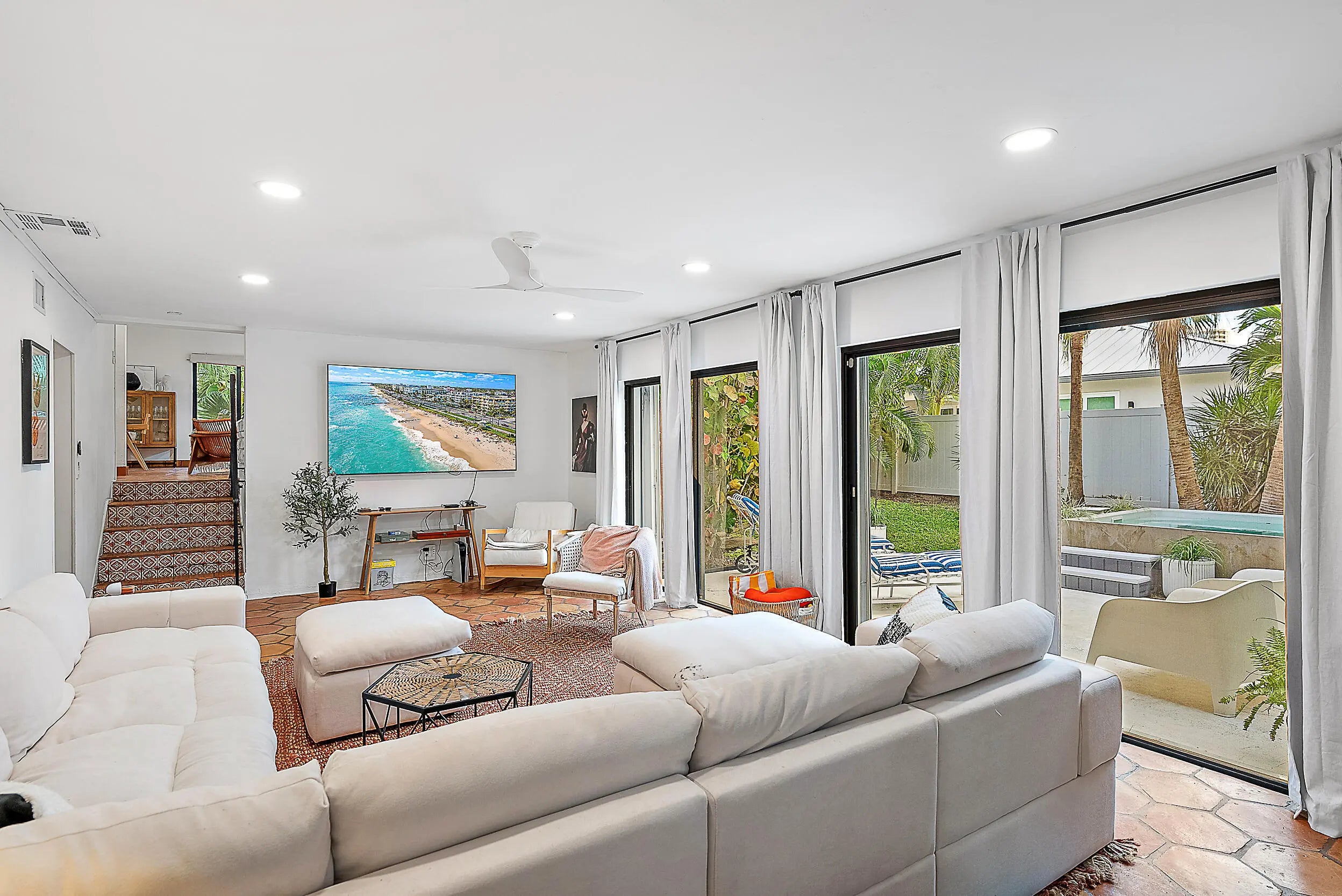 Beautiful 3 BR beach house on Singer Island close to shops and restaurants available this season! Spanish tile flooring in main areas, contemporary open kitchen with Quartz countertops, white cabinets, large dining area, huge bonus room downstairs with big screen tv, which leads to fenced yard and a large plunge pool which can be heated. Other features include: sunroom/screened porch, comfy sectional couch in living room which leads to the deck with sliding doors throughout the home on an oversized beautifully landscaped lot, high ceilings, guest retreat on the top floor which can sleep 4. 5 bikes provided for your use. Close to beach. Don't miss out on this beauty! Available May 1. All utilities included except electric.