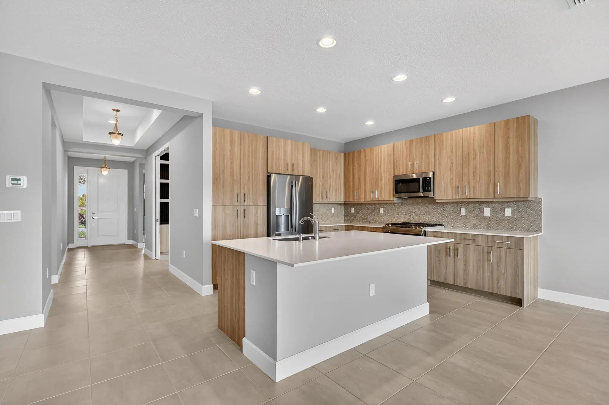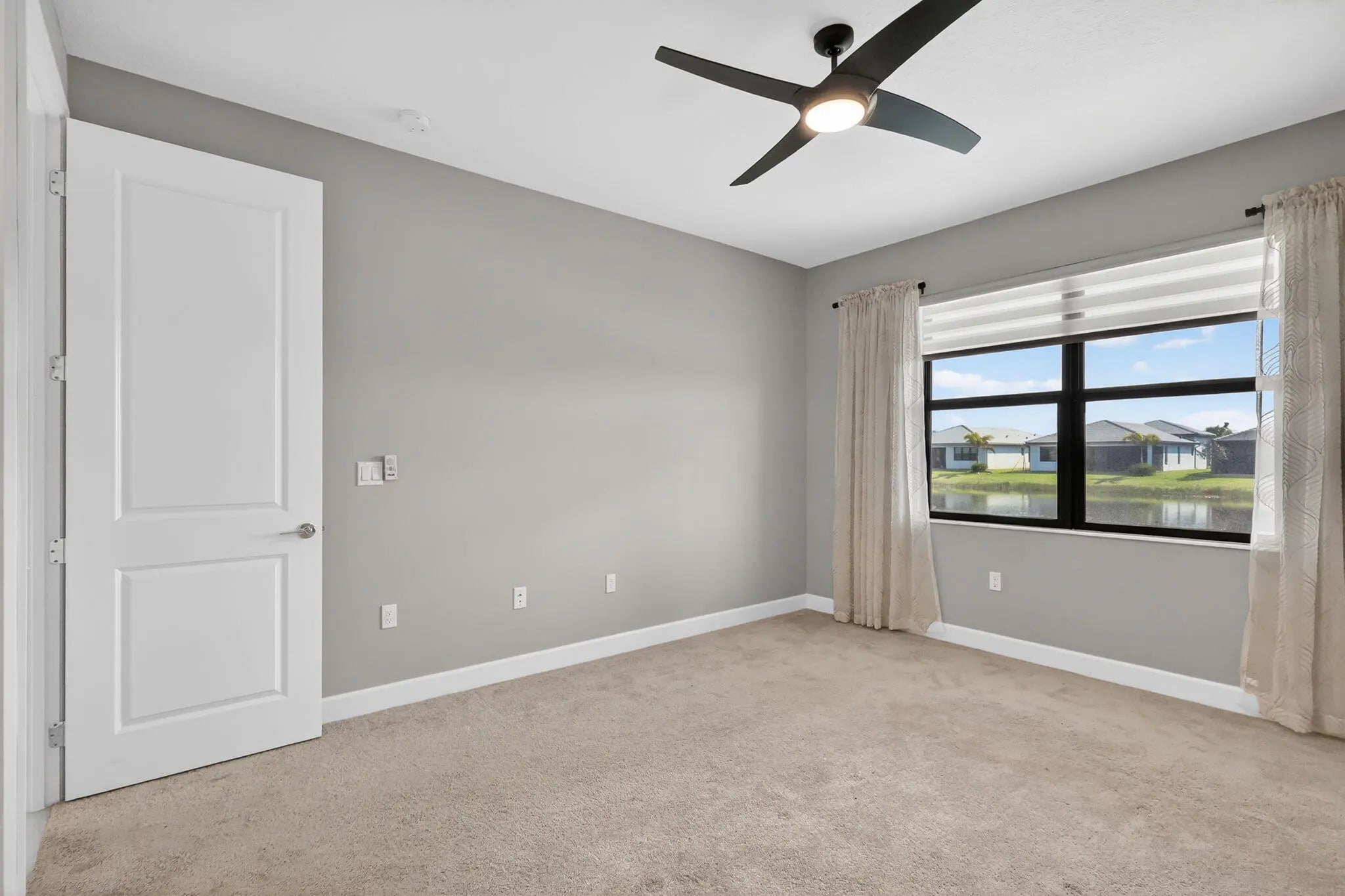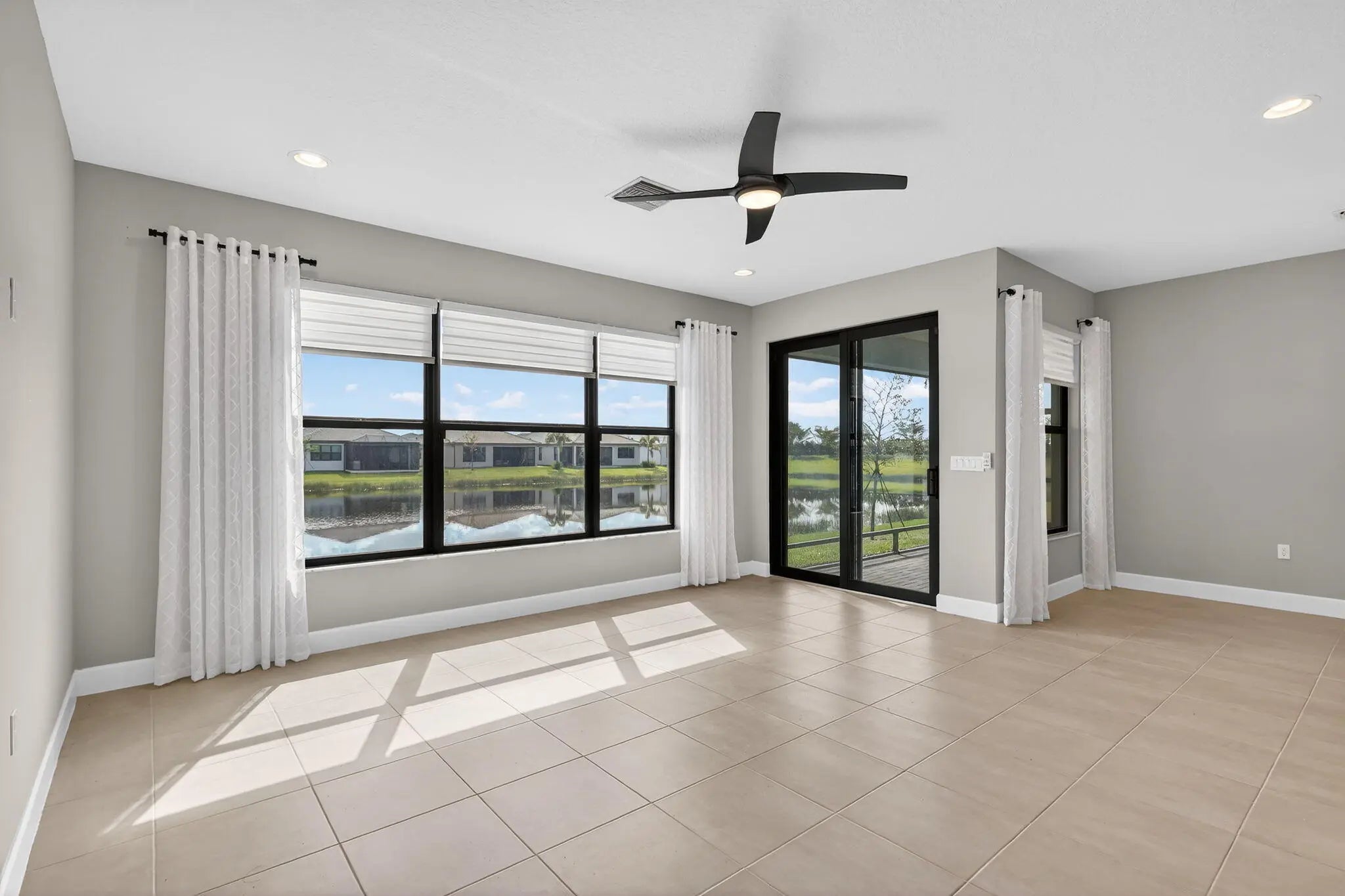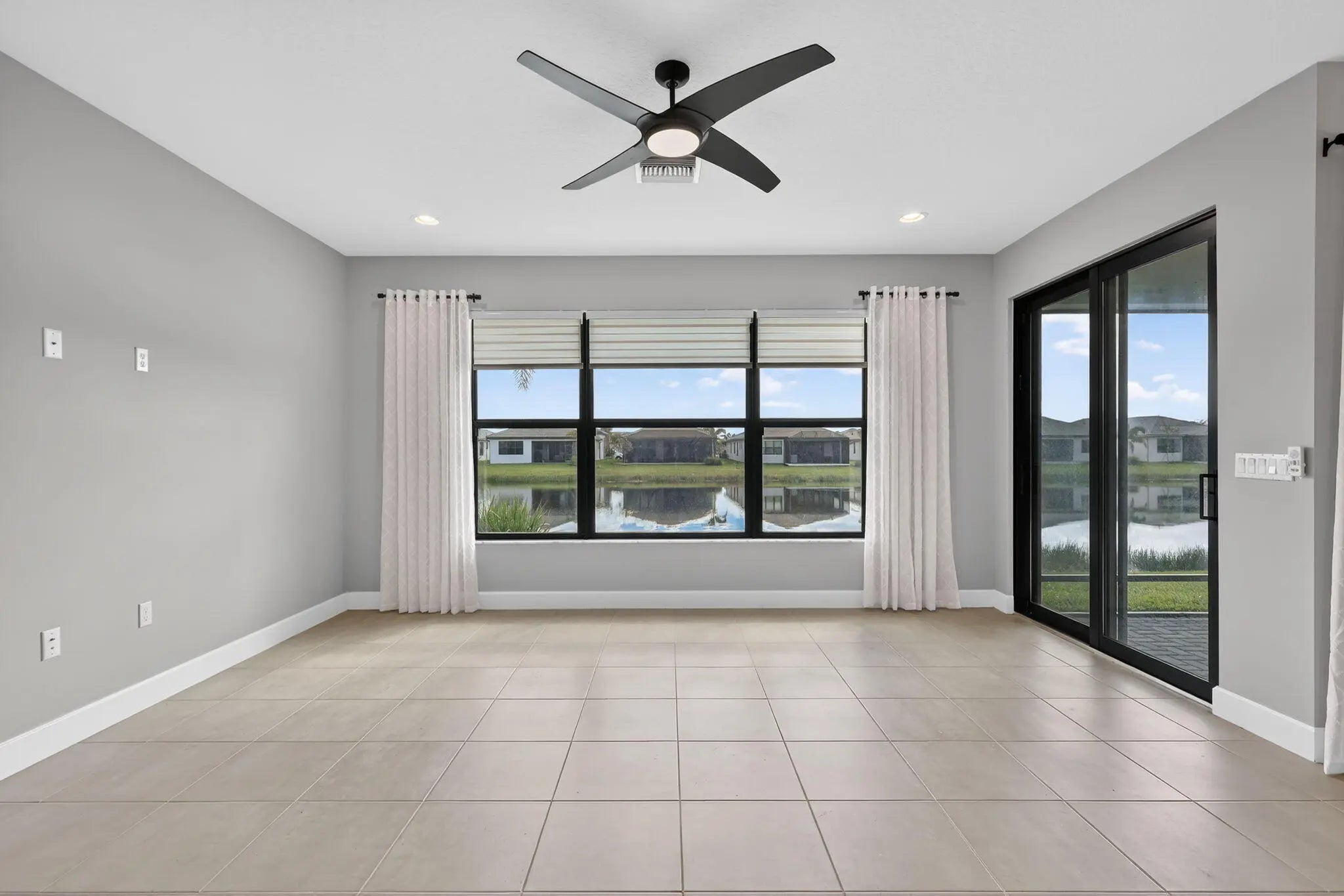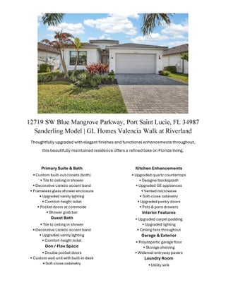 UNFURNISHED 8 MONTH MINIMUM RENTAL - This beautifully upgraded Sanderling model in GL Homes' highly sought-after Valencia Walk at Riverland offers the perfect blend of modern design and effortless Florida living. Built in 2024 and set on a scenic lakefront homesite, this light and bright single-story residence features 2 bedrooms plus a den, 1,761 square feet under air, and an open-concept layout ideal for both everyday comfort and entertaining. The spacious kitchen showcases a large island, breakfast nook, soft-close cabinetry, upgraded quartz countertops, designer backsplash, and premium GE appliances including a vented microwave. The home is filled with natural light and offers serene lake views, along with stylish tile finishes in the kitchen and baths, upgraded lighting, and ceiling fans throughout. A flexible den with double pocket doors and a custom built-in wall unit with desk provides the perfect space for a home office or guest room. The primary suite is thoughtfully designed with dual custom built-out closets and a spa-like bath featuring tile to the ceiling, a decorative Listello accent, frameless glass shower enclosure, upgraded vanity lighting, comfort-height toilet, pocket doors at the commode, and a grab bar for added convenience. The guest bath is equally well-appointed with tile to the ceiling, Listello detailing, upgraded lighting, and a comfort-height toilet. Additional interior upgrades include enhanced carpet padding, ample electrical outlets for today's technology needs, and a well-equipped laundry room with utility sink. The garage features a durable polyaspartic floor finish and added storage shelving, while the exterior is enhanced with widened entry pavers for added curb appeal. Tenants have full community privileges, the same as a resident. Valencia Walk at Riverland offers a premier 55+ lifestyle with a stunning 36,000-square-foot clubhouse featuring a resort-style pool, outdoor bar, restaurant, ballroom, and vibrant social hall. Residents also enjoy access to Riverland's expansive amenities, including a 16-acre Sports & Racquet Club and a 5-acre Arts & Culture Center with studios for creativity and enrichment. The community boasts an impressive and growing racquet program with over 50 pickleball courts (with additional courts and covered play underway), tennis courts, and multiple bocce courts, along with a state-of-the-art fitness center, indoor and outdoor pools, and miles of scenic walking and golf cart paths. Ideally located near the Cleveland Clinic Tradition Hospital, Clover Park (spring training home of the Mets), and a wide array of dining, shopping, and coastal attractions, this home delivers the complete South Florida lifestyle.