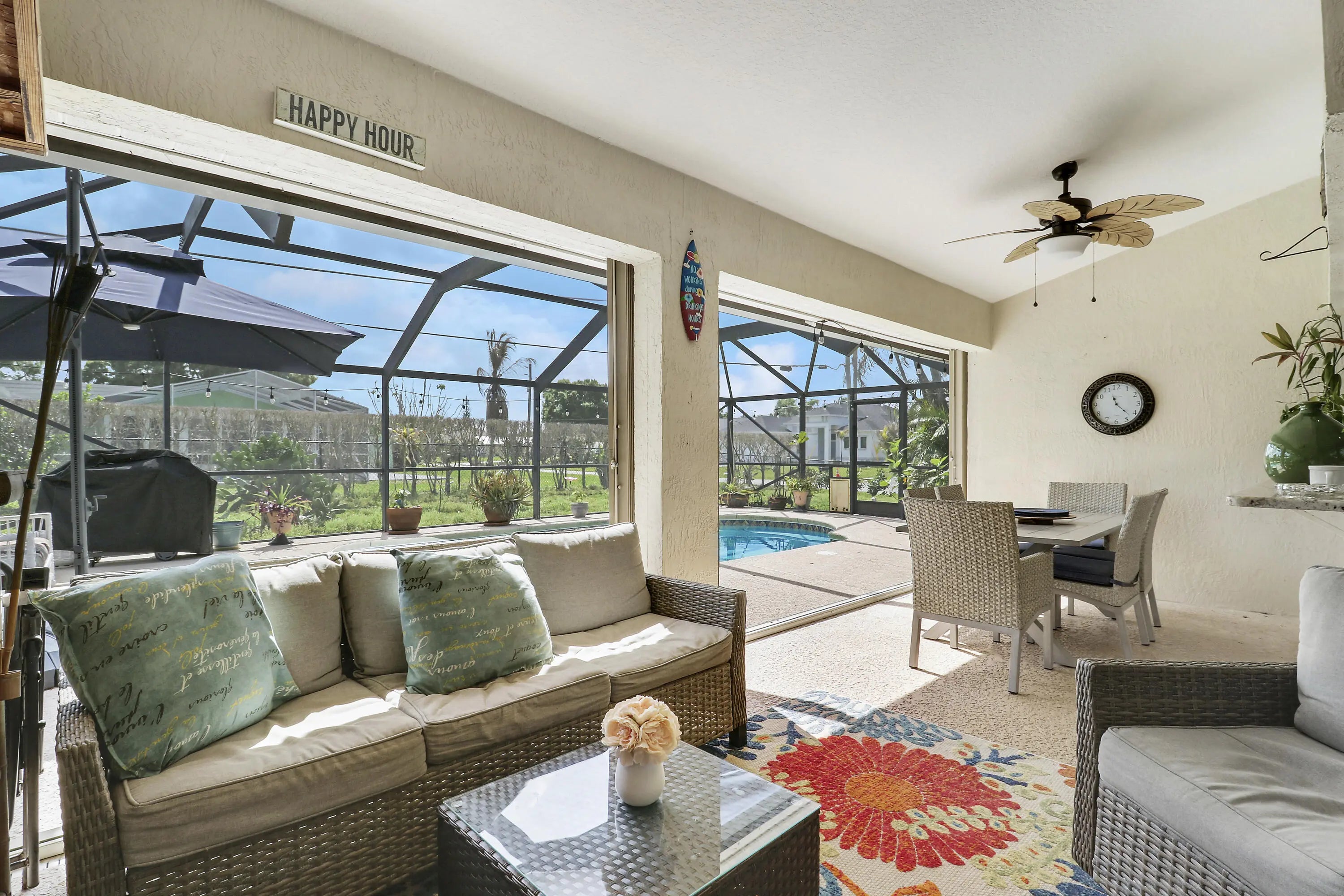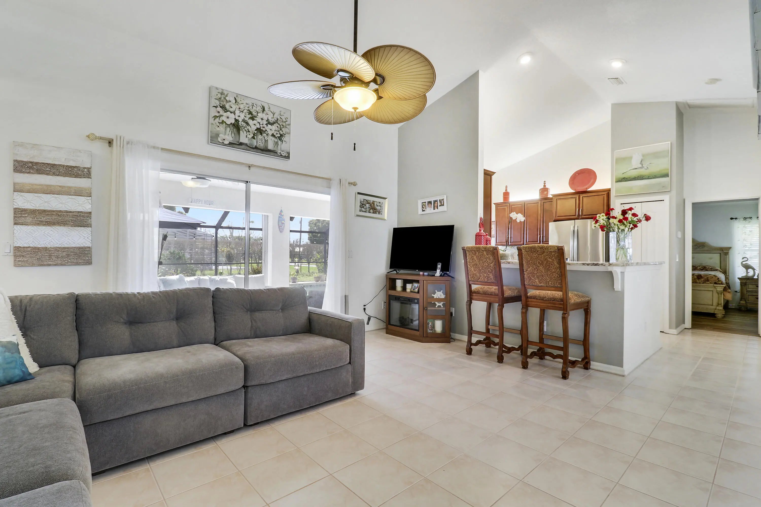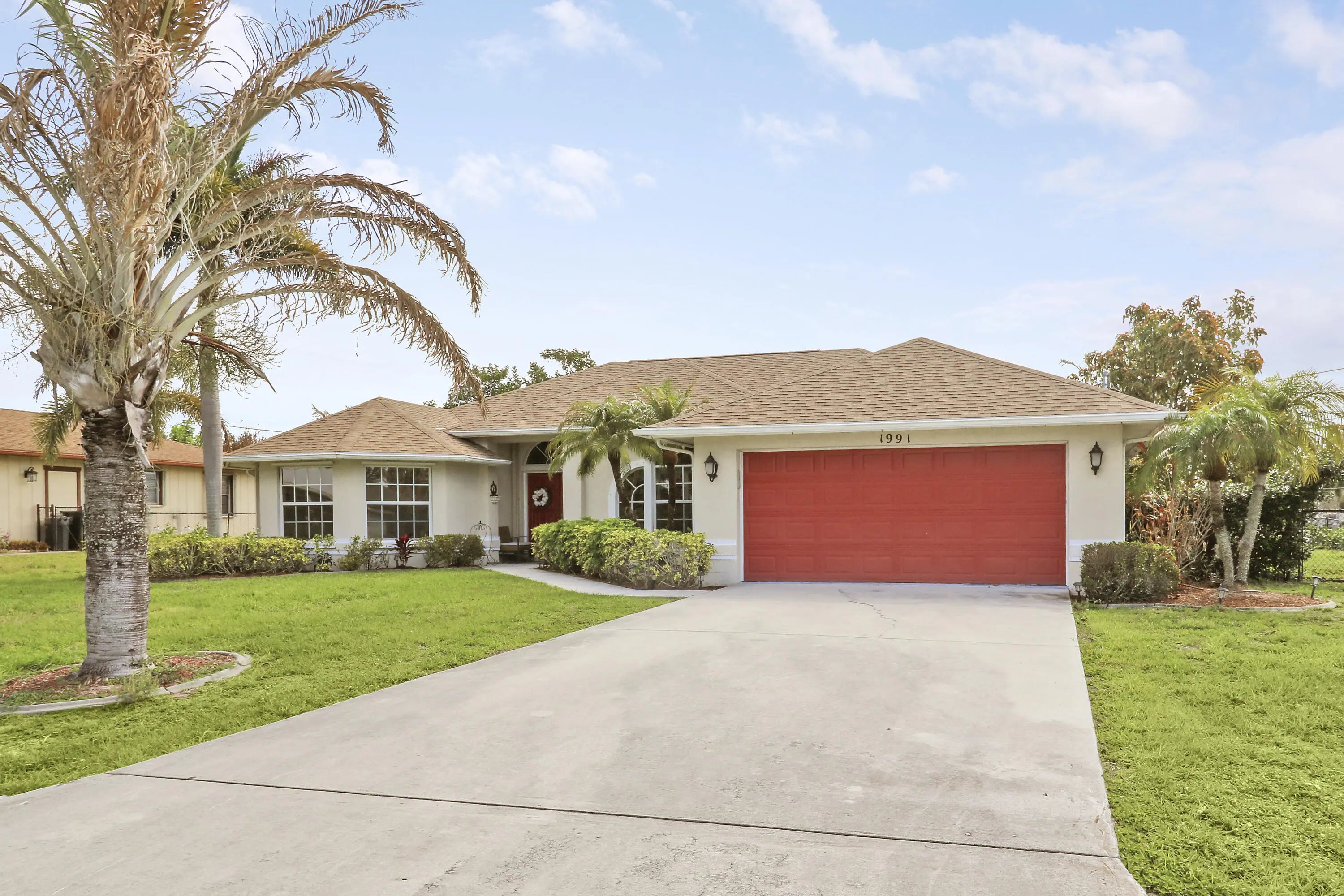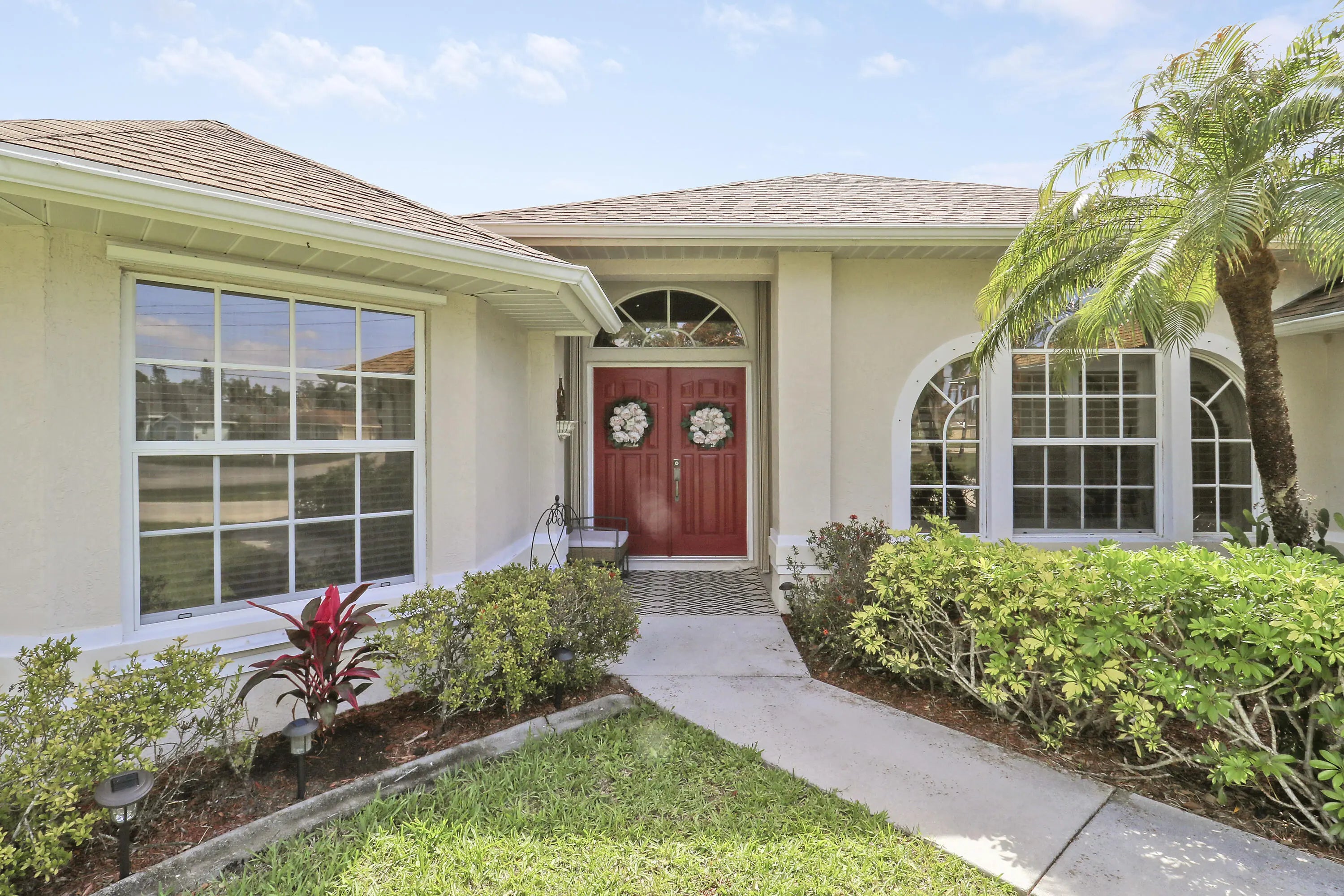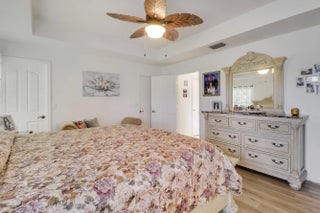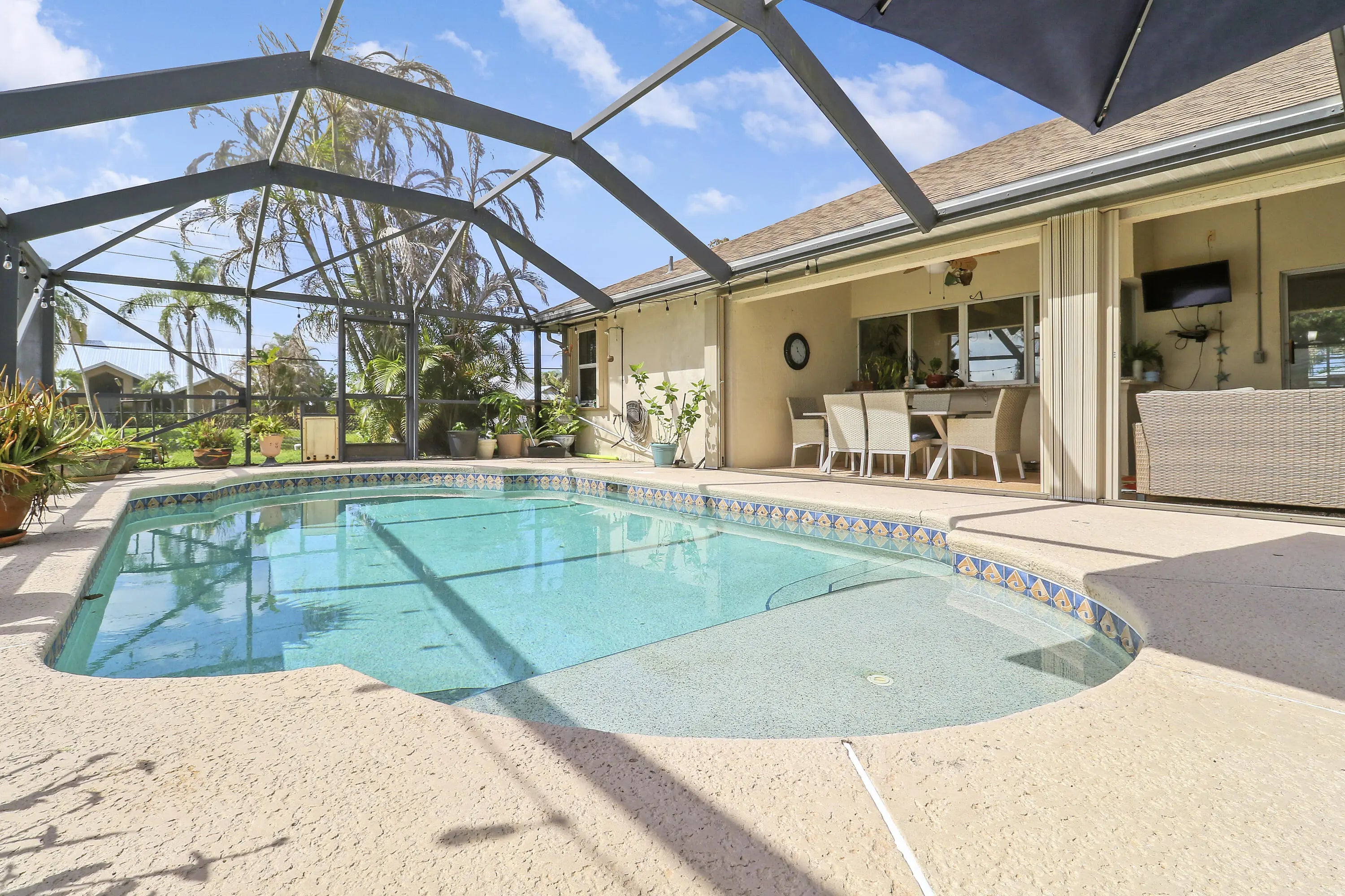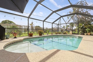 Spacious CBS 3 bedroom 2 bath plus large private family room/den pool home that sits on a 1/3 acre fenced corner lot in the heart of Port St Lucie. Relax on the 25 x 10 covered screened porch and take a swim year-round in the solar-heated pool. The upgraded kitchen includes space-saving wood cabinets, granite countertops, stainless steel appliances and a pass through window to the outside enteriaining/pool area. Additional features and upgrades include a new roof in 2020, accordian hurricane shutters which cover almost every window and door, vaulted ceilings, plantation shutters, a sprinkler system, a hot water heater (2022), pull down attic stairs which offer additional storage, and a child safety pool fence. Additional interior features include both a formal living room and a spacious 20 x 14 family room/den with bay windows and double french door entry for added privacy. Choose to serve your meals in the formal dining room, the breakfast bar off the kitchen or in the covered screened porch/pool area. Master bedroom has two walk-in closets. Master bath has separate tub, separate shower, and dual sinks. The living area has been updated with laminate wood flooring (the higher-end glue-together style). The exterior is equipped with accordion shutters on all windows except the bay window, dining room and den (that have regular aluminum shutters). Also an accordion shutter that goes across the entire back patio. Excellent curb appeal.
