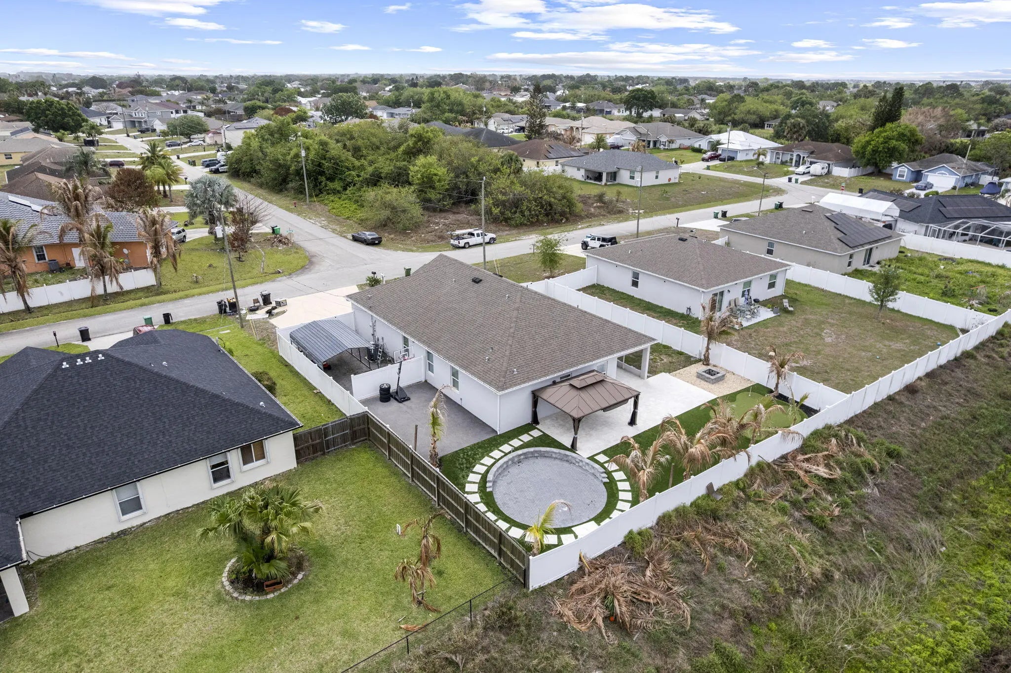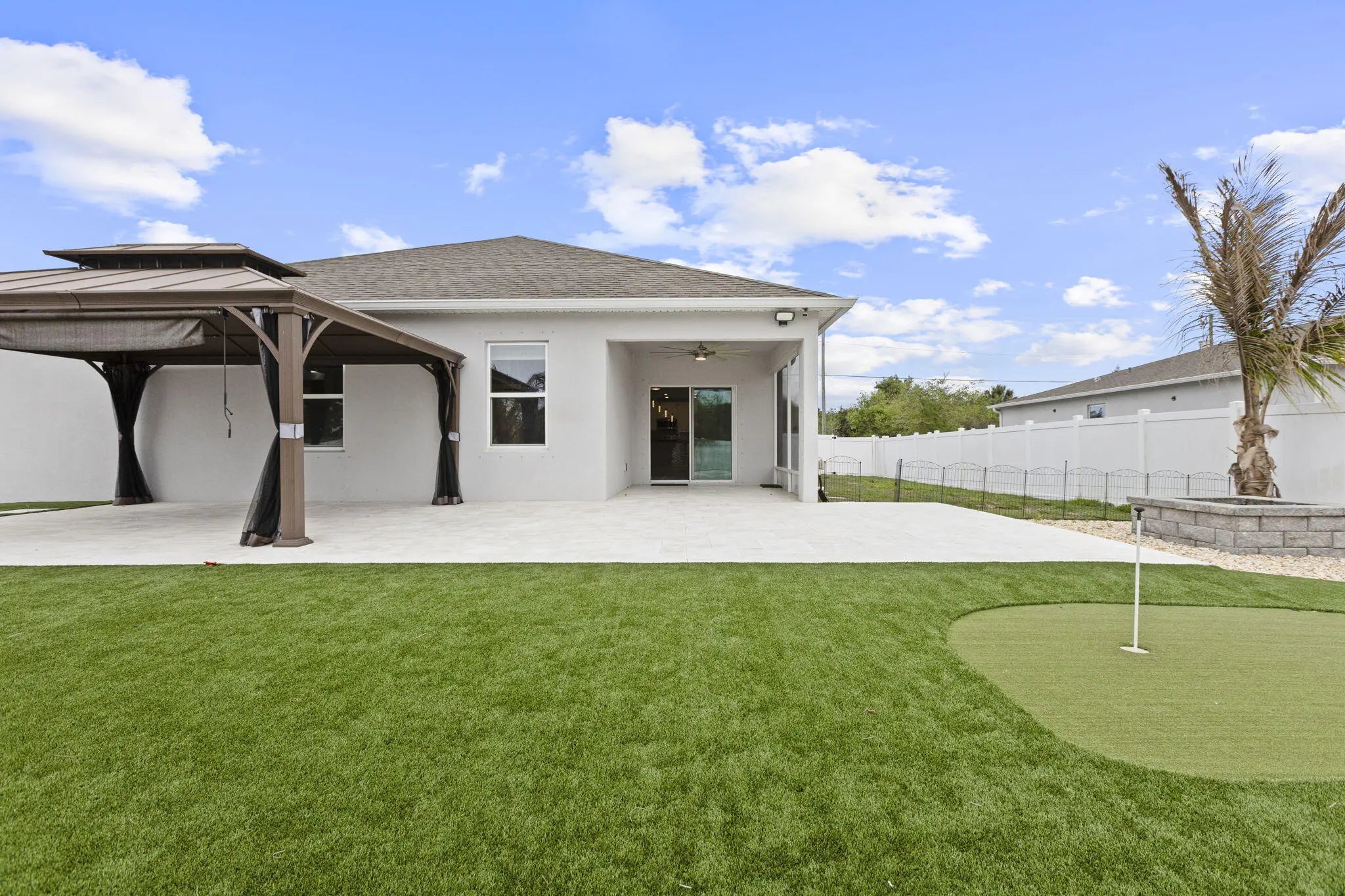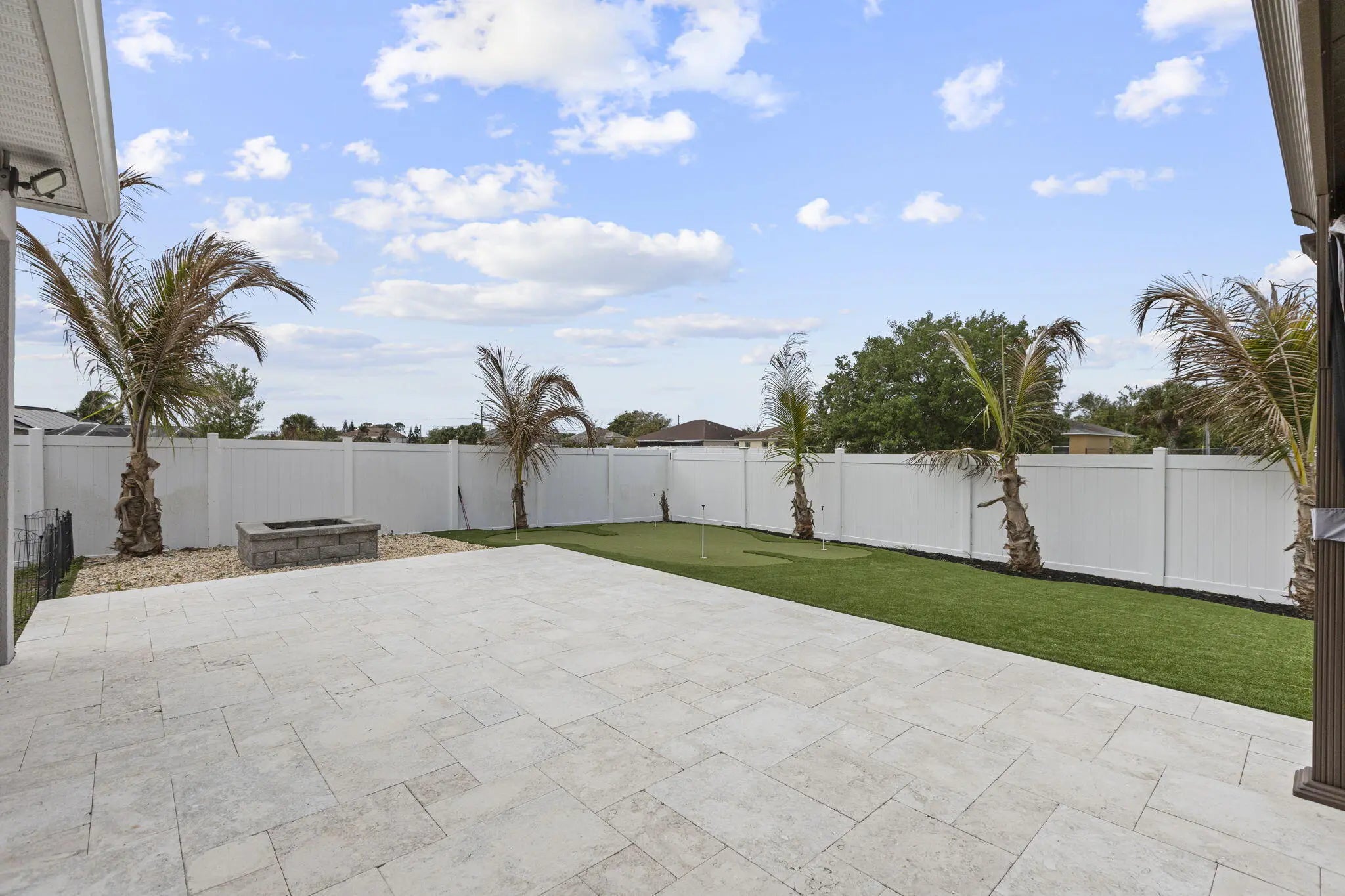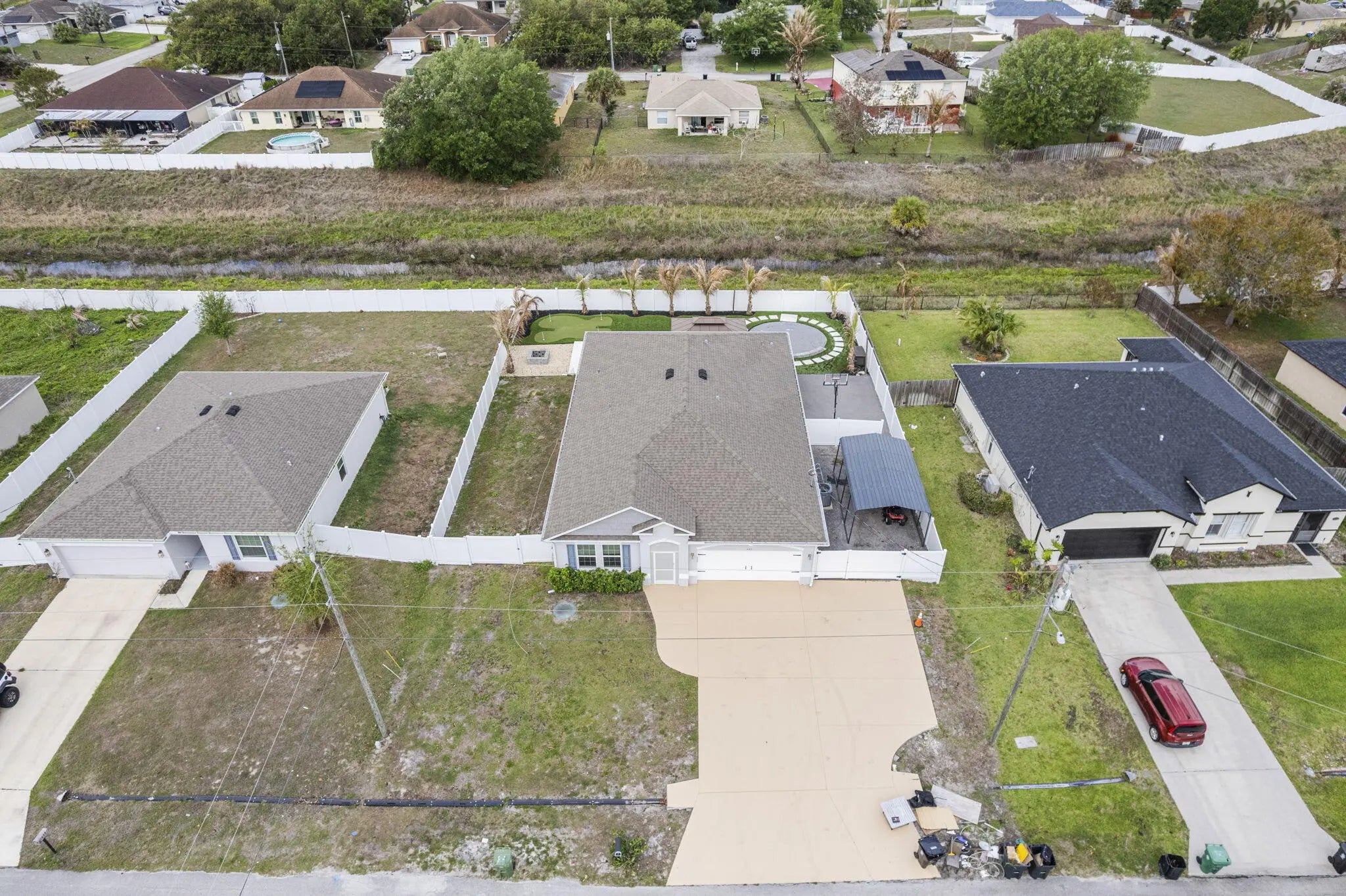 Step into your own private paradise with this upgraded 4/2/2 home featuring exceptional indoor-outdoor living on a canal. The exterior showcases a custom golf putting green with travertine tile and low-maintenance turf, a massive fire pit area, and even a mini basketball court. There is a carport perfect for all of the rec. toys, plus a spacious driveway that comfortably accommodates up to 6 cars. Inside, the home boasts of modern upgrades throughout, including brand-new appliances, luxury lighting, and upgraded tile. The kitchen is a standout feature, extra cabinetry, a custom backsplash, a coffee bar, and an island. The primary suite is designed with a tray ceiling, custom closet system and a master bath with a separate soaking tub. Don't miss your chance to own this one-of-a-kind home!