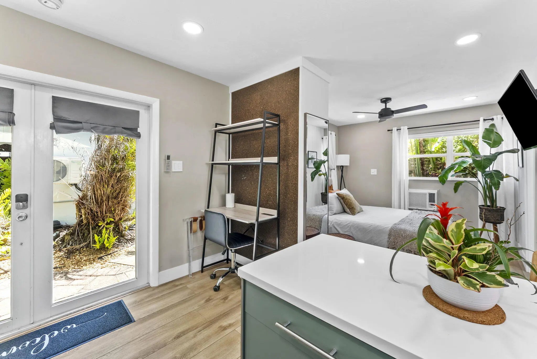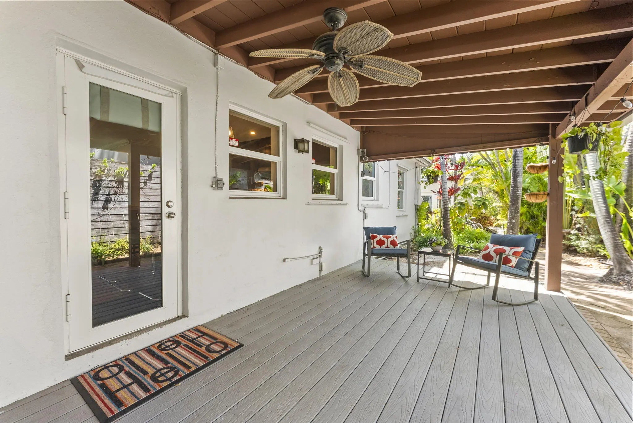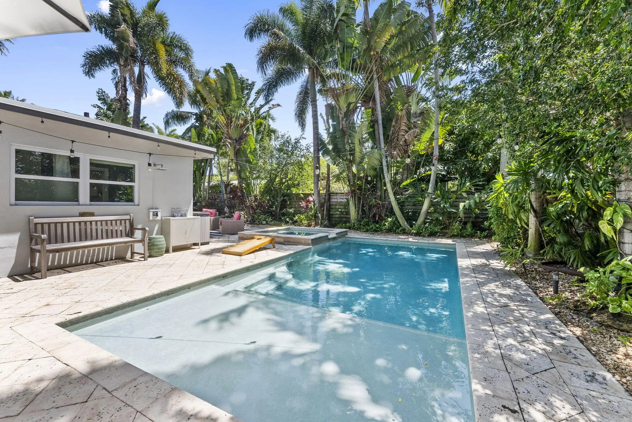 Rare opportunity in sought-after Poinsettia Heights to own two homes on one lot. The main home offers 2 bedrooms + a versatile den (currently a fully equipped at-home gym), filled with natural light and an open layout. The kitchen features stainless steel appliances and flows seamlessly into the living space. A fully renovated detached 1-bedroom, 1-bath cottage provides excellent flexibility for guests, rental income, or extended living. The private backyard is designed for vacation living with a resurfaced heated pool and spa, lush tropical landscaping, and fruit trees. Additional features include a 2022 roof, EV charger, new mini split systems, separate electric meters, and a fully fenced yard, and partial impact windows/hurricane shutters. Located near beaches, dining, and shopping.