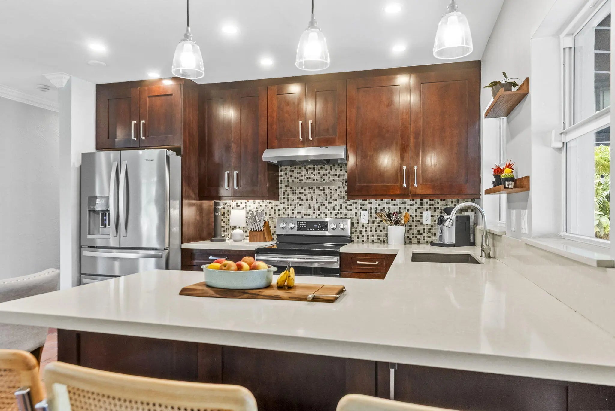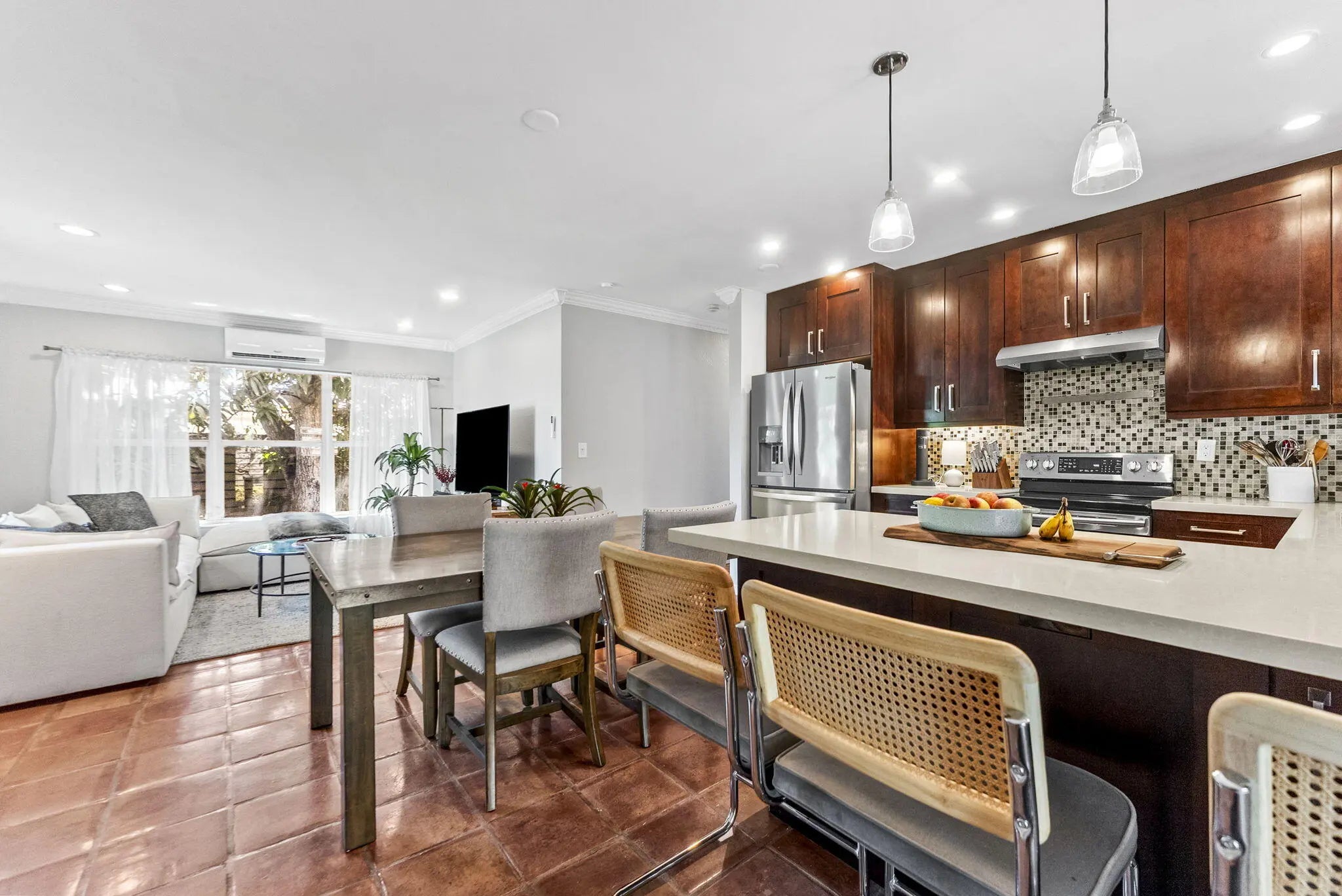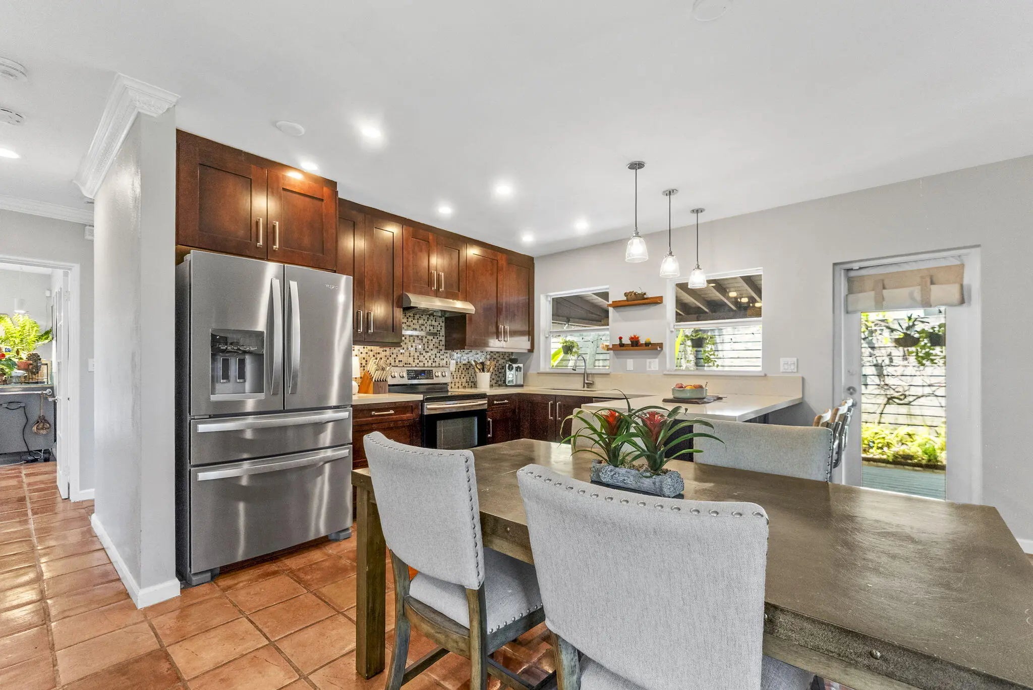 Rare opportunity in sought-after Poinsettia Heights to own two homes on one lot. The main home offers 2 bedrooms + a versatile den (currently a fully equipped at-home gym), filled with natural light and an open layout. The kitchen features stainless steel appliances and flows seamlessly into the living space. A fully renovated detached 1-bedroom, 1-bath cottage provides excellent flexibility for guests, rental income, or extended living. The private backyard is designed for vacation living with a resurfaced heated pool and spa, lush tropical landscaping, and fruit trees. Additional features include a 2022 roof, EV charger, new mini split systems, separate electric meters, and a fully fenced yard, and partial impact windows/hurricane shutters. Located near beaches, dining, and shopping.