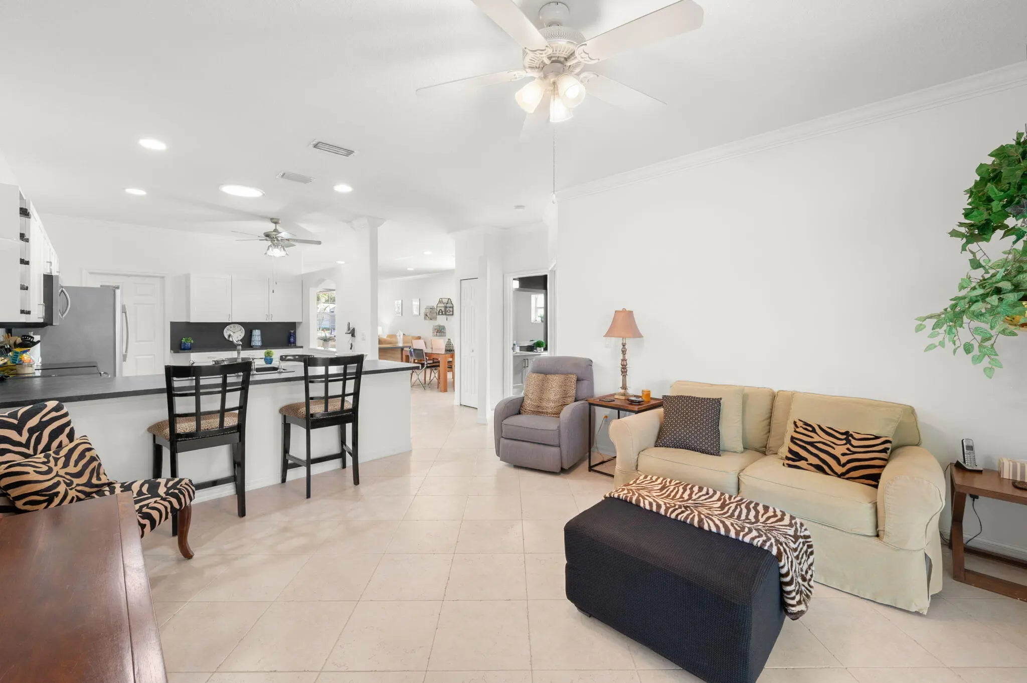 Light-filled and beautifully presented, this Kings Isle home offers a bright, open layout with an easy flow ideal for seasonal or full-time living. The kitchen features updated cabinetry, countertops, sink, and stainless steel appliances, connecting to both formal and casual living areas. Tile flooring runs through the main living areas, complemented by dark wood flooring in both bedrooms and a recently painted interior. Bathrooms have been refreshed with updated vanities, fixtures, and lighting. Spacious layout includes multiple living areas and a large primary suite with walk-in closet. Screened lanai offers a private outdoor setting. Located in a gated 55+ community with clubhouse, pool, tennis, and activities, this warm inviting home is ready to be enjoyed from the moment you arrive.