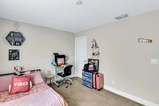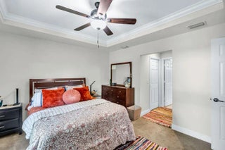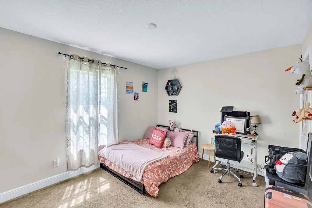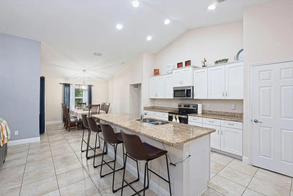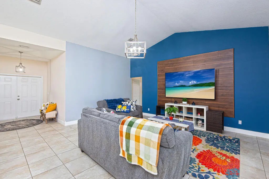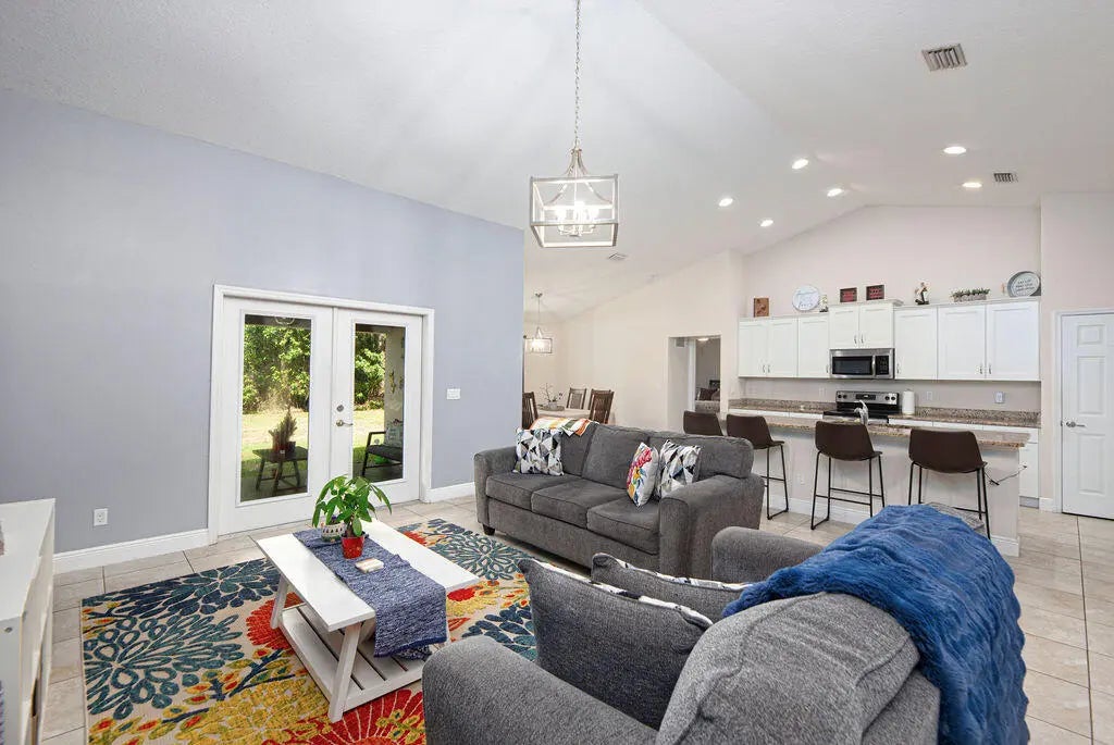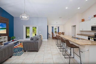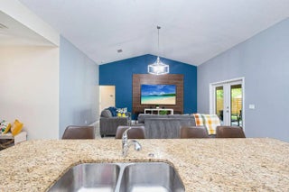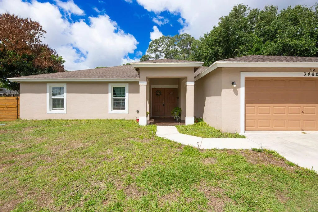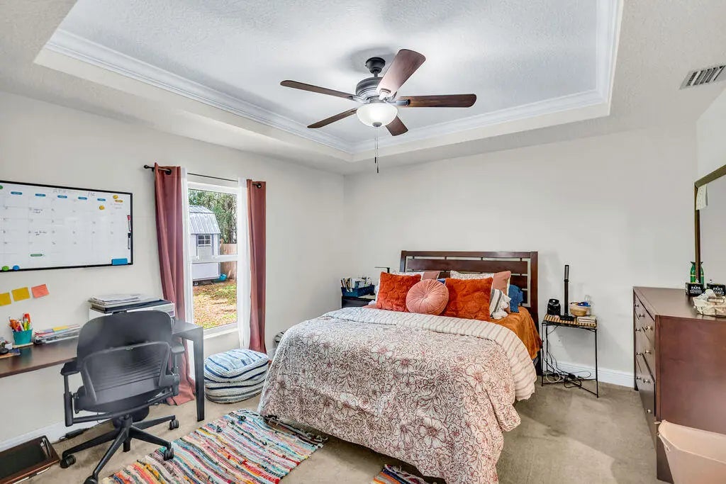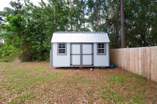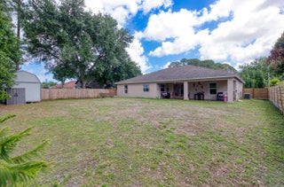 Built in 2019, this Bradford model from Synergy Homes' sought-after Gold Series offers vaulted ceilings and an open, split floor plan for both comfort and privacy. The spacious great room flows into a covered patio, perfect for entertaining. The kitchen features granite countertops, stainless steel appliances, soft-close cabinetry, and a walk-in pantry. The primary suite is a true retreat with dual walk-in closets, soaking tub, and walk-in shower. Energy-efficient features include impact glass windows and a high-efficiency A/C system. Additional highlights include, new tankless water heater (2025), a tiled front porch, tiled backyard patio, brand-new outdoor shed, and a garage with its own A/C split—ideal for a workshop, gym, or extra living space.