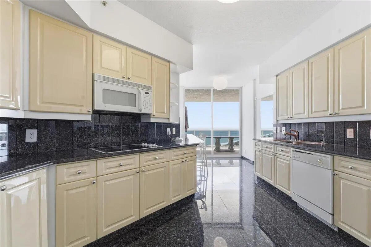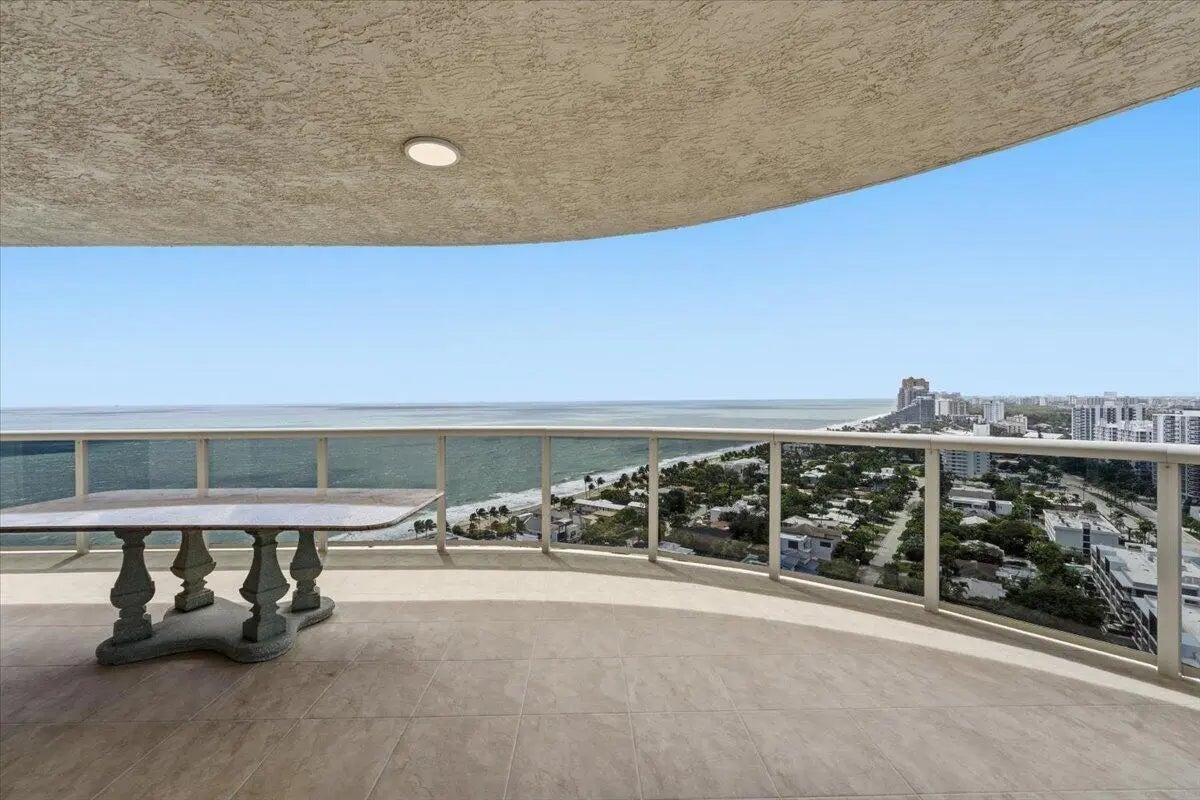DOUBLE CORNER with PANORAMIC VIEWS OF OCEAN, COASTLINE , WATERWAYS & CITY. 2 WRAP-AROUND TERRACES. Third bedroom is currently an open den. Wall can be added. Private elevator. Resort-loke complex on 10 OCEANFRONT acres with poolside restaurant and full bar, 2 pools, 2 spas, private beach pavilion with cabanas, tikis, bbq and beach attendant. 2 pets, any size. VACANT, easy to see