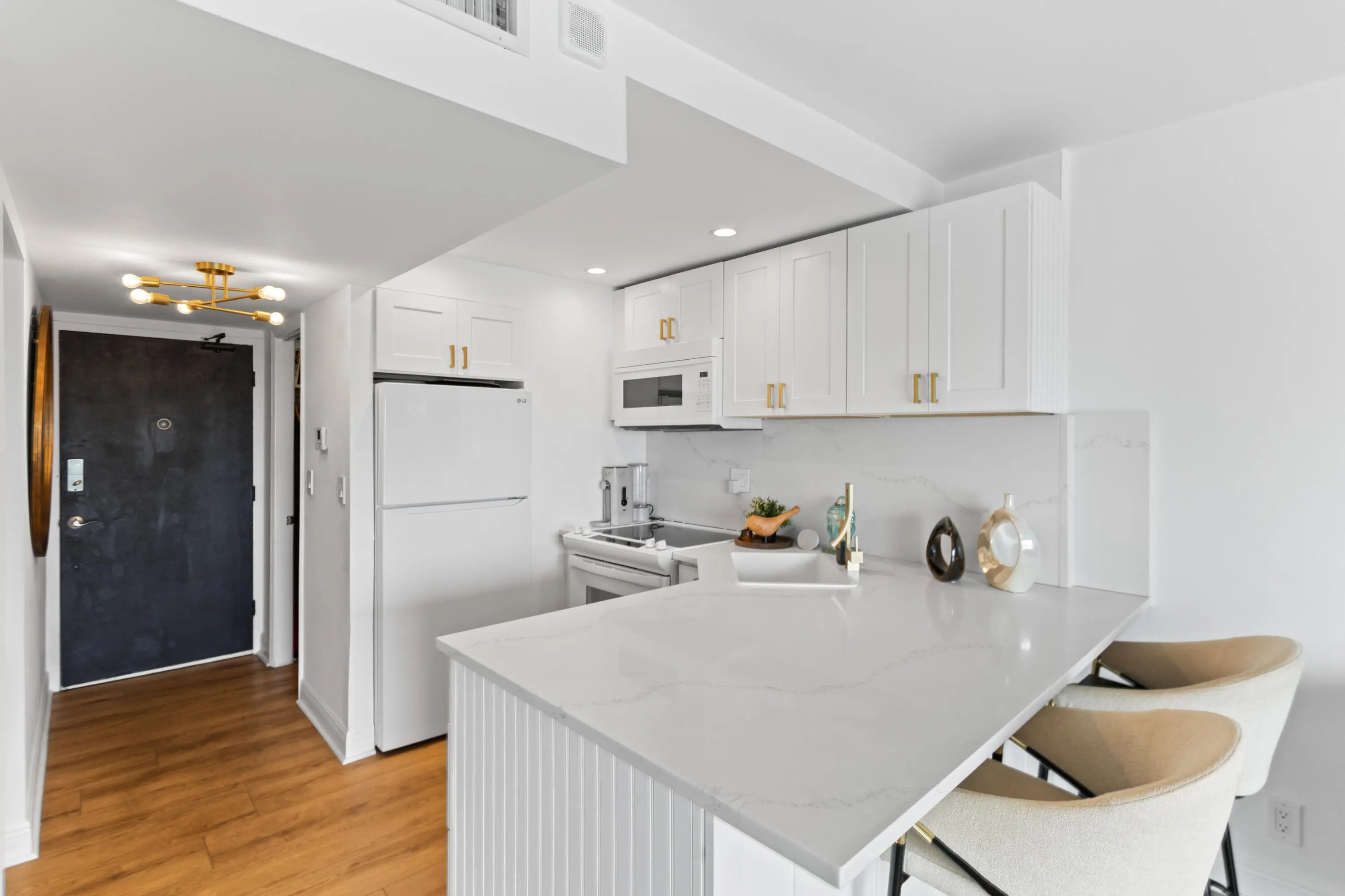 Experience boutique waterfront living in this impeccably renovated Intracoastal 5th floor studio with sweeping sunset views. Every detail has been elevated to create a refined, turnkey retreat in the heart of Fort Lauderdale. The studio has been thoughtfully redesigned incorporating a bed-nook that subtly divides the space into distinct living zones. The residence features new quartz countertops, sleek white cabinetry, new appliances, new vinyl flooring, motorized blinds with custom curtains, a modern vanity, and a fully customized walk-in closet. Additional same-floor storage adds convenience, and the option to purchase furnished allows for an effortless move-in. This is a rare opportunity to own a well-located, move-in-ready sanctuary on the Intracoastal with low HOA fees. Walking distance to restaurants and shopping. Building located in a quiet neighborhood.