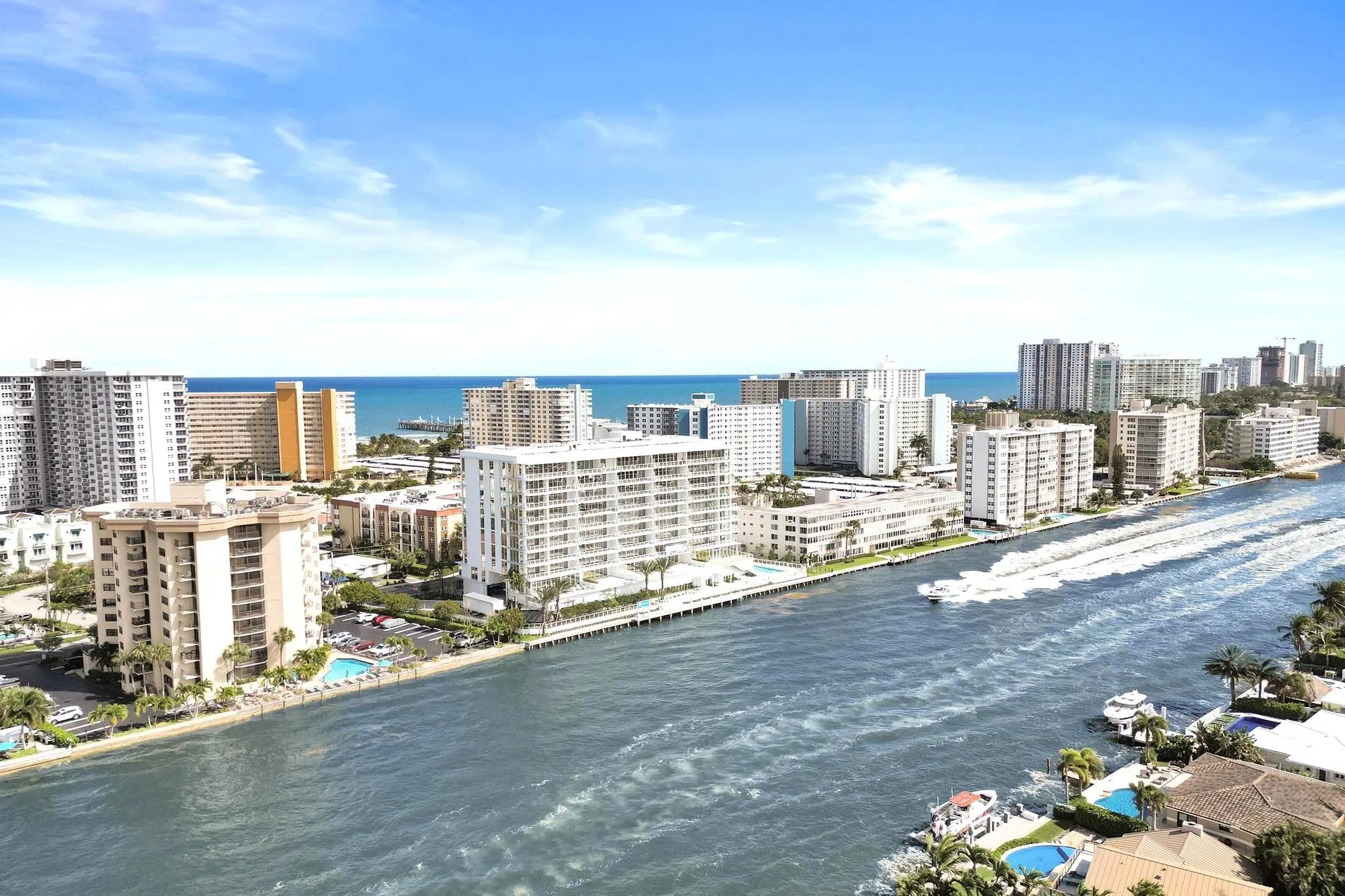 Elevated waterfront residence with expansive terrace and sweeping Intracoastal views. Experience boutique living in one of the only newly constructed condominiums directly on the Intracoastal in Pompano Beach. This exclusive 10-story building offers just 42 residences. Offering 1,639 square feet of interior space, the residence features a private terrace of approximately 400 square feet overlooking the Intracoastal—ideal for relaxing or entertaining while enjoying views of passing boats and the surrounding waterfront. The flow-through layout provides both sunrise and sunset exposures, enhancing natural light and creating a seamless indoor-outdoor connection. A private elevator entry opens into a bright, open-concept interior with wide-format flooring, custom cabinetry, and contemporary finishes. Residents enjoy a curated collection of amenities, including a waterfront pool, fitness center, and social spaces. Flexible rental guidelines further enhance long-term value.Located just minutes from the beach, waterfront dining, and the vibrant Pompano Pier lifestyle, this upper-level residence offers enhanced privacy and strong value within this boutique waterfront development. Photos shown are from a completed and professionally staged unit and are for illustrative purposes only. Actual residence may vary in finishes, layout, and views.