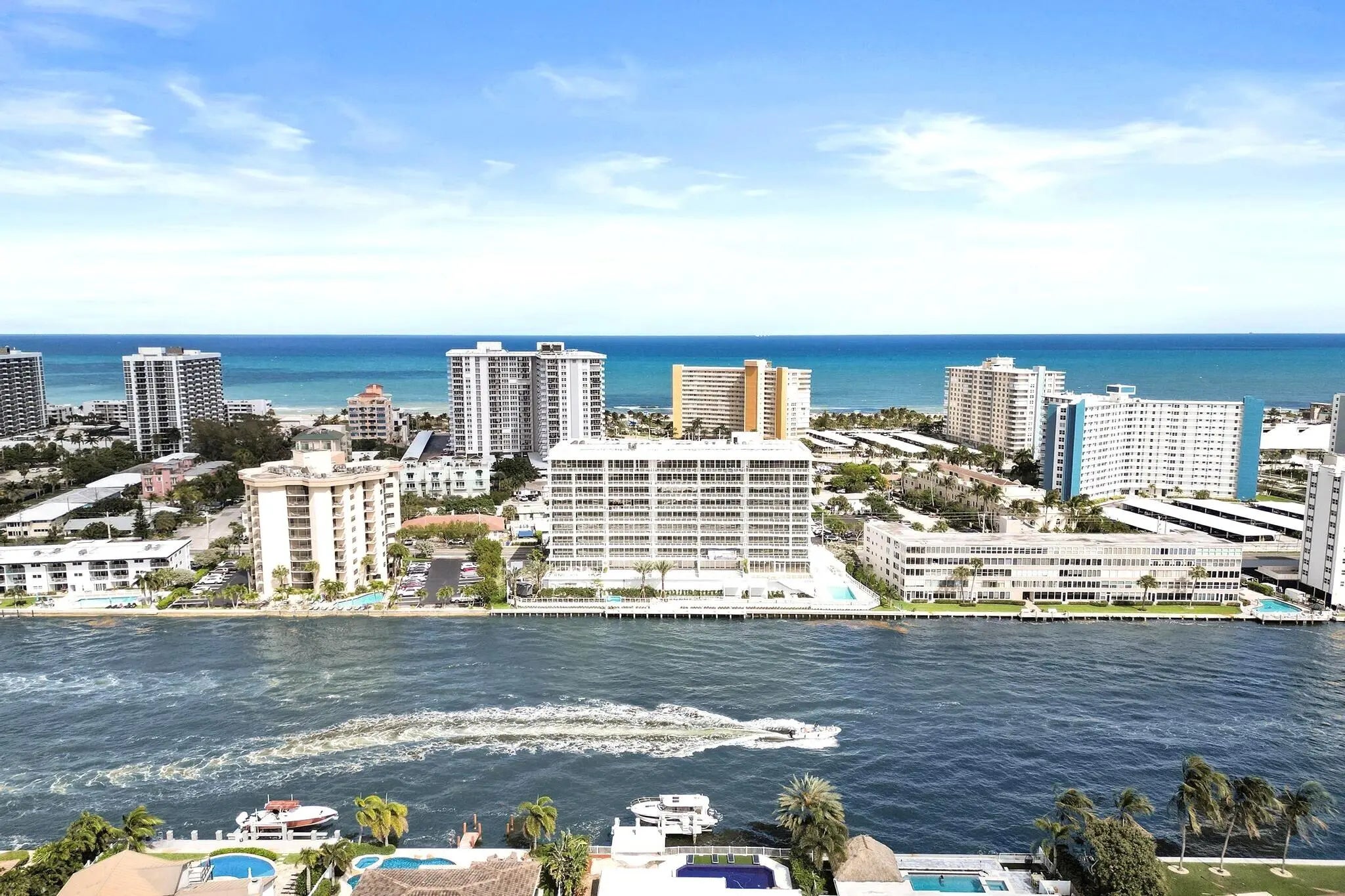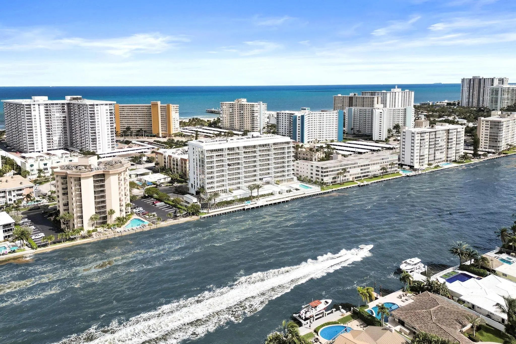 Upper-floor waterfront residence with expansive terrace and panoramic Intracoastal views. Experience elevated living in one of the only newly constructed boutique buildings directly on the Intracoastal in Pompano Beach. Limited to just 42 residences across 10 stories. The residence features a spacious private terrace of approximately 400 square feet overlooking the Intracoastal—ideal for outdoor living while enjoying views of passing boats and the vibrant waterfront. The flow-through layout provides both sunrise and sunset exposures, enhancing natural light and creating a seamless indoor-outdoor connection. A private elevator entry opens into a refined interior with modern finishes, custom cabinetry, and an open-concept design. Residents enjoy a curated collection of amenities, including a waterfront pool, fitness center, and elegant social spaces. Flexible rental guidelines further enhance long-term value and income potential. Located just minutes from the beach, waterfront dining, and the vibrant Pompano Pier lifestyle, this upper-floor residence represents a unique opportunity within a limited collection of boutique Intracoastal homes. Photos shown are from a completed and professionally staged unit and are for illustrative purposes only. Actual residence may vary in finishes and views.