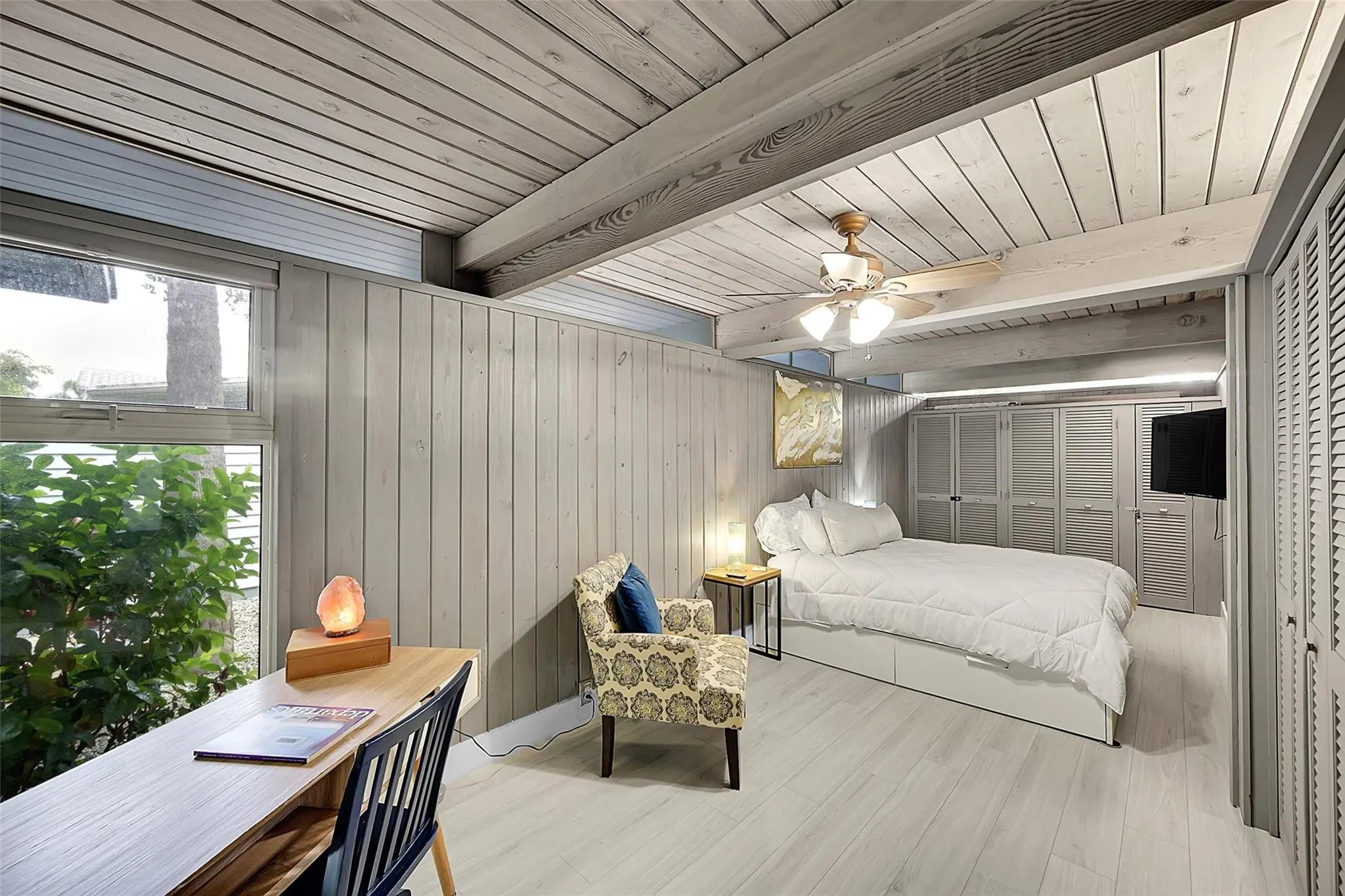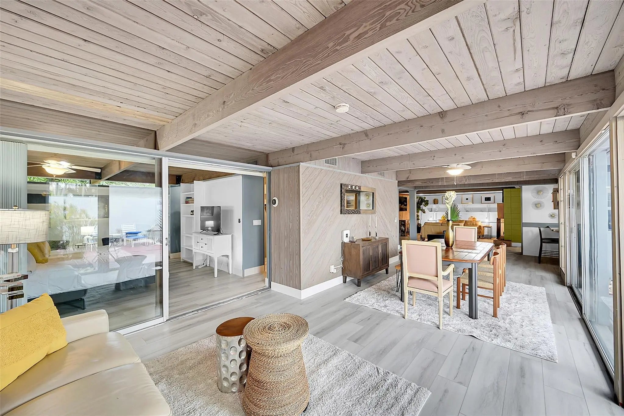 Spacious beach house designed by renowned architect Dan Duckham in Lauderdale by the sea. Three blocks to beach with no through traffic. Mid century modern design. Updated with new air conditioner, impact doors and windows, kitchen, electric, and roof. Huge master suite with walk in closet, amazing views, and gorgeous bathroom. Wood burning fireplace, open plan living room with walls of sliders for amazing views. Frank Lloyd Wright inspired, open beams, & wall tops w-glass = lots of natural indirect light! ALL NEW FLOORING! HOME CAN BE RENTED FOR 6 MONTHS. ALSO AVAIL AS SHORT TERM RENTAL ON VRBO AND AIRBNB. Not available until AUGUST 1, 2026