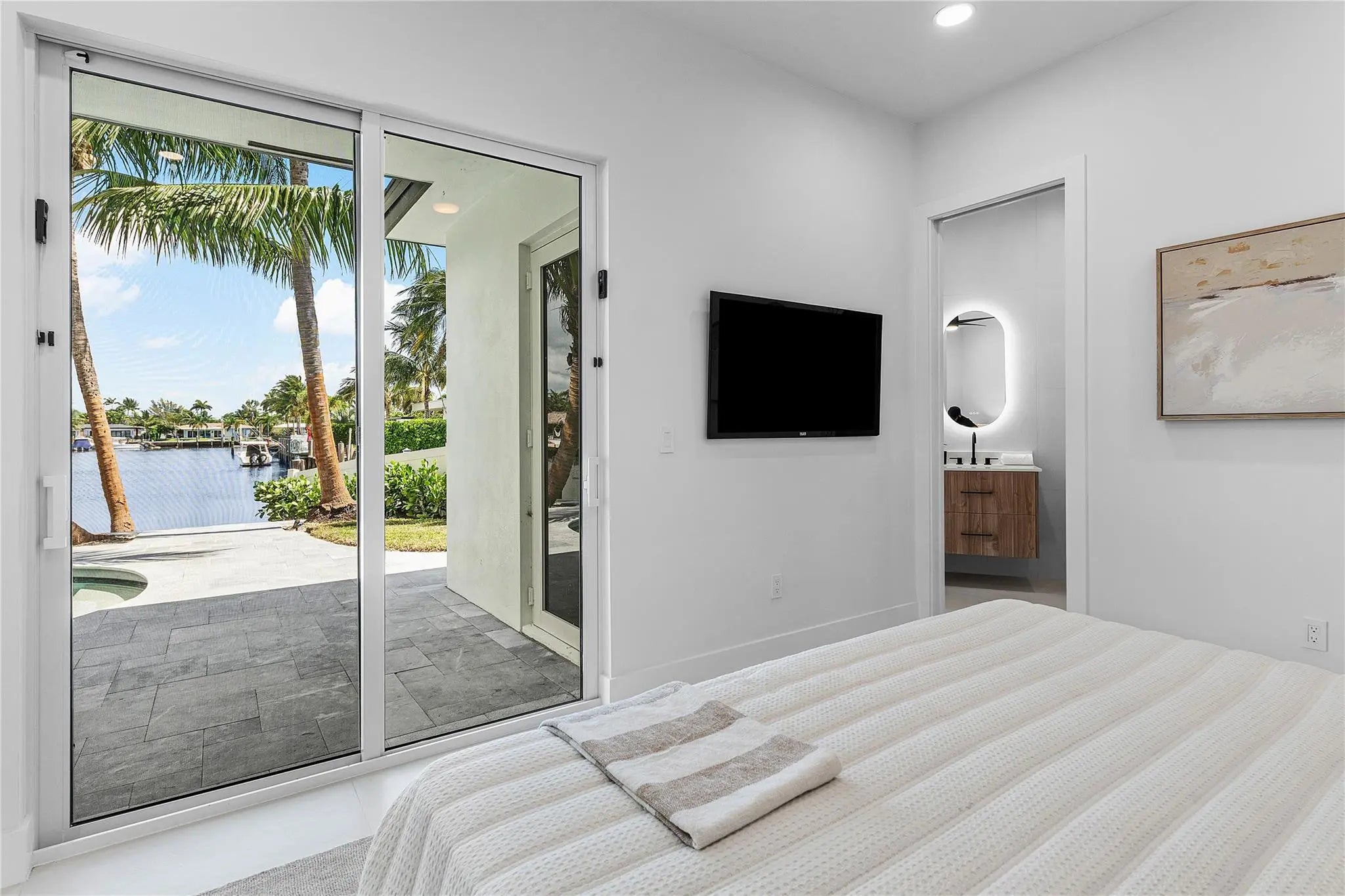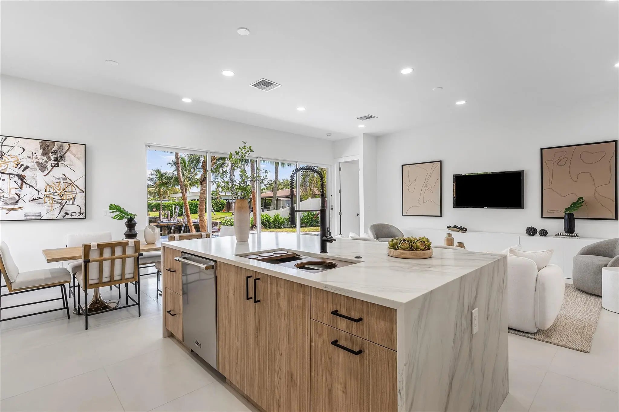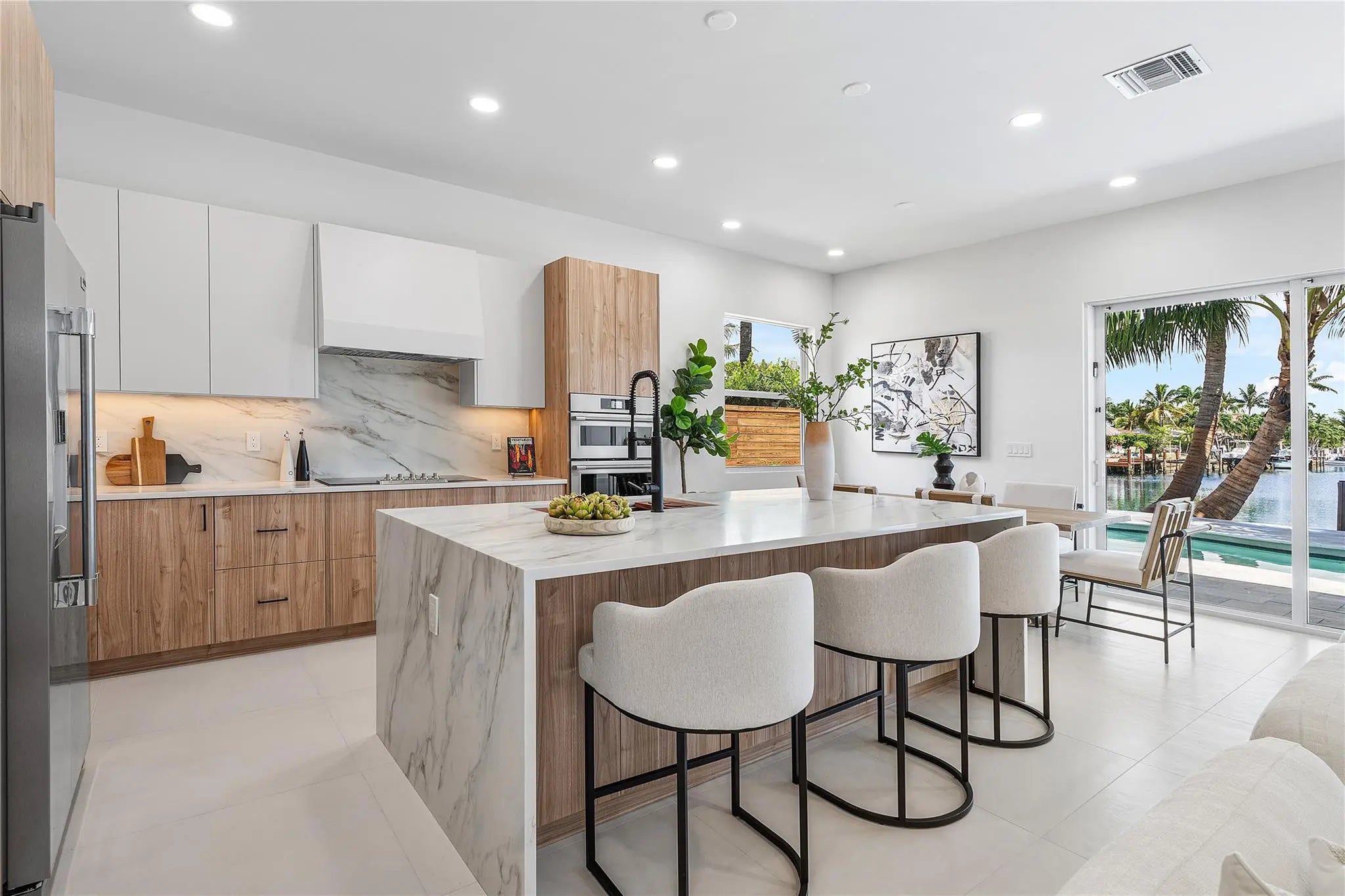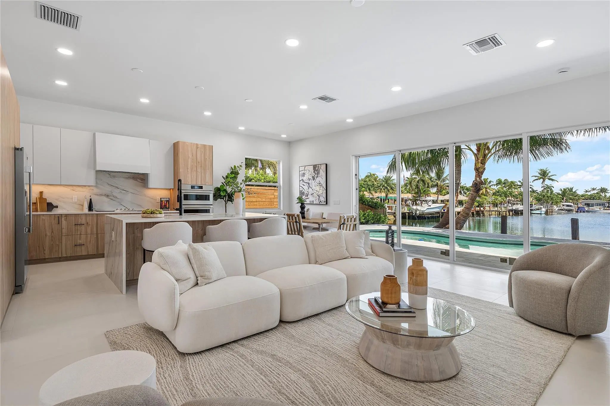 Nestled in the heart of Garden Isles, this new construction waterfront residence offers 50 feet of pristine water frontage with direct Intracoastal access. Thoughtfully designed to balance modern sophistication with inviting warmth, this 3-bedroom, 3-bathroom home is the epitome of effortless coastal living. Step inside to discover light-filled, open-concept living spaces where expansive sliders frame sweeping water views and create a seamless indoor-outdoor flow. At the center of the home, the designer kitchen features custom cabinetry, 10 foot ceilings, and a layout tailored for both daily living and elegant entertaining. This is truly a boater's dream.