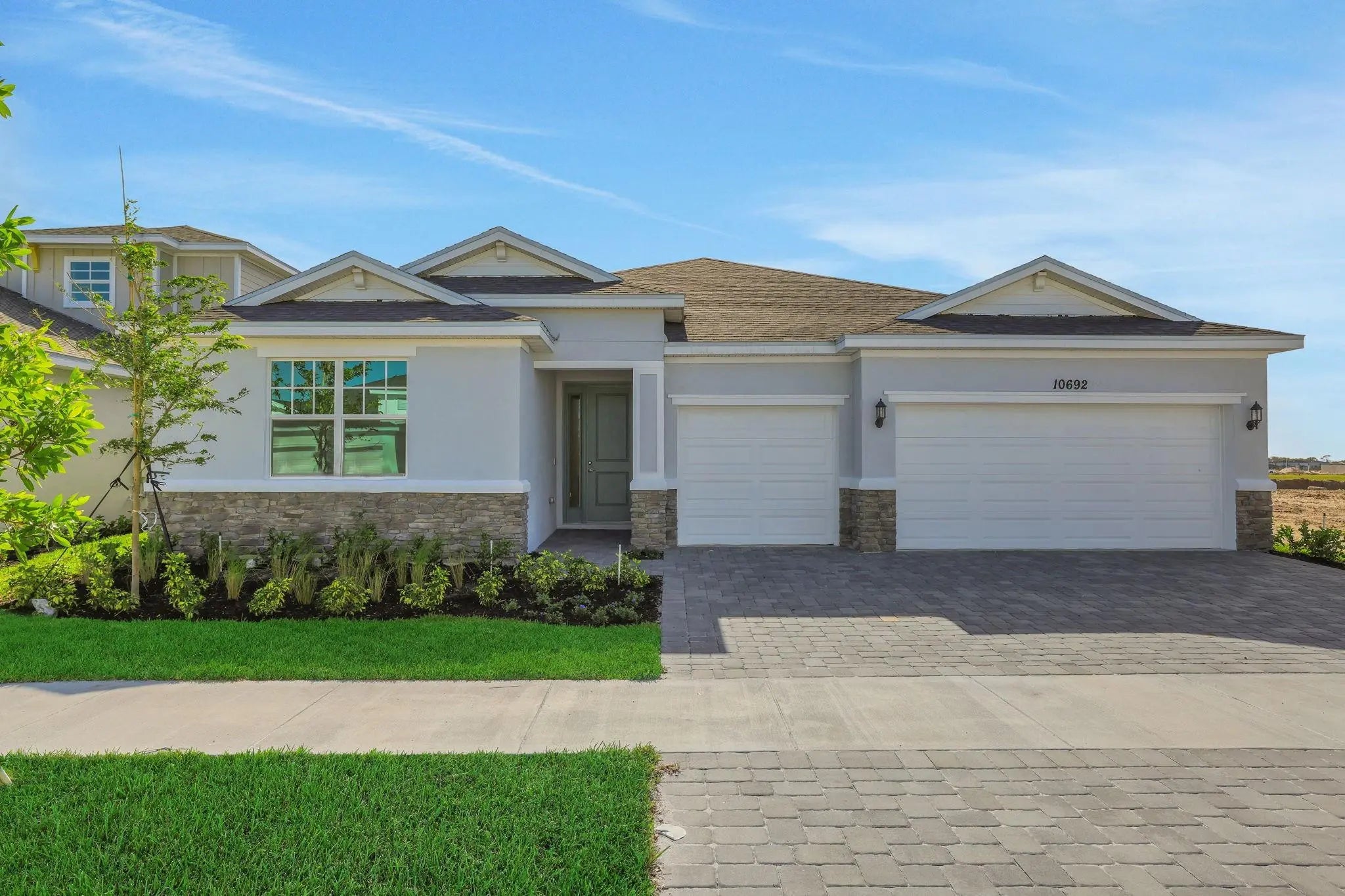 The Catalina, a stunning single-story home featuring 3 bedrooms, 2 bathrooms, which feature double vanity sinks, and a spacious 3-car garage within 2,211 square feet of thoughtfully designed living space. The open-concept kitchen includes a large island and flows effortlessly into the living and dining areas, creating a bright and inviting space perfect for both relaxing and entertaining. A separate dining space off the great room a more formal setting for meals and gatherings. The primary suite includes an expansive walk-in closet for ample storage and a connected private bathroom. Multiple windows throughout the house fill every room with natural light, enhancing the open and airy feel. A lanai extends your living space outdoors, offering a seamless connection to fresh air and nature.