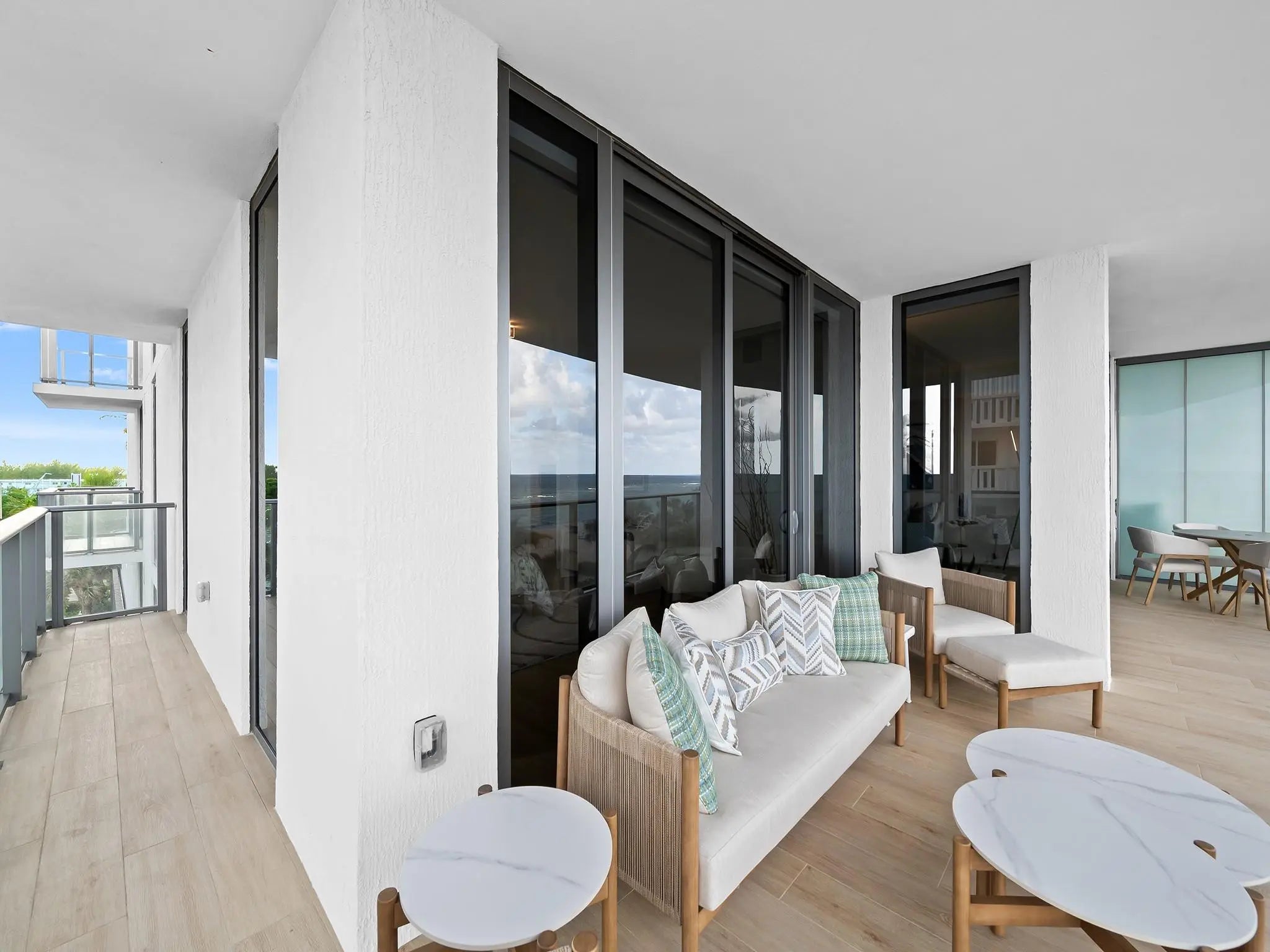 Feel the ocean from every angle open the east terraces to hear the waves, breathe salty air. This residence feels like a private beachfront retreat where the outdoors blends with your living space. This furnished, like new southeast corner unit offers 2,600 sq. ft. of light filled interiors wrapped in floor to ceiling glass with private elevator entry. The split floor plan ensures privacy, the primary suite has direct ocean views and a large walk-in closet, while two bedrooms sit on the opposite side. A den suits a media room, office, or guest area. Just above sea level, the home surrounds you with the calming soundtrack of the shore. Amenities include private beach, two pools, a fitness center with spa, sauna, and yoga studio, plus a coffee lounge, theater, wine room, club room.