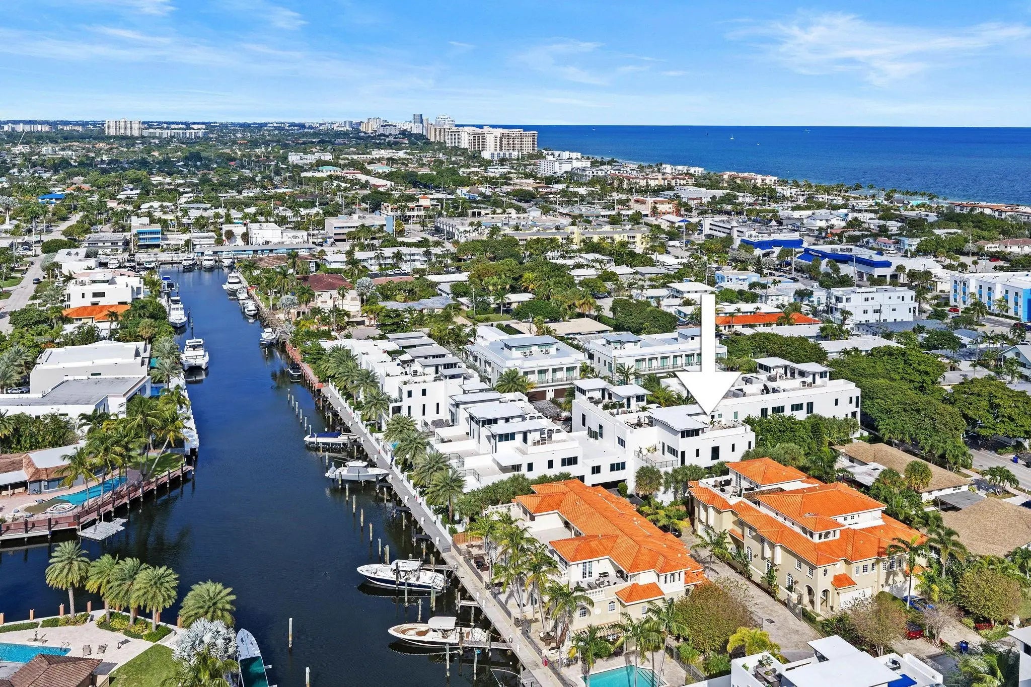 BOAT DOCK INCLUDED with a value of $175K that can be sold to another resident in the community. No fixed bridges. Enjoy the beach and boating lifestyle in this modern masterpiece at Sky 230. Constructed in 2017 this end unit of 3090 sq ft offers 3 interior levels plus a stunning roof top terrace and summer kitchen with distant ocean views. Along with the 2 car garage the living space is on the ground level and a private rear patio. The sumptuous master suite encompasses the entire 3rd floor and consists of 2 walk in closets, huge bathroom and spacious bedroom with windows on 3 sides. The unit is equipped with a gas stove and tankless HWH. There are toto toilets throughout, impact glass, Italian porcelain floors, German cabinetry and an elevator. Walk to the beach, dining and nightlife.