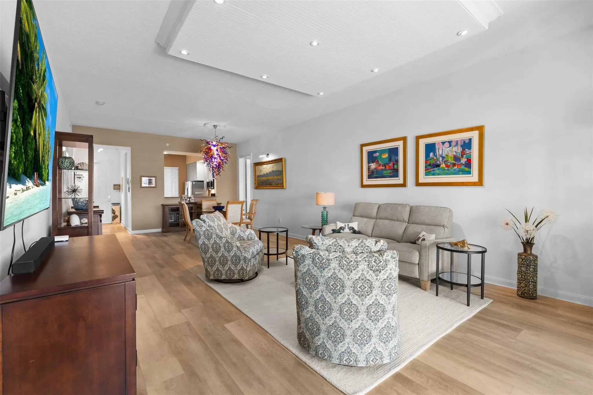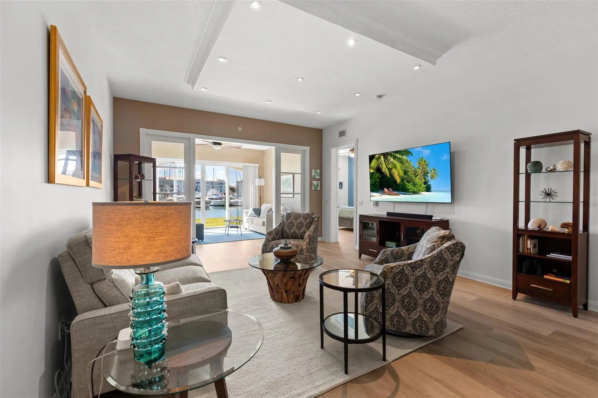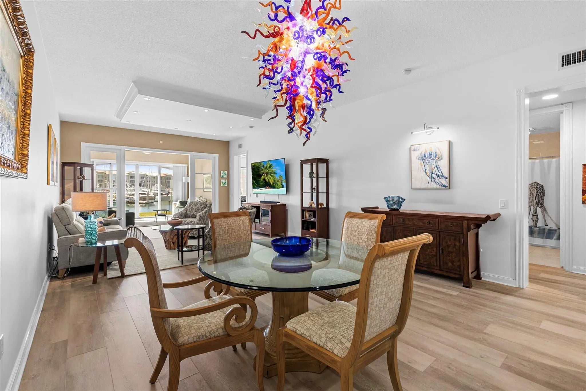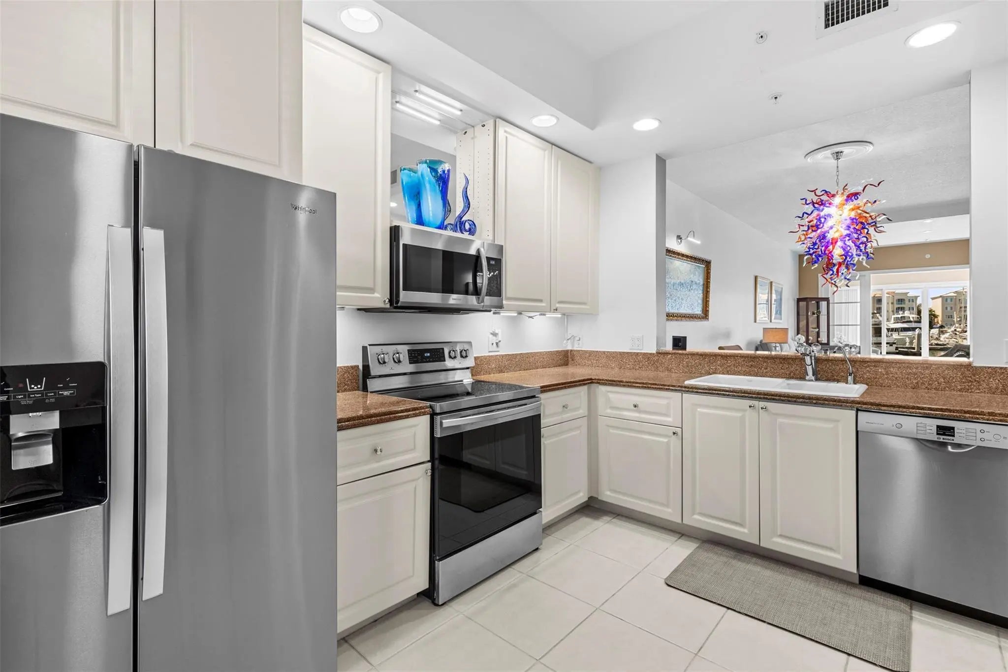 Outstanding value for this beautifully updated condo that's being sold turn-key with stylish furnishings and gorgeous marina views. So many upgrades including a custom ''Chihuly-like'' 5 foot chandelier, several one-of-a-kind fused glass pieces, wide plank luxury vinyl flooring thru-out, built-in wooden pull-outs in kitchen cabinets, stainless appliances including a Bosch dishwasher, custom picture lighting installed showcasing art, and recessed lighting added in living room. These condos were constructed w/ poured concrete walls, impact windows/doors, high ceilings, open floorplans, flex room off laundry room for office/add'l sleeping, 24-hour security guard, & outstanding amenities including club-like pool, gym, walking paths, & clubroom. Walk to the inlet, tiki bars, & d'town Ft Pierce!
