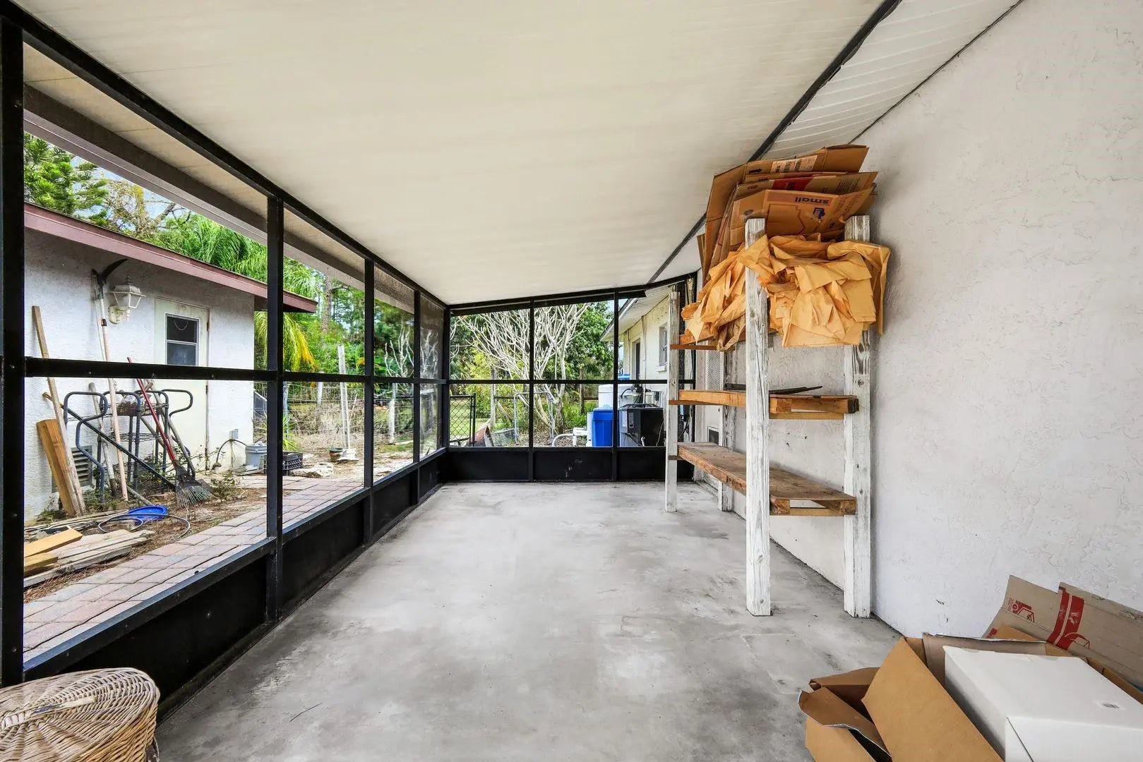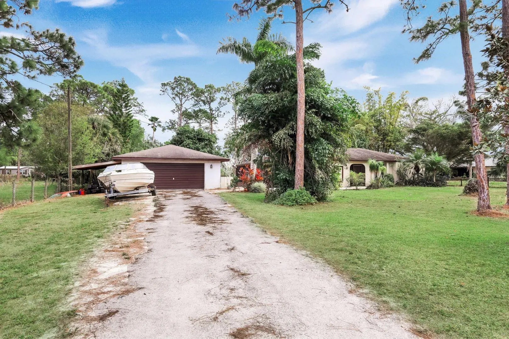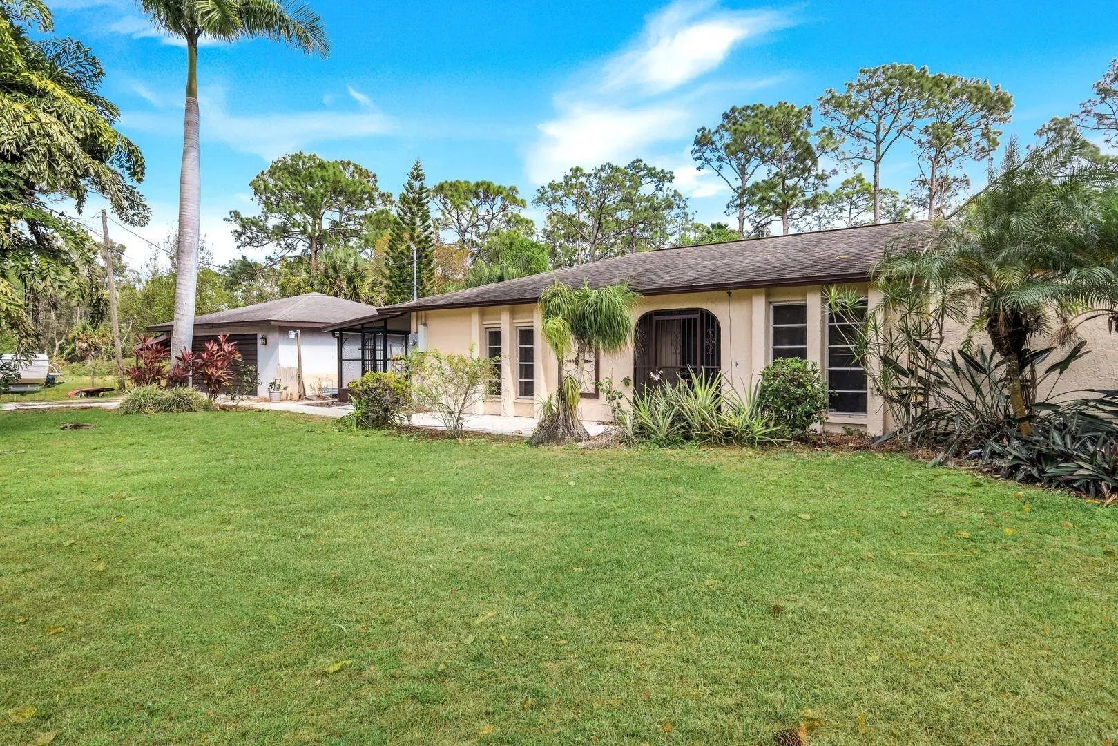 1+ ACRE AG2 3/2/2 POOL HOME MINUTES TO I75! Set on approximately 1.10 acres in unincorporated North Fort Myers, this private tree canopied property offers a true Old Florida setting with exceptional privacy and mature tropical landscaping. The 3 bedroom 2 bath home features 1,816 sq ft under air tile throughout vaulted ceilings updated kitchen counters and a detached garage. Enjoy a fully functional fiberglass pool and large screened lanai overlooking the lush backyard. Fully fenced with a long driveway ideal for pets RV boat or toy storage. No HOA. Located in Flood Zone X never flooded and performed well through storms since 1983. Minutes to I75. Home needs some updates bring your vision and make it your own.