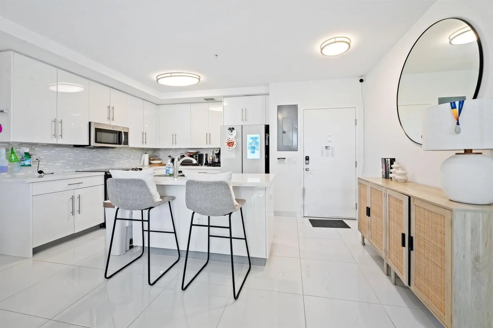 Bright condo in newer, boutique & pet friendly, secured building in the heart of Aventura and just a few blocks from the ocean. Luxury Italian kitchen with wood cabinetry, island, quartz countertops & S.S. appliances overlooking dining and living area. Great open floor plan. 2 bedrooms, 2 bath plus a den with window that can be used as an office/playroom or a 3rd bedroom. Porcelain tile floors in living area. Walk-in closets. Smell the ocean breeze right from your balcony. Impact windows & sliding doors. Washer/dryer in unit. Elevator in building. 2 parking spots. Low HOAs. Annual leases only allowed. HOAs include water, wifi, exterior insurance, common areas & community pool. Seller will credit buyer towards new carpets & interior paint. Close to airport, Aventura Mall & major highways.