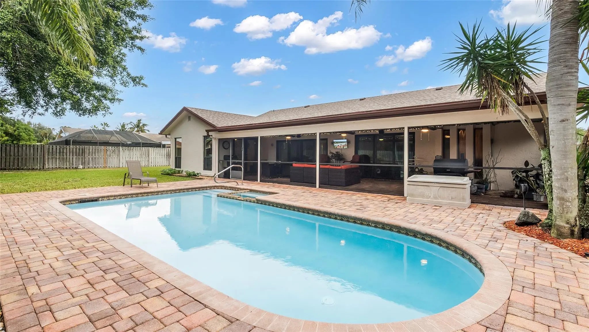 Meticulously maintained Boca Chase pool home! Rare neighborhood with LARGE lots. Beautiful concrete driveway & walking path lead to screened front porch with hurricane impact double doors. Vaulted ceilings, travertine flooring in main areas, wood flooring in bedrooms, tall baseboards and warm colors throughout. Traditional styling includes real wood kitchen & bathroom cabinetry, stone countertops. ALL GLASS IMPACT RATED! Huge fenced back yard, tropical landscaping and NO NEIGHBORS to the rear. In-ground salt pool, large covered brick deck & covered patio. Family room bar is removable. Newer roof, pool resurfacing, AC, water heater, more. Boca Raton A rated schools! Parks everywhere! You’re near beaches, malls, Mizner, tons of shopping, restaurants, airports, and lots more. THIS IS BOCA!