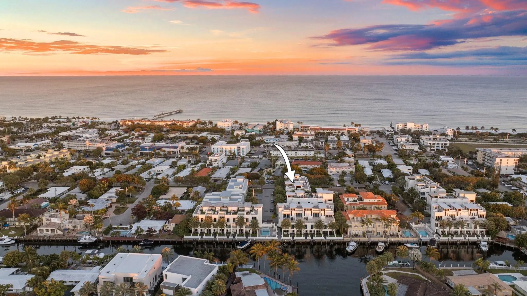 Exquisite ~3000 sf luxury three-story townhome crowned by expansive rooftop terrace w/360 ocean & city views! Floor to ceiling impact windows, ten foot ceilings & floating staircase masterfully blend modern elegance & coastal serenity provide the pinnacle of SoFlo lifestyle. Only 21 homes. Low HOA fees. Private elevator garage to rooftop. Custom Hacker cabinets, quartz countertops, Wolf gas top, Sub Zero fridge & Wine bar create chef's kitchen. Control4 system runs audio, lighting, temp, security. Four spacious ensuite bedrooms w/balcony. Hunter Douglas remote-controlled shadow blinds throughout. Concrete construction, Sprinkler system throughout & Generac generator. Only six minute walk to beach, music, shops, & dining. 2 Pets welcome. Private dock available to purchase. BRING ALL OFFERS