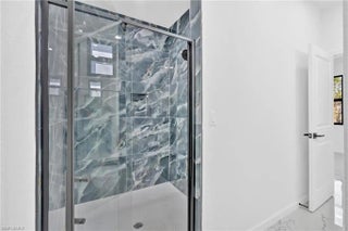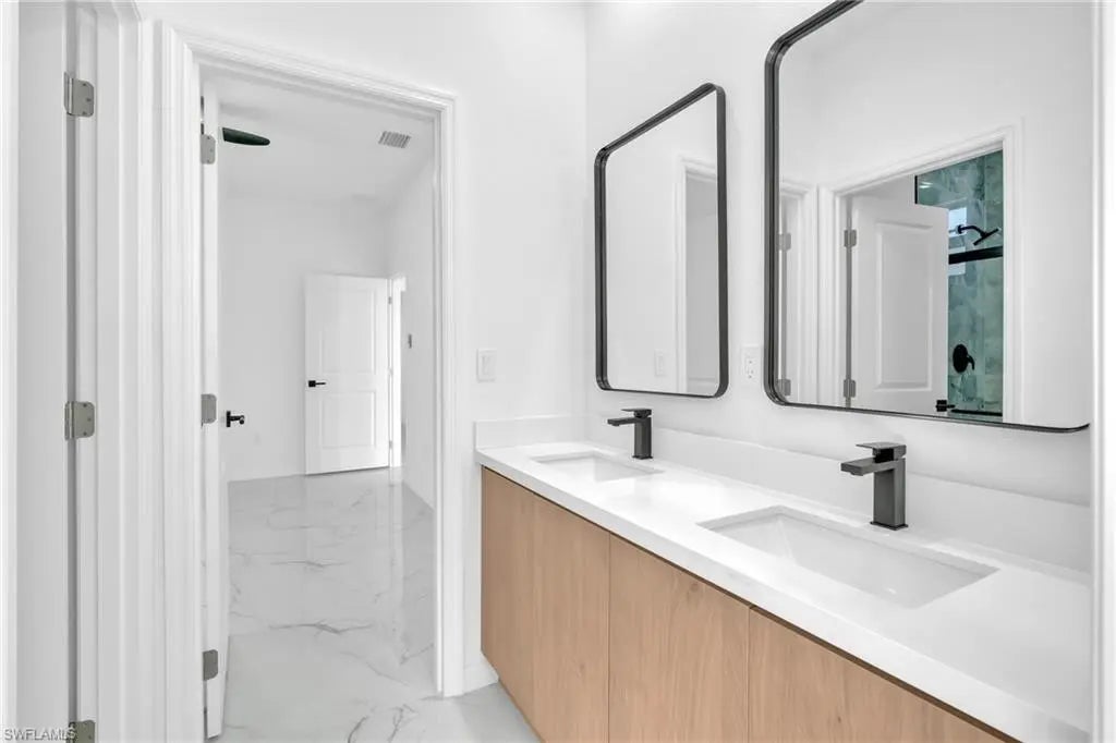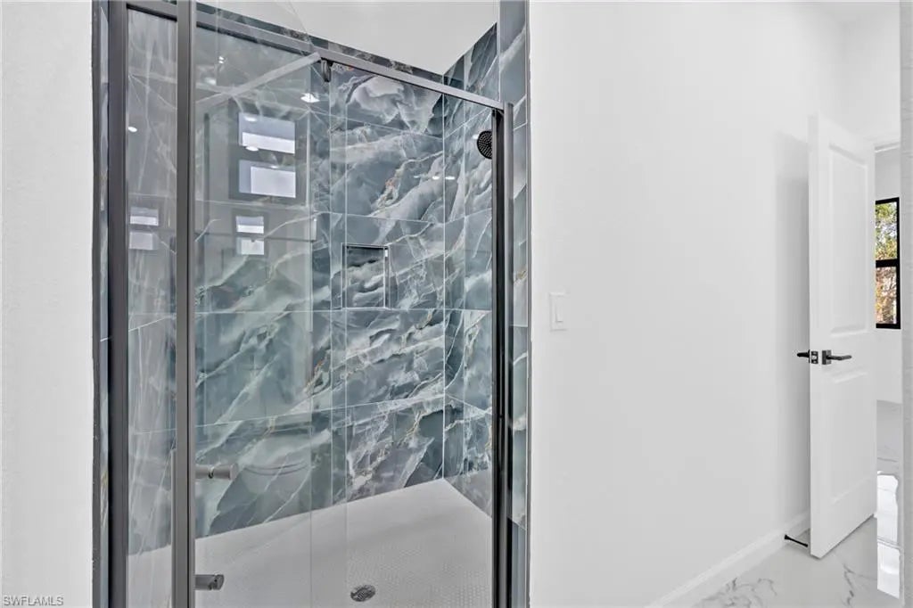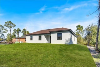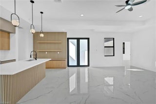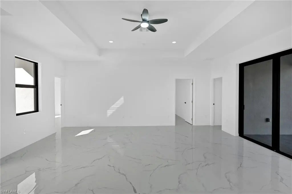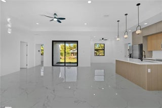 This modern new construction home blends clean architectural lines with a bright, open layout designed for comfort and functionality. Polished tile flooring, recessed lighting, and tray ceilings create a smooth flow throughout the main living areas. The kitchen anchors the space with a waterfall island, modern cabinetry, stainless steel appliances, and designer lighting, making it ideal for hosting or daily living. The primary suite serves as a private retreat with a well-appointed bathroom featuring dual sinks and a tiled walk-in shower. Spacious secondary bedrooms and a large backyard provide flexibility for a variety of lifestyles. Located in a developing Lehigh Acres area with easy access to major roads and local amenities.