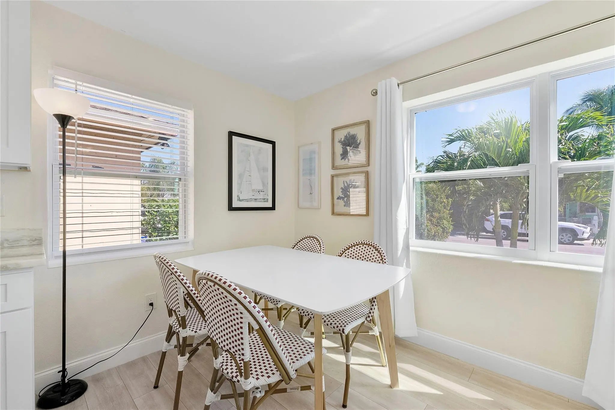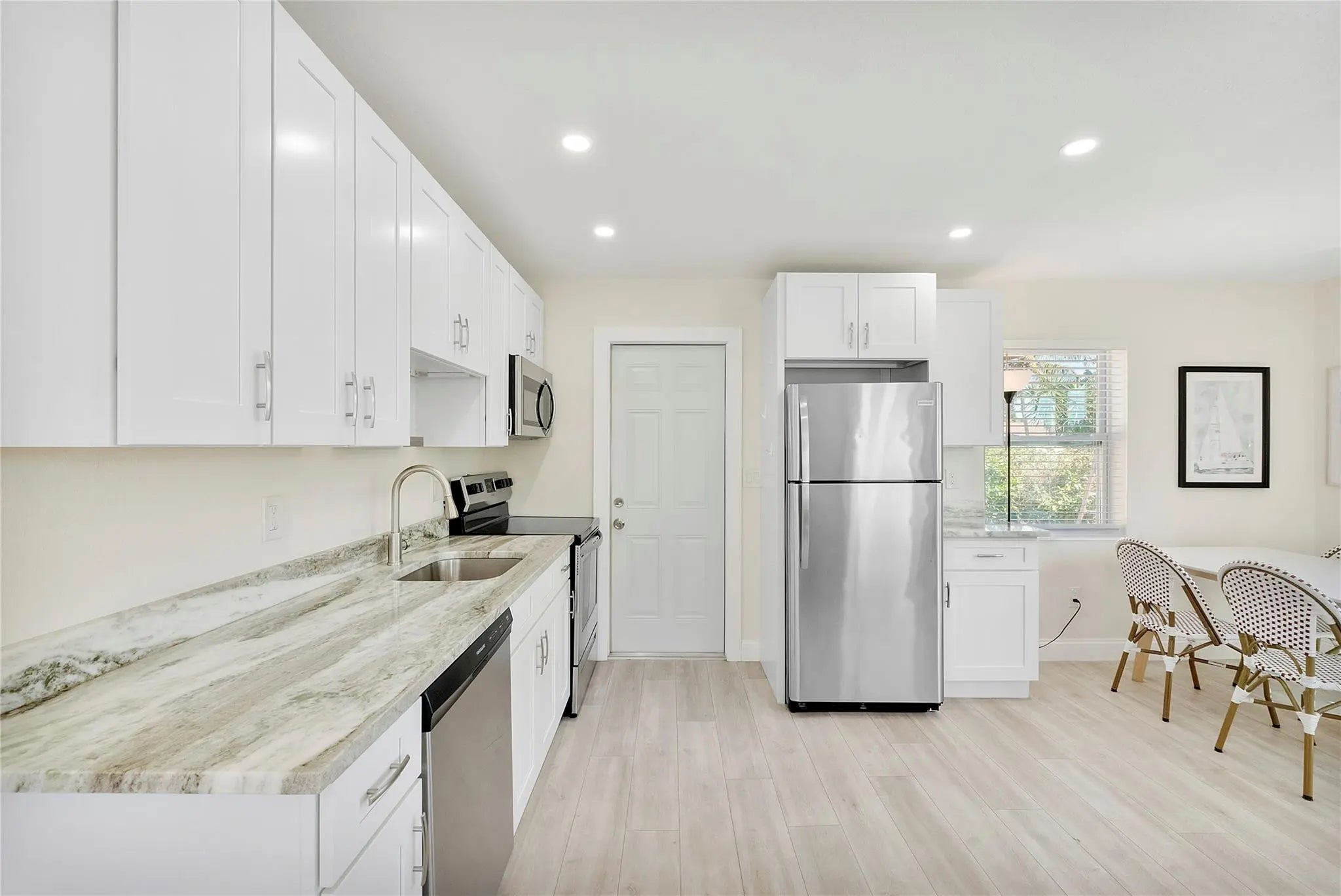 Delightful and thoughtfully updated 1-bedroom, 1-bath bungalow style home with approx 600 square feet of living space that's ideally located in the heart of Lake Worth, just minutes from the beach, dining, and vibrant local attractions. Completely furnished and fully renovated in 2022, offering peace of mind and modern comfort, including a new roof, complete electrical and plumbing systems, new A/C, new water heater, and a redesigned kitchen with shaker cabinetry with soft close drawers, quartz countertops, and stainless-steel appliances. Impact windows and doors have been installed throughout, along with new laminate flooring, interior doors, baseboards, and interior and exterior paint. Truly move-in ready and turnkey - perfectly suited for an Airbnb/ Rental or a snow bird's retreat!