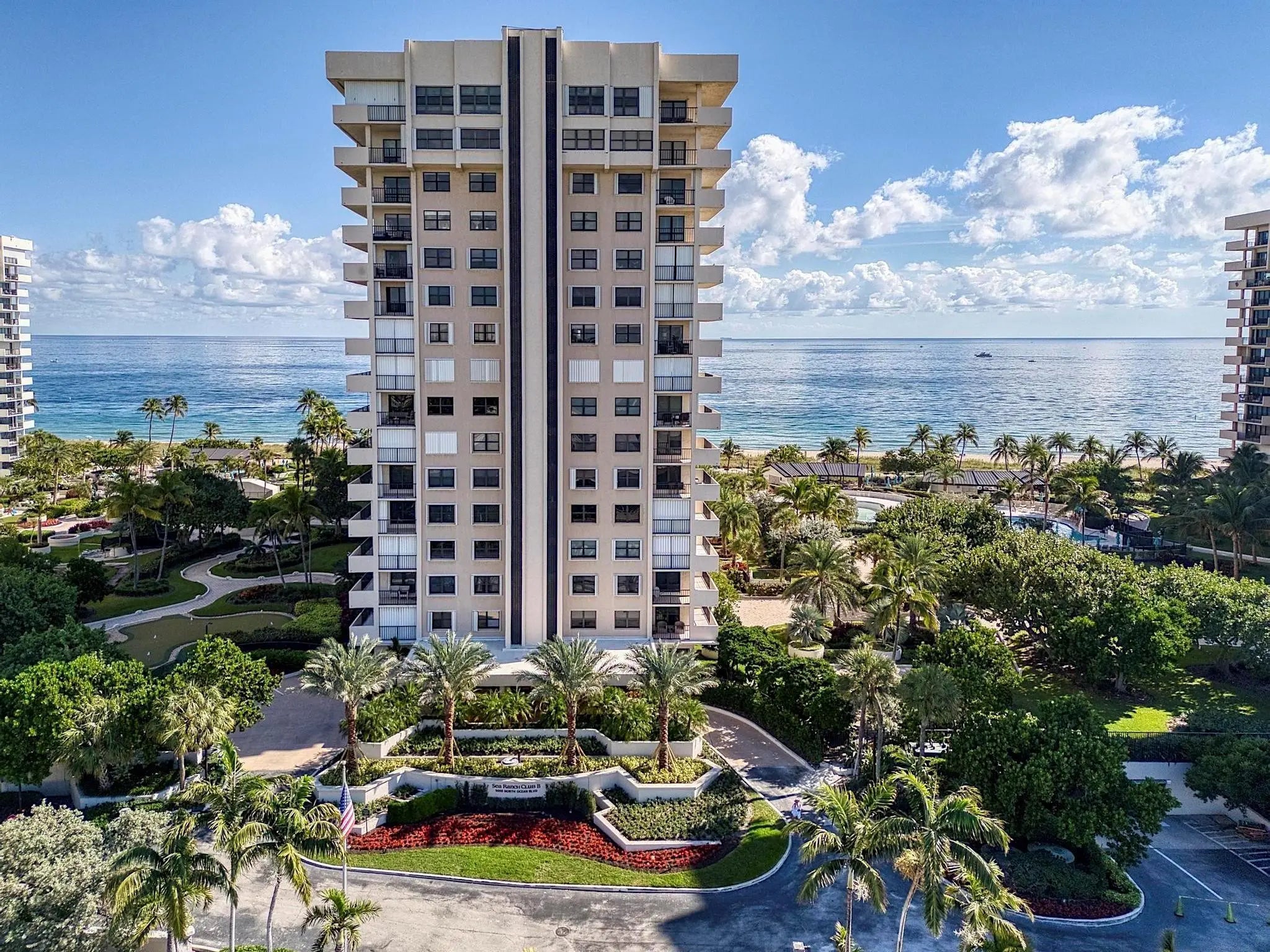 Experience breathtaking, unobstructed Ocean, Intracoastal, and City views from the expansive wraparound balcony of this spacious residence in the amenity-rich Sea Ranch Club. This 2-bedroom, 2-1/2 bath home features custom kitchen cabinetry, tile flooring throughout, floor-to-ceiling impact windows, a 2023 A/C and water heater, and in-unit laundry. This tropical, resort-style community sits directly on the sand and offers multiple heated pools, beachfront gazebos, outdoor kitchens with charcoal and propane BBQ grills, lounges and party rooms, tennis, pickleball, mini golf, sauna, fitness center, library, two dog parks, a snorkeling reef, car wash area, assigned covered parking, and more.