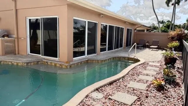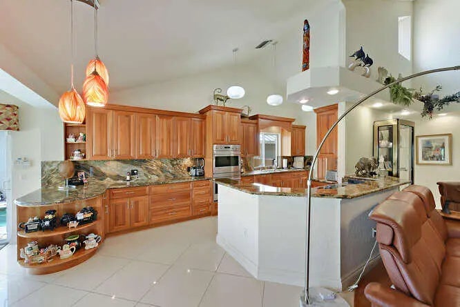 Totally renovated waterfront Bluffs home, 2 Bd, plus den/third bedroom, loft, enlarged kitchen open to living area, over 300 Sq.Ft. added to living space, Impact sliders and windows throughout. High quality wood cabinets, high end stainless steel appliances, beautiful granite counters. Florida room is air conditioned and part of main house, outside custom built Alfresca grill, heated pool & lighting all controlled by Jandy system. Custom interior lighting, solid 8' wood pocket doors throughout, huge pantry with built-in shelves, built-in wine cooler, built-in laundry hamper's, ietched glass front door. Electronic window treatments on all sliders. Maintenance free rear yard/tropical landscape with paver bricks on driveway, walkway and rear patio. Custom built-ins & air conditioned Garage