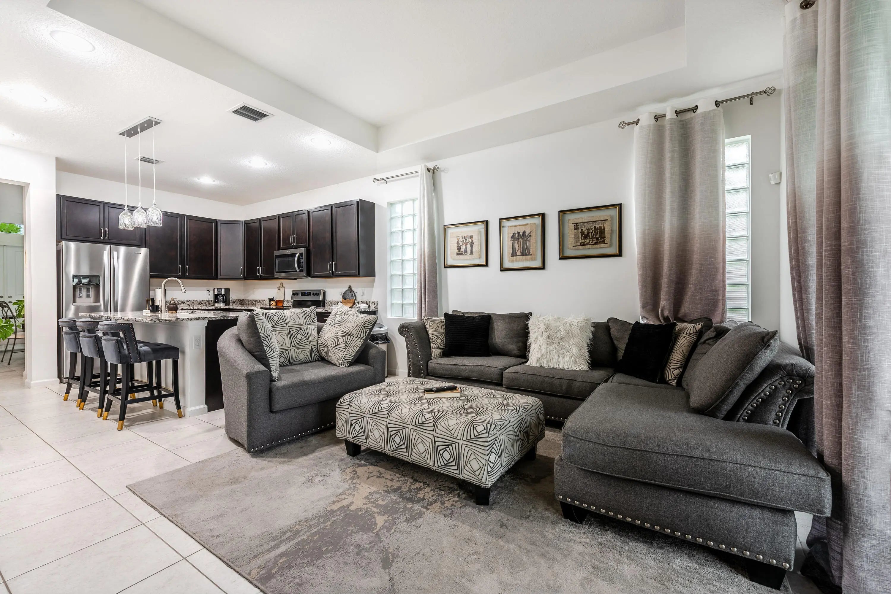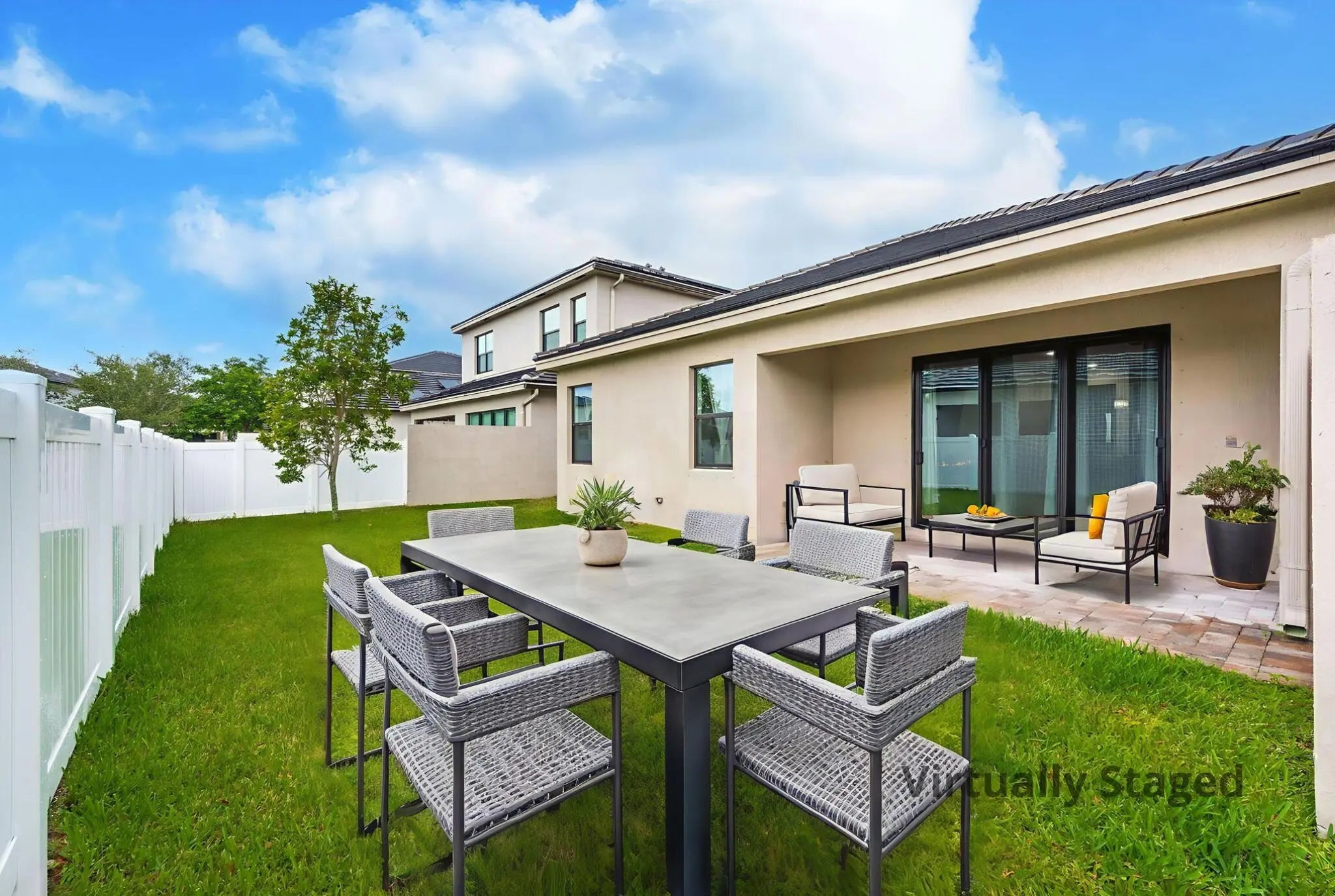This elegant 3-bedroom, 2-bath home with 2 car garage offers a perfect blend of comfort and function. Featuring ceramic tile in the living area, foyer, formal dining and a fully equipped kitchen with stainless steel appliances, and granite countertops and generous closets throughout. The spacious private patio is ideal for relaxing or entertaining outdoors. Greatly located in a quiet, well-maintained community with low HOA fees, a resort-style pool just a few steps from the house, Kids pool, playground, BBQ and social and green areas including a dog park, Up to 3 pets allowed, making it a rare find for pet lovers. A true move-in-ready gem with style and space in all the right places.