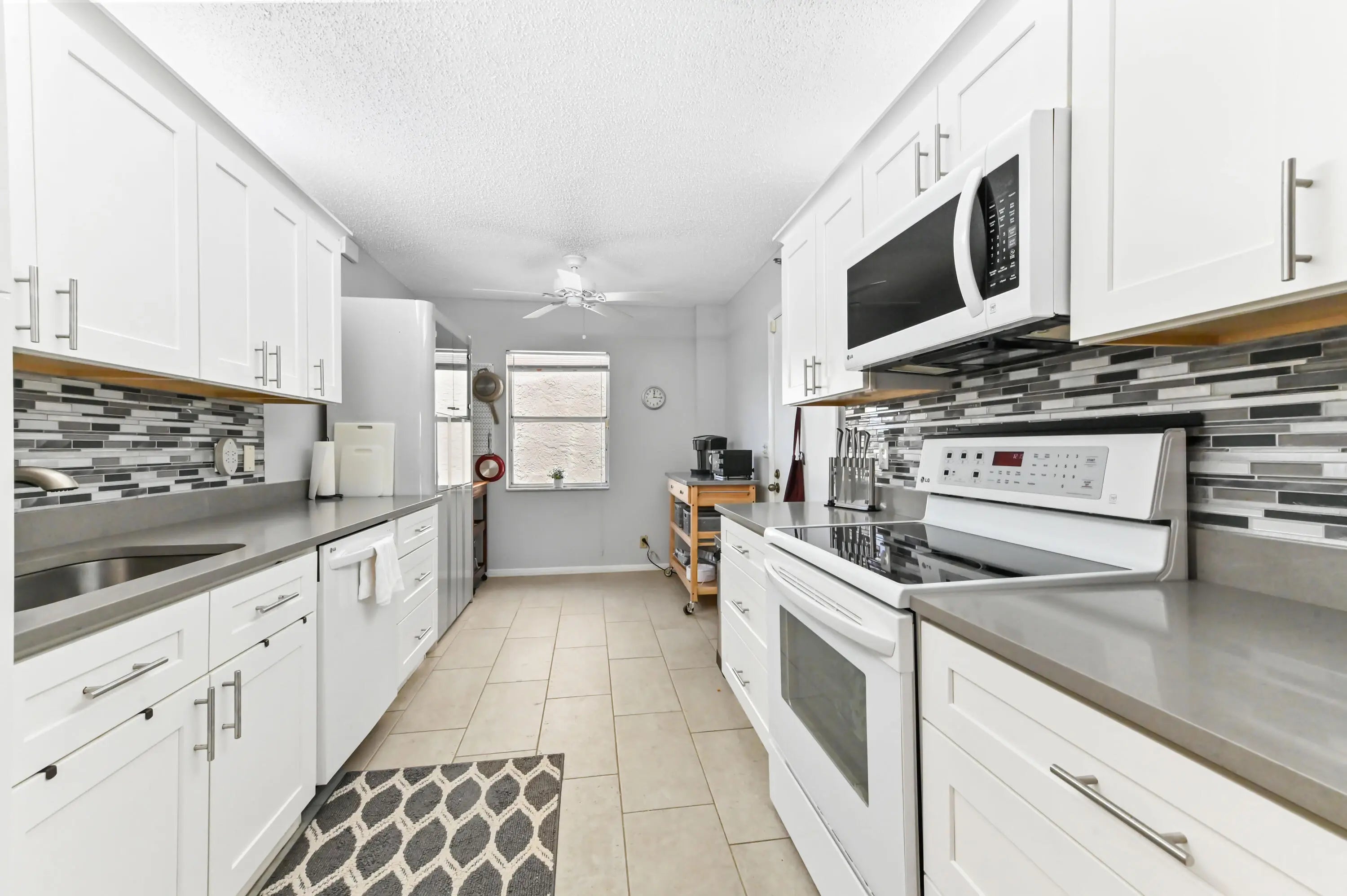 Welcome to Gramercy at Poinciana, a 55+ community offering a serene golf course and water views. This spacious 3-bedroom, 2-bath corner unit sits on the 3rd floor of a 4-story building and boasts approximately 2,000 sqft of comfortable living space. Enjoy peace of mind with accordion shutters and the convenience of a dedicated laundry area with washer and dryer. The beautifully remodeled kitchen features porcelain tile flooring, quartz countertops, glass backsplash, and quiet-close drawers, perfectly blending modern elegance and functionality. Property has a residential fire sprinkler system as well! Don't miss this rare opportunity to own a well-appointed corner unit in a vibrant, amenity-rich community.