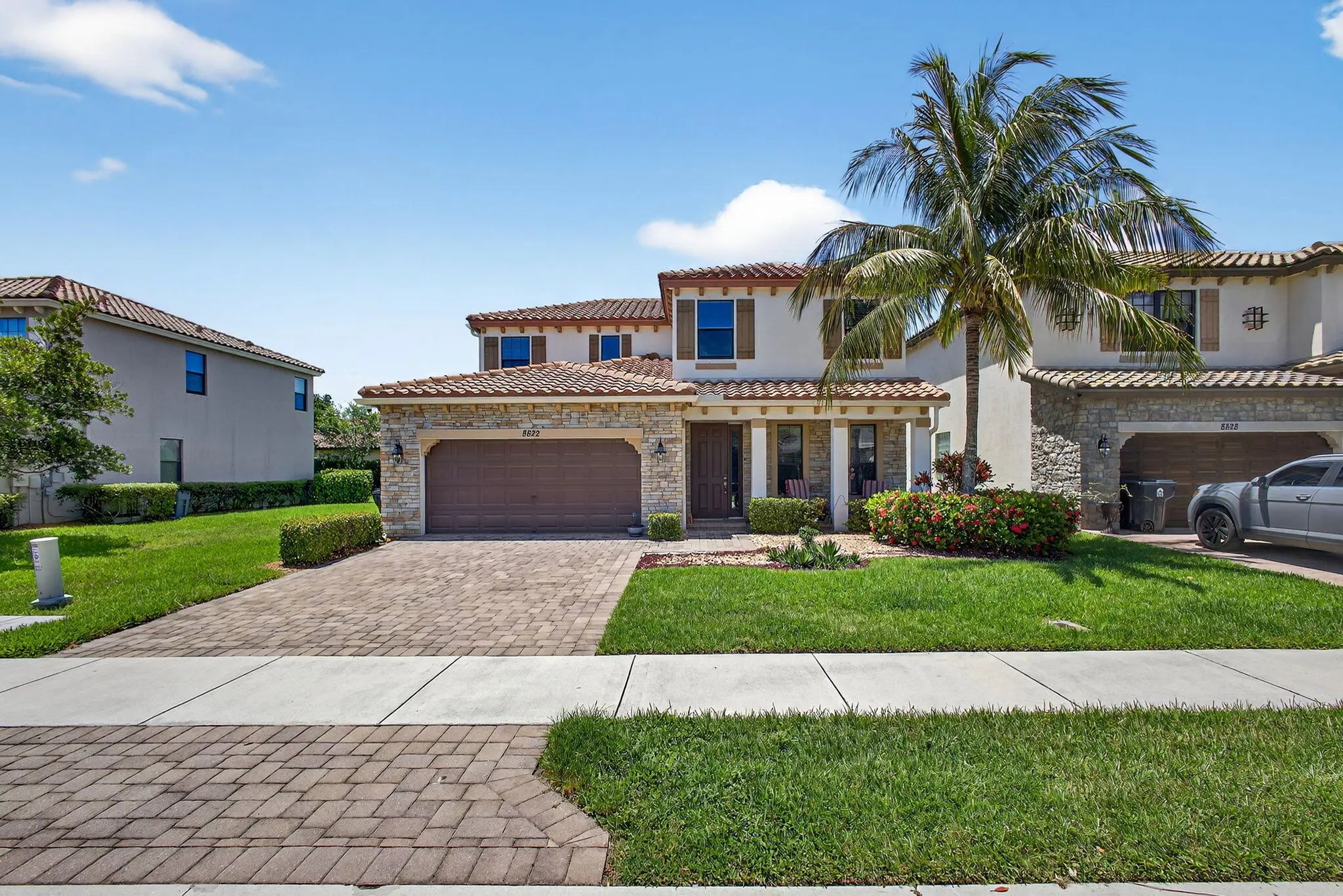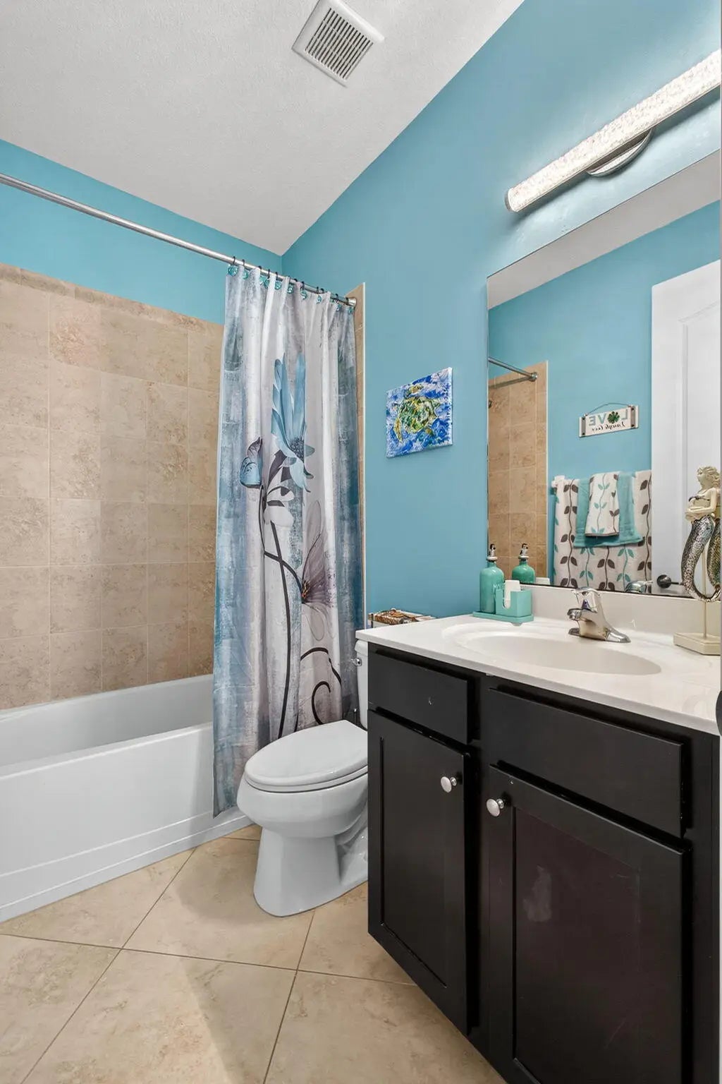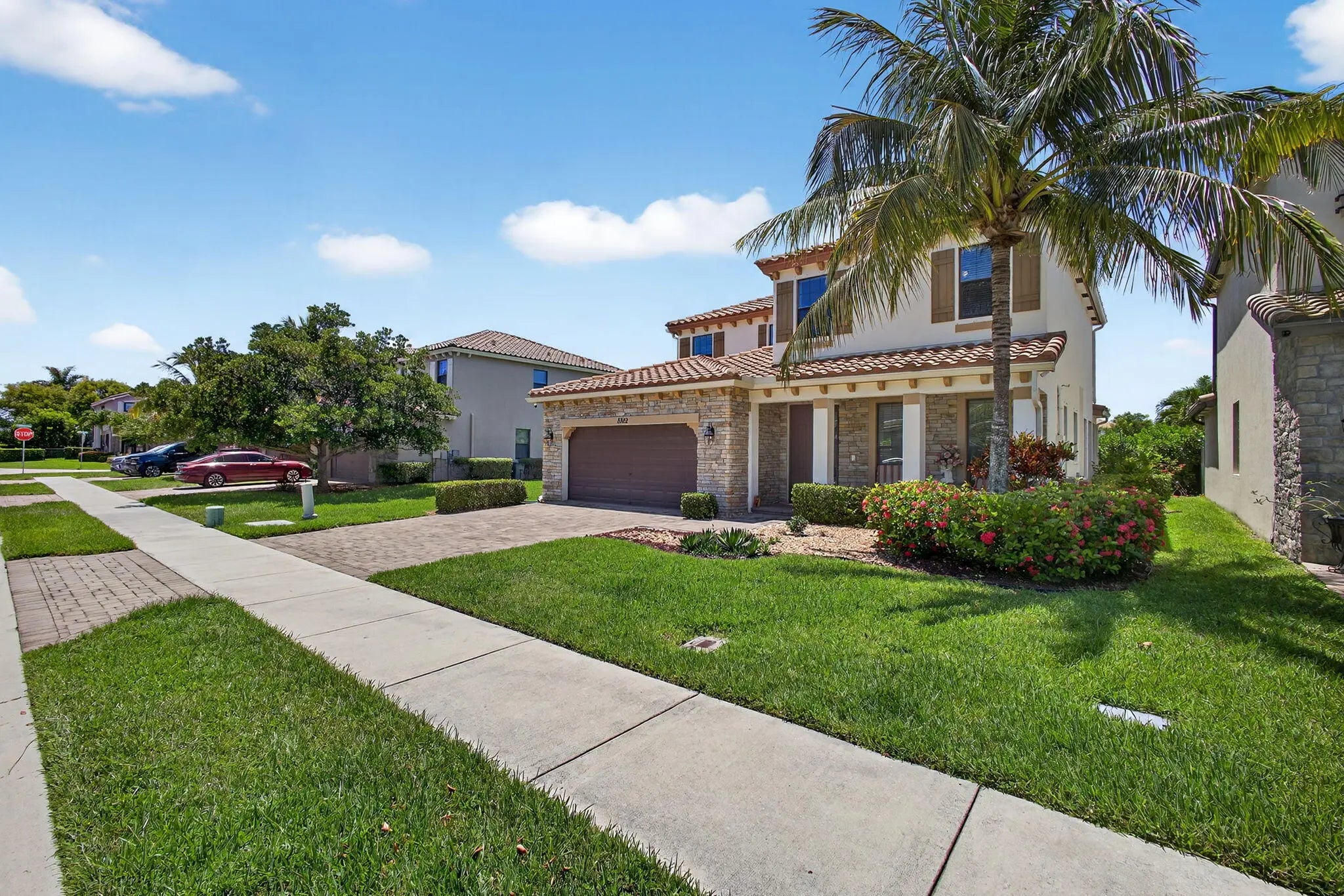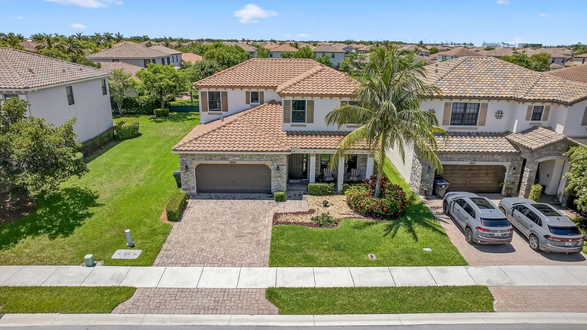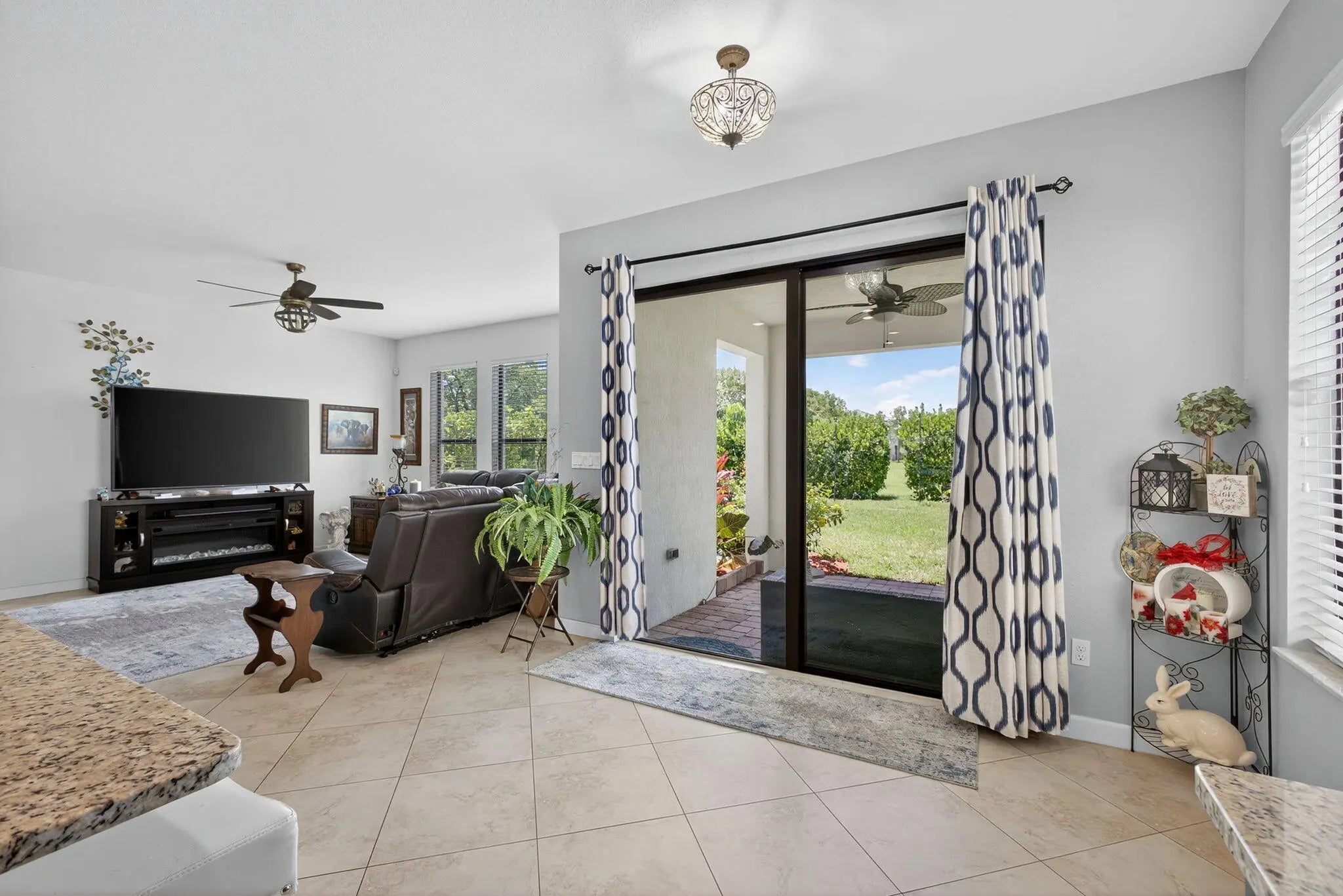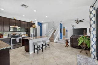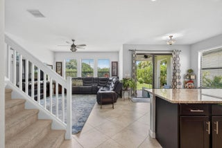 Spacious 4-bedroom, 3 full-bath, 2-car garage, home situated with lake views within a gated community. FIRST FLOOR; ALL tile, main-level room bedroom, foyer, flex space, laundry room, dining room, kitchen, breakfast area adjoined with family room. KITCHEN FEATURES; center island with storage and additional seating, SS appliances, GRANITE countertops, full granite backsplash, 42" cabinets, pantry, SS sink. SECOND FLOOR: ALL carpet, open overlook to the main floor creating a light-filled floor plan, guest bathroom w/ dual sinks and soaking tub, hallway linen closets, PRIMARY suite offers walk-in closet, oversized primary bathroom w/ linen closet, dual vanities, soaking tub, walk-in shower w/ glass enclosure and separate water closet. ADDITIONAL FEATURES: covered entry and back patio, volume ceilings, recessed lighting, private back yard with mature hedges & water views. BONUS: easement along the property line creates additional separation between neighboring property to the East enhancing spacing and privacy. ROOF(2016) Complete panel SHUTTERS. HOA includes landscaping, irrigation maintenance, unmanned gate, pool/spa and playground. Centrally located with easy access to the Turnpike, I95, shopping, dinning and equestrian activities.