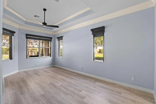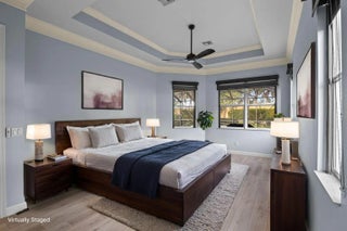 Located on one of the largest lots in The Lakes at PGA Village, this 3BR/2BA CBS pool home offers over 2100 SqFt of open living with upgrades throughout. The kitchen features soft-close cabinets, granite counters, stainless appliances, wine cooler, and dry bar. Enjoy a spacious primary suite with dual vanities, soaking tub, and walk-in shower. Outside, a screened lanai with covered patio surrounds a large pool and spa, perfect for relaxing or entertaining. Enjoy access to community amenities including tennis, clubhouse, fitness center, and more. Conveniently located near I-95, Clover Park, Tradition, dining, golf, and shopping.