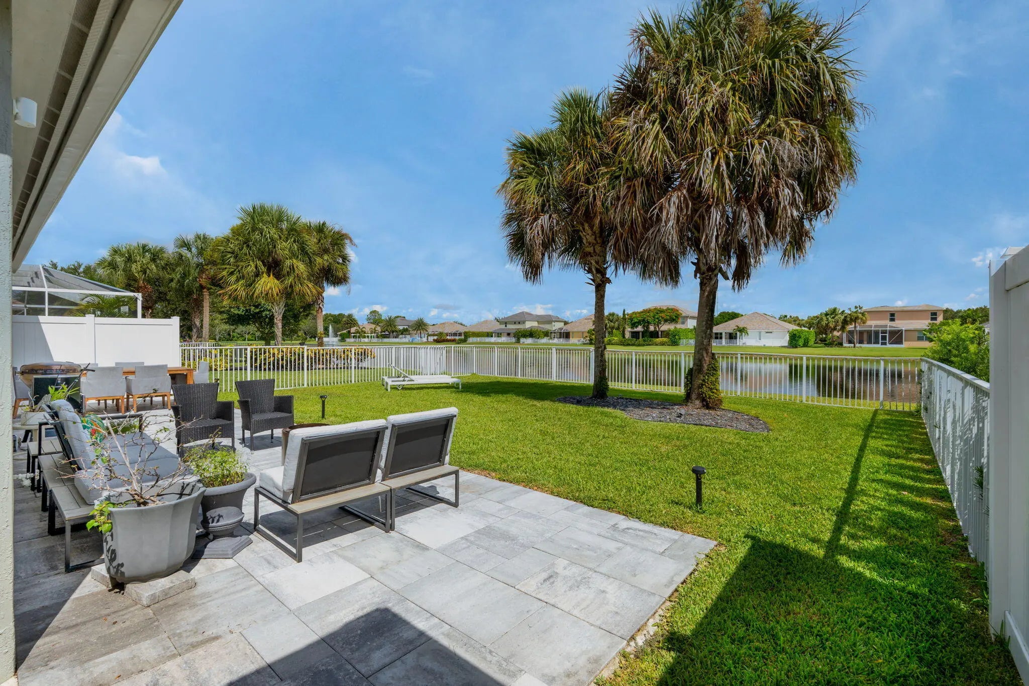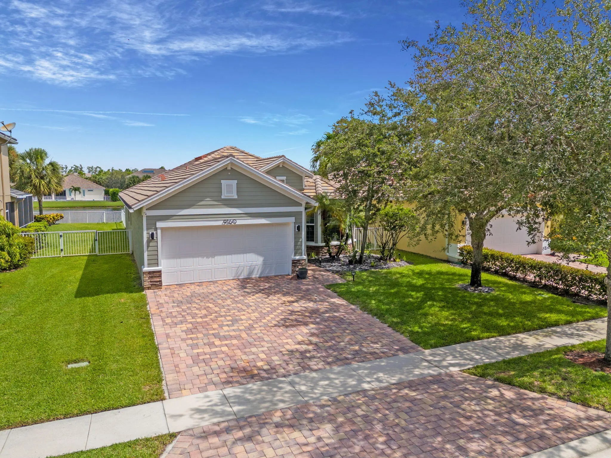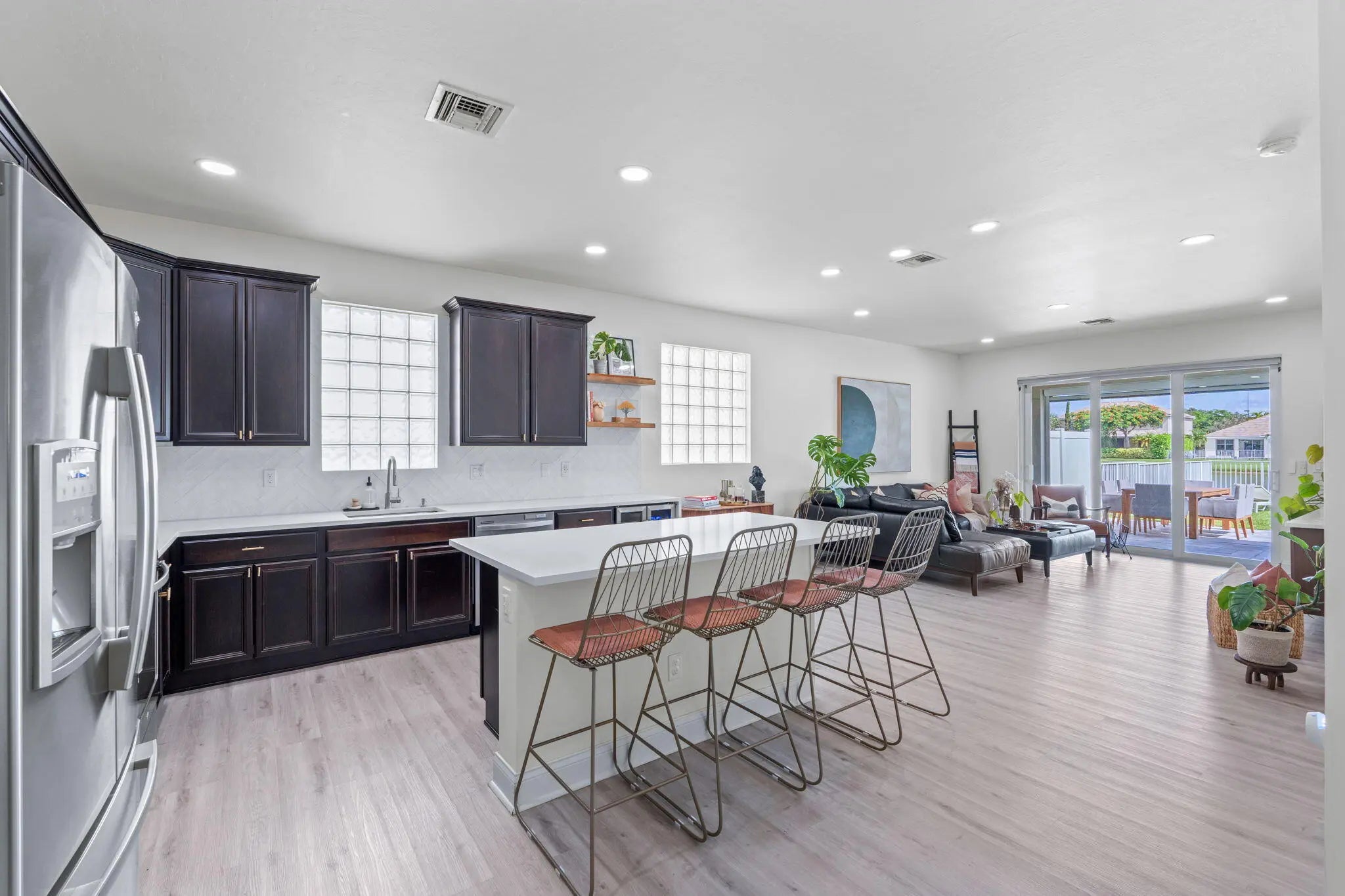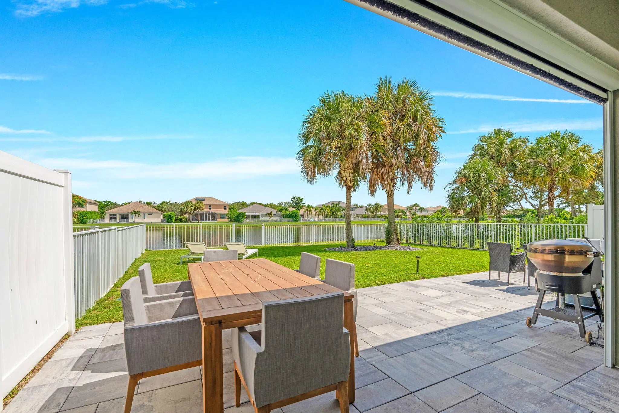 Crisp curb appeal welcomes you to this single-story home with 2-car garage on a quiet street in gated Oak Haven. Inside, light wood-look floors and recessed lighting carry through an open concept great room. The renovated kitchen features an XL waterfall island, sleek white quartz counters, dark shaker cabinetry with brass hardware, stainless appliances, and a built-in wet bar. A wall of sliders opens to an oversized, entertainer's patio and motorized covered lanai overlooking the lake—ideal for outdoor dining and play. Work from home is easy with a dedicated office nook lined with floating shelves. The spacious primary suite adds a spa bath with soaking tub, glass-enclosed shower, and double vanity storage. Additional bedrooms include a serene guest room with a stylish accent wall. Laundry, abundant closets, and modern fixtures complete the turnkey feel. This boutique neighborhood of single-family homes, gated entry, one-mile walking/jogging path with workout stations, two playgrounds, set between Wellington and Boynton Beach for quick shopping and dining experience.