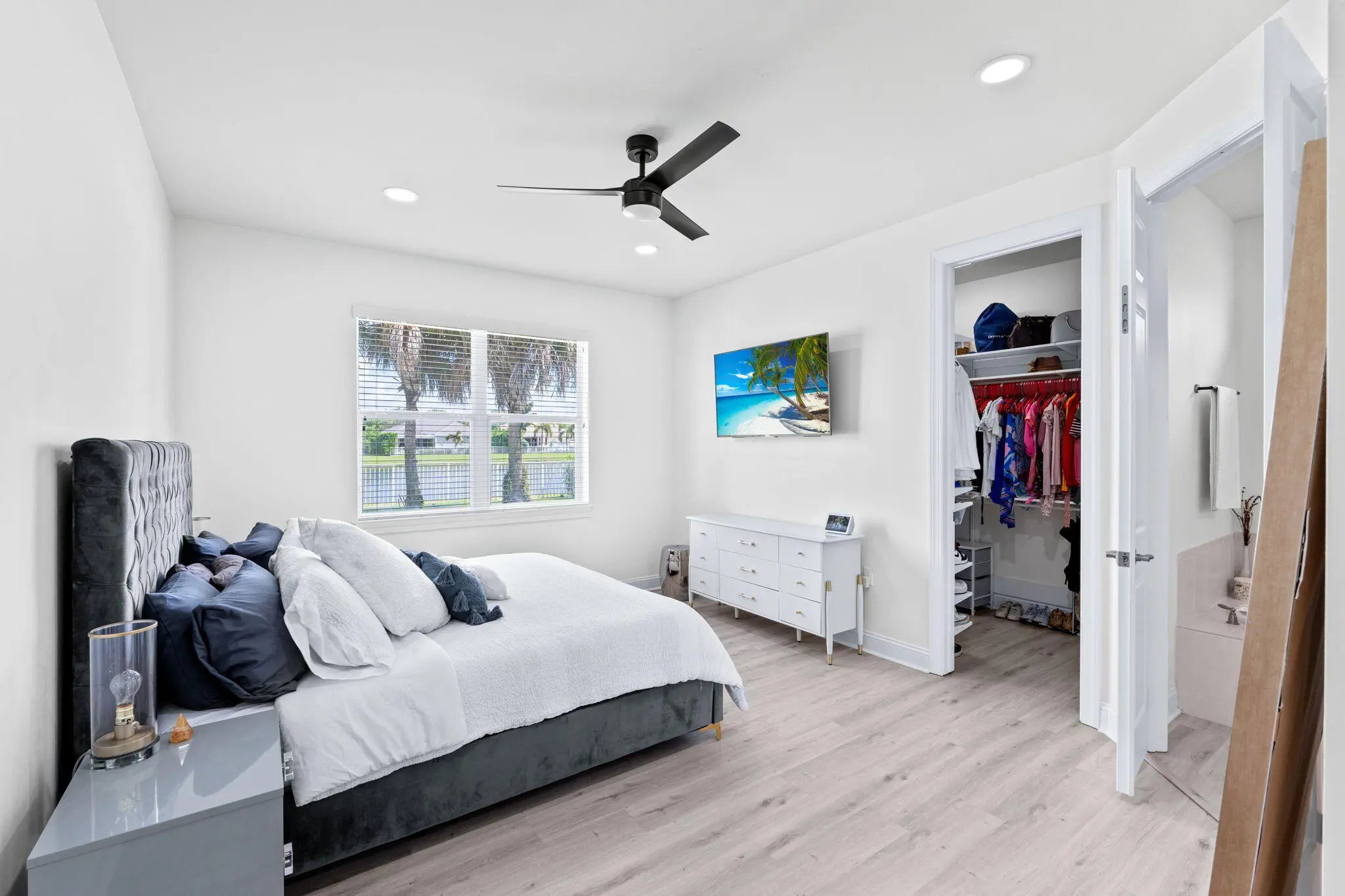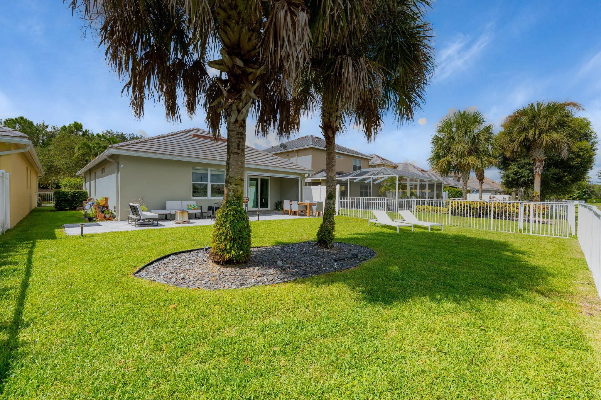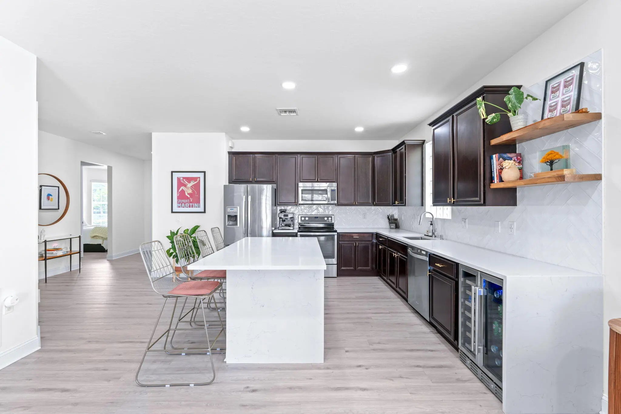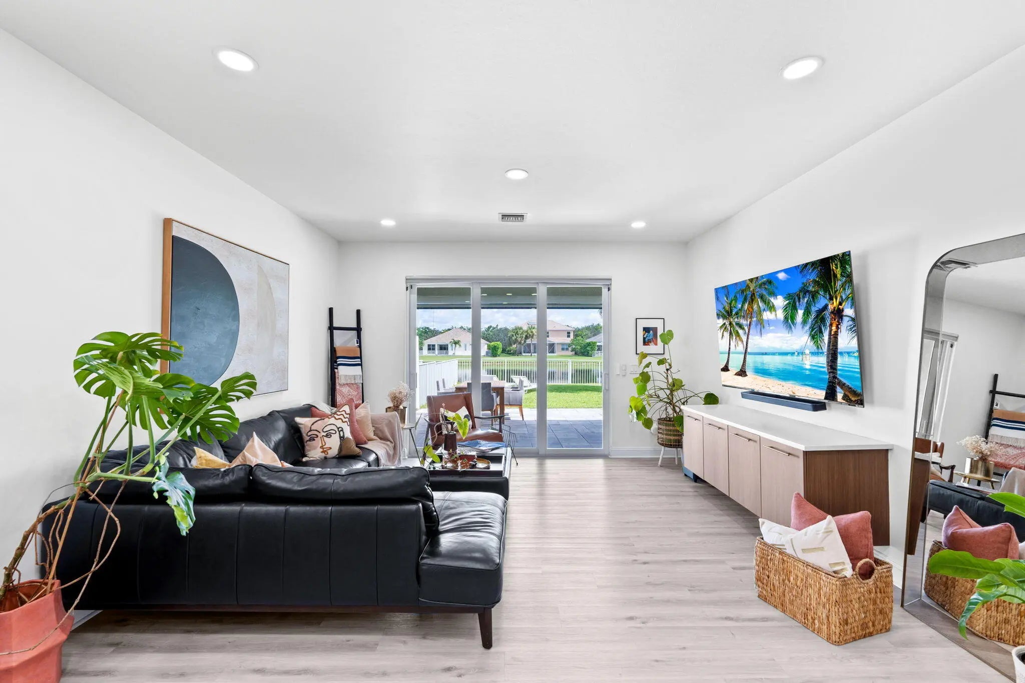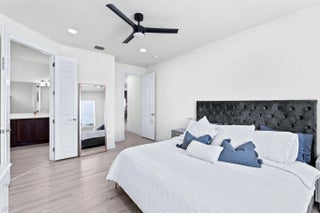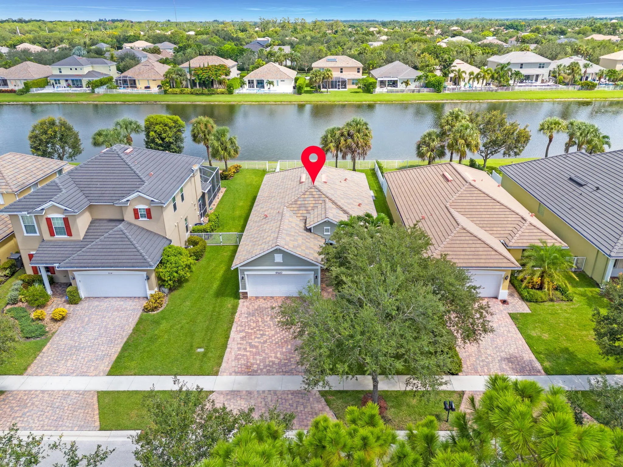 Crisp curb appeal welcomes you to this single-story home with 2-car garage on a quiet street in gated Oak Haven. Inside, light wood-look floors and recessed lighting carry through an open concept great room. The renovated kitchen features an XL waterfall island, sleek white quartz counters, dark shaker cabinetry with brass hardware, stainless appliances, and a built-in wet bar. A wall of sliders opens to an oversized, entertainer's patio and motorized covered lanai overlooking the lake—ideal for outdoor dining and play. Work from home is easy with a dedicated office nook lined with floating shelves. The spacious primary suite adds a spa bath with soaking tub, glass-enclosed shower, and double vanity storage. Additional bedrooms include a serene guest room with a stylish accent wall. Laundry, abundant closets, and modern fixtures complete the turnkey feel. This boutique neighborhood of single-family homes, gated entry, one-mile walking/jogging path with workout stations, two playgrounds, set between Wellington and Boynton Beach for quick shopping and dining experience.
