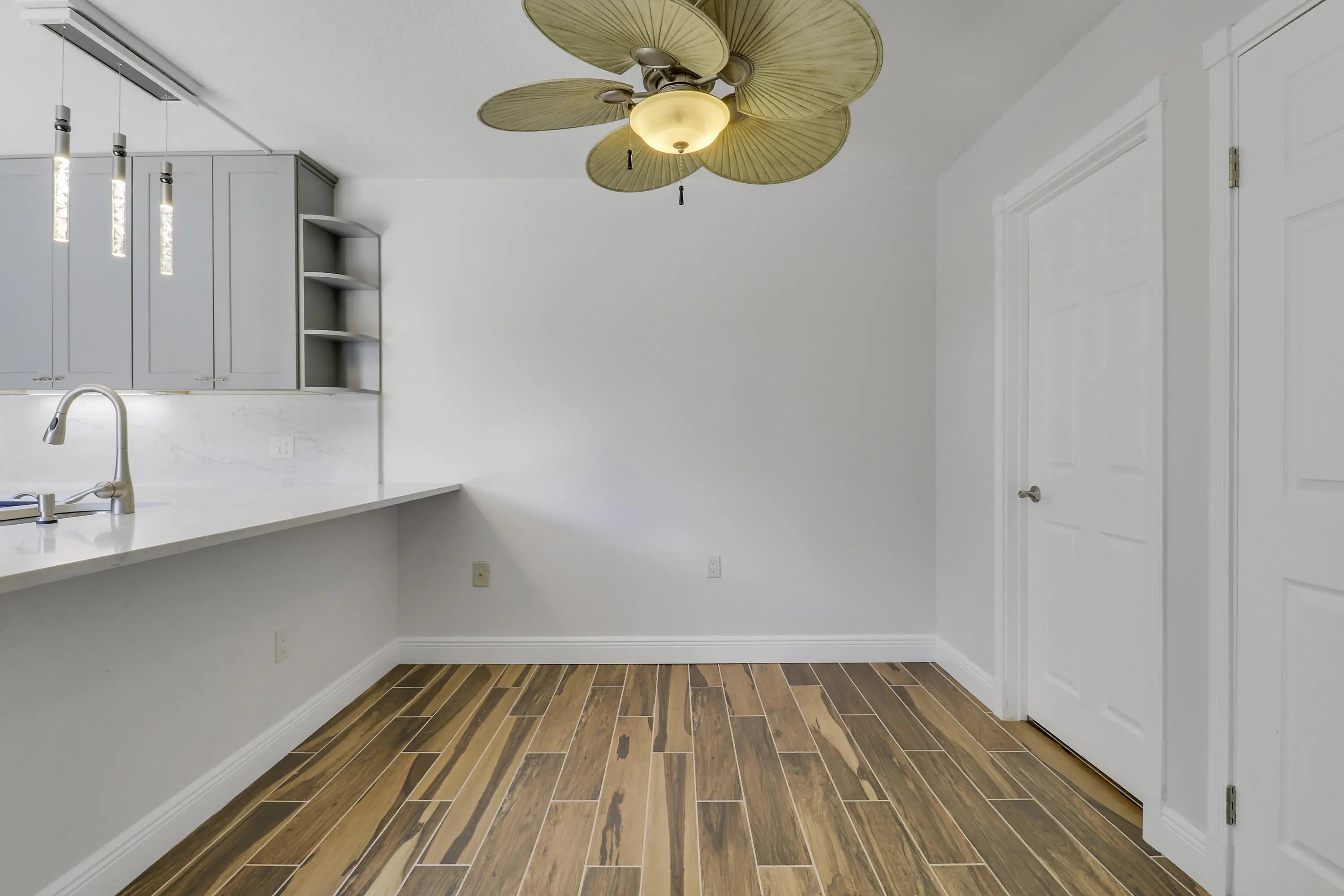 Discover your dream coastal retreat just minutes from Marcinski Beach and the Pier. This beautifully updated home features two spacious primary bedrooms and two and a half bathrooms. The newly renovated kitchen boasts stunning blue lower cabinets, elegant gray uppers, and quartz countertops, complemented by a state-of-the-art stainless steel appliance package with an oven air fryer. Enjoy the exquisite Brazilian pecan porcelain tile floors throughout, with cozy Berber carpet on the stairs. Modern conveniences include hurricane impact glass sliders, a hurricane-resistant front door, and a new washer/dryer. The private fenced patio with SunDek flooring offers a serene space, perfect for relaxation, complete with a shed for extra storage. The knockdown ceiling, lighting and paint scheme add a touch of comfy sophistication. Ideal for morning beach walks or moonlit evenings, this home is a true paradise. Experience the perfect blend of style, comfort, and location.
