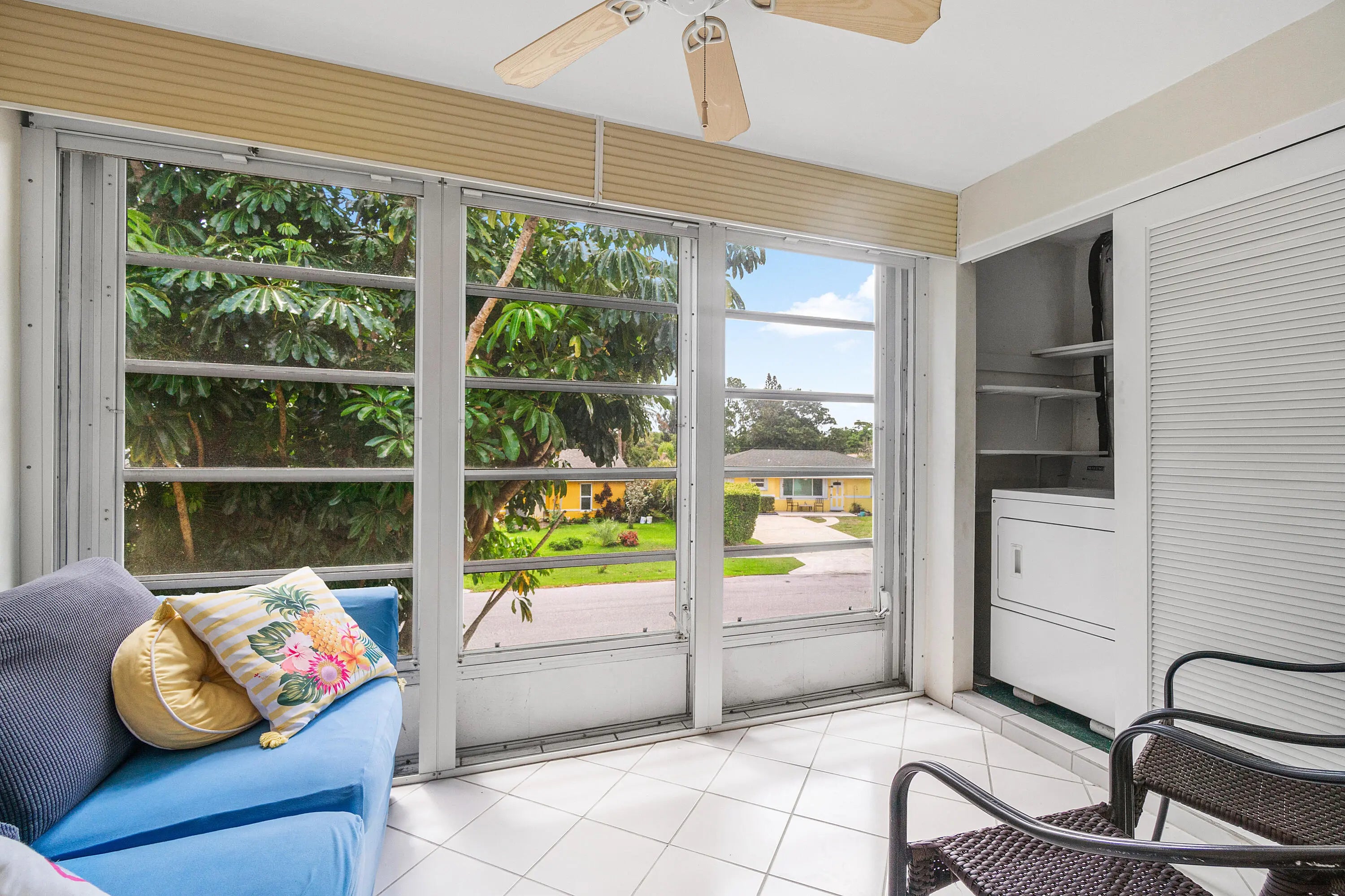 Back on the Market! Village Royale - Your Carefree Coastal Lifestyle Awaits! Live the Florida dream in a vibrant and active 55+ community within waking distance to a beautiful marina. This beautifully maintained corner end unit offers extra privacy and natural light, along with a spacious screened-in sunroom perfect for relaxing with your morning coffee or enjoying the evening breeze. Inside, you'll love the updated kitchen with a brand-new disposal, plus recent upgrades including a new air conditioning system and hot water tank and water valves 4/2025. The convenience of a washer and dryer right in the unit. Park right outside your door! Village Royale offers resort-style amenities including swimming pool, fitness center, clubhouse, walking paths and an active calendar of social events