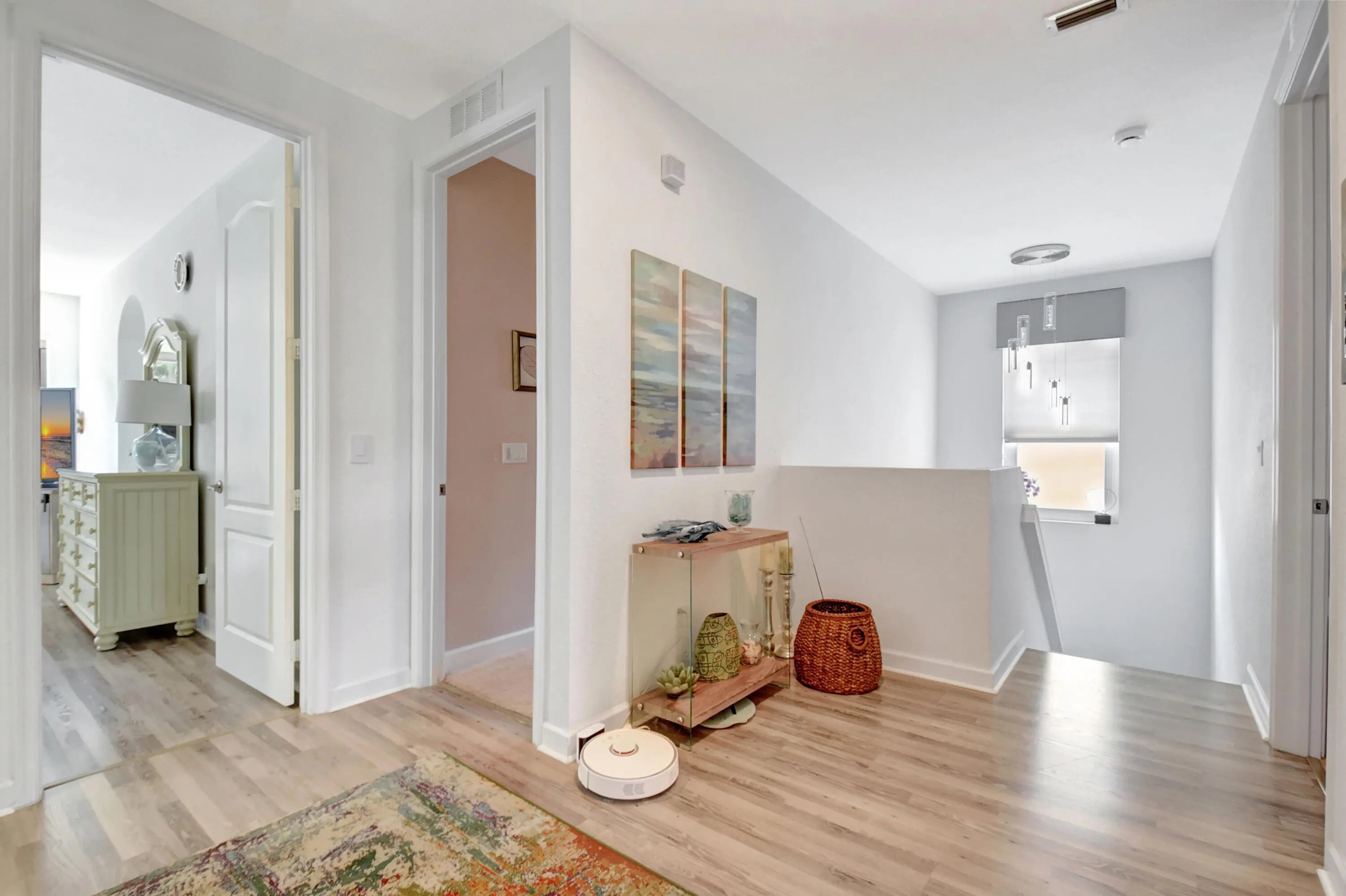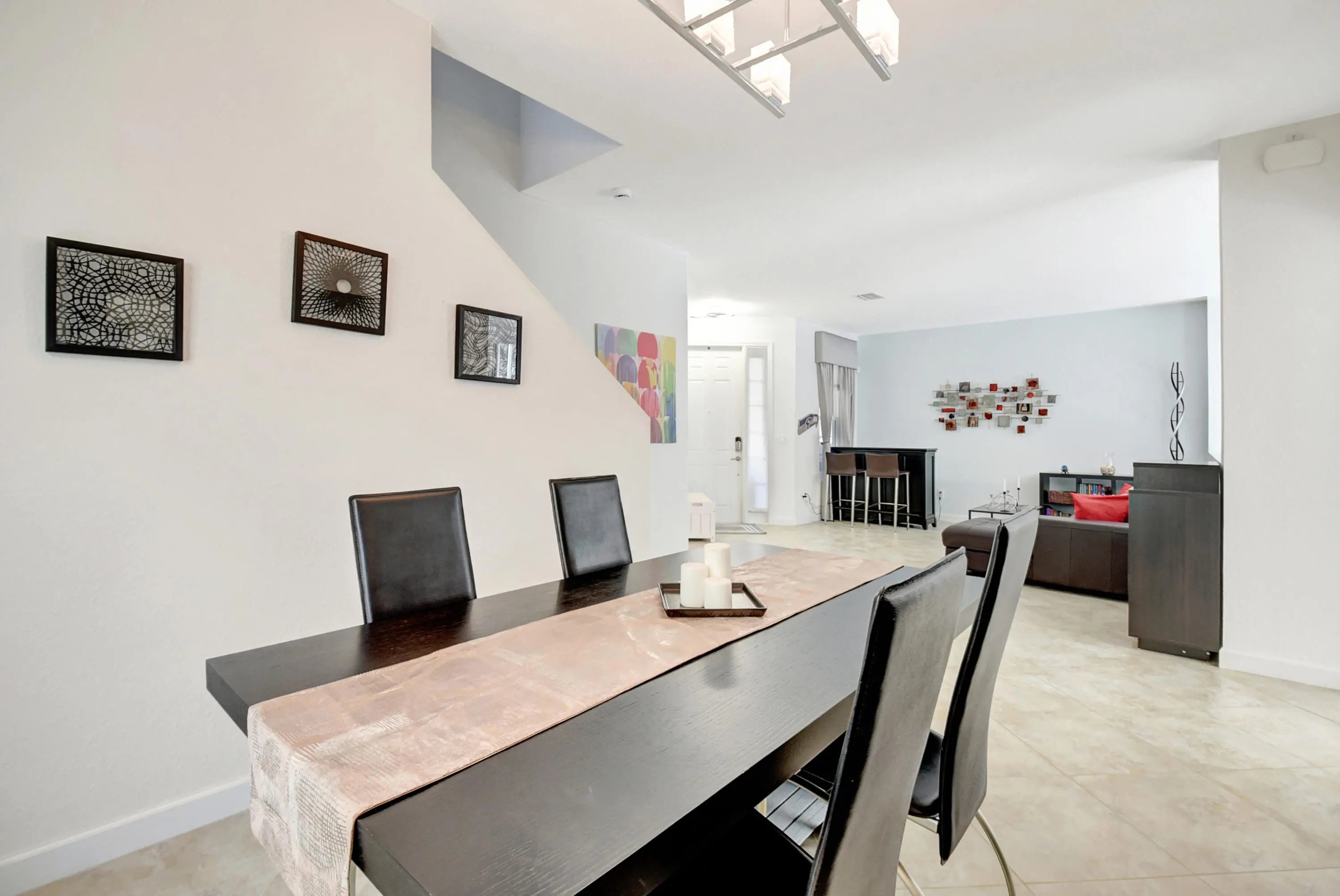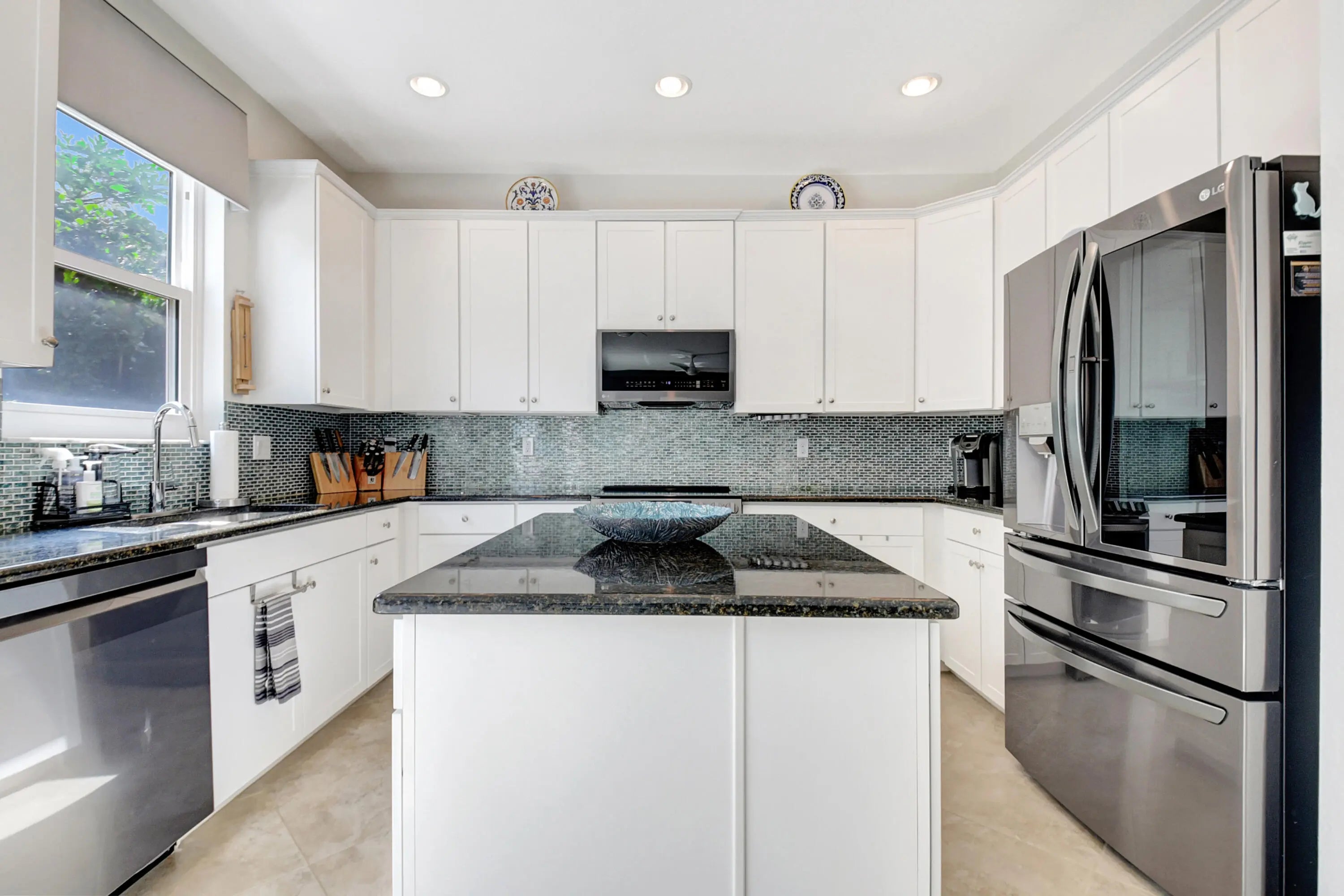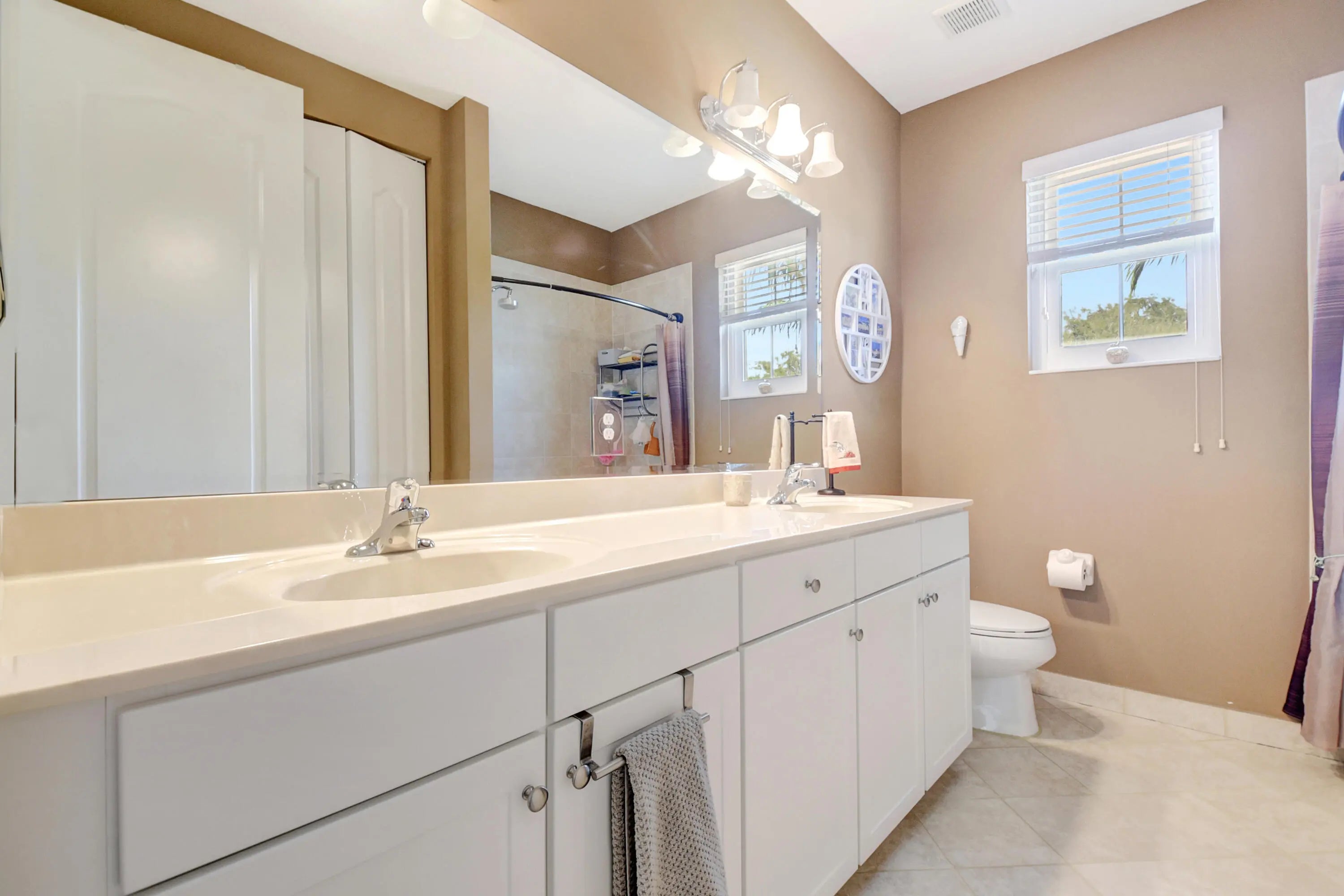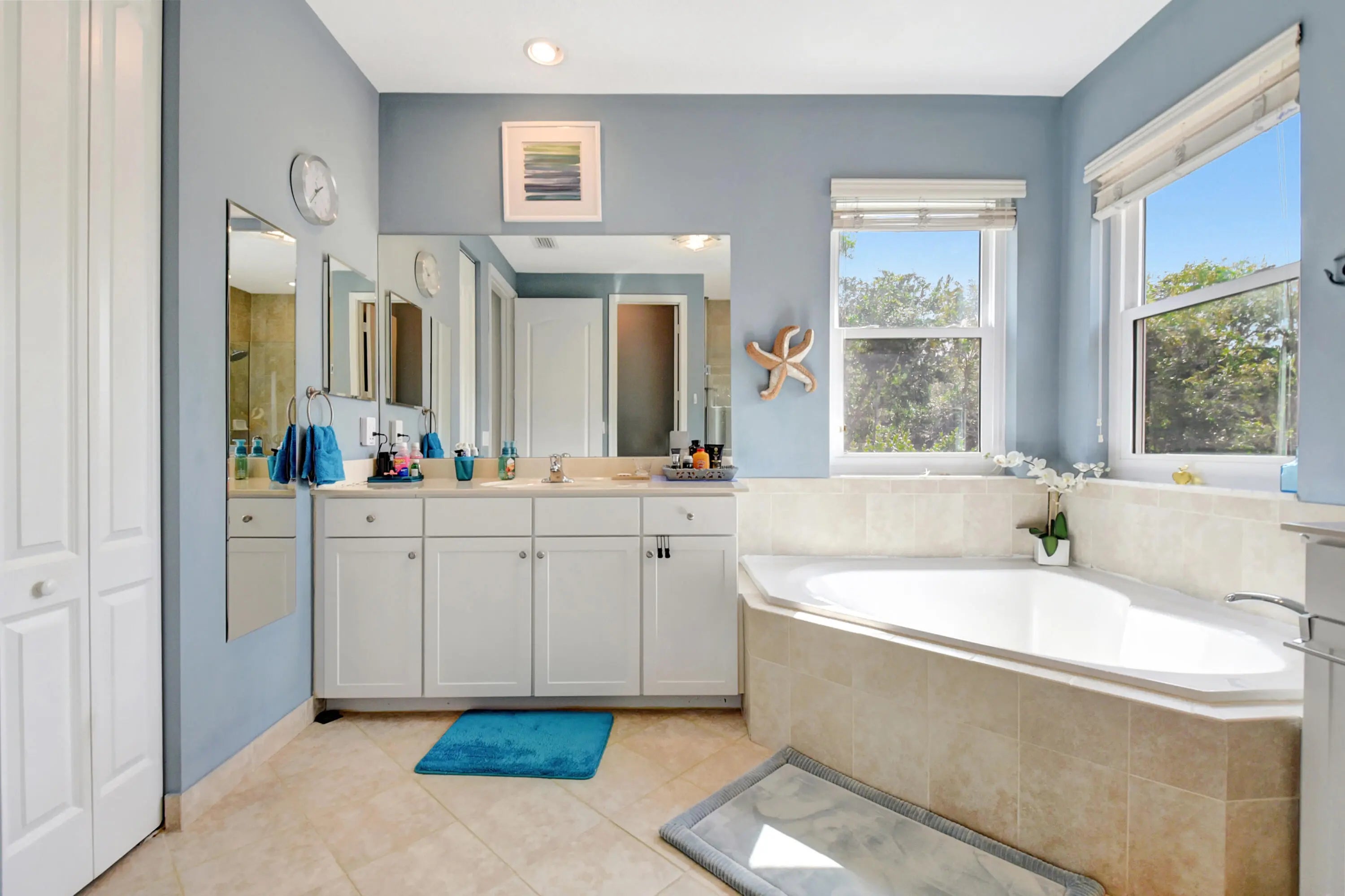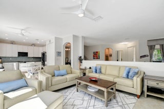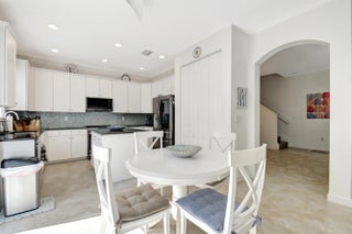 Step into a luminous two-story residence nestled in a gated community. The first floor features formal living and dining rooms, a bright, open family area, a modern kitchen, and a guest bedroom with full bath. Upstairs, four spacious bedrooms and a laundry room await. The primary suite offers dual walk-in closets, dual sinks, a Roman tub and separate shower. Outside, enjoy a private tropical garden setting with mature fruit trees and green foliage, all under a canopy of natural light.
